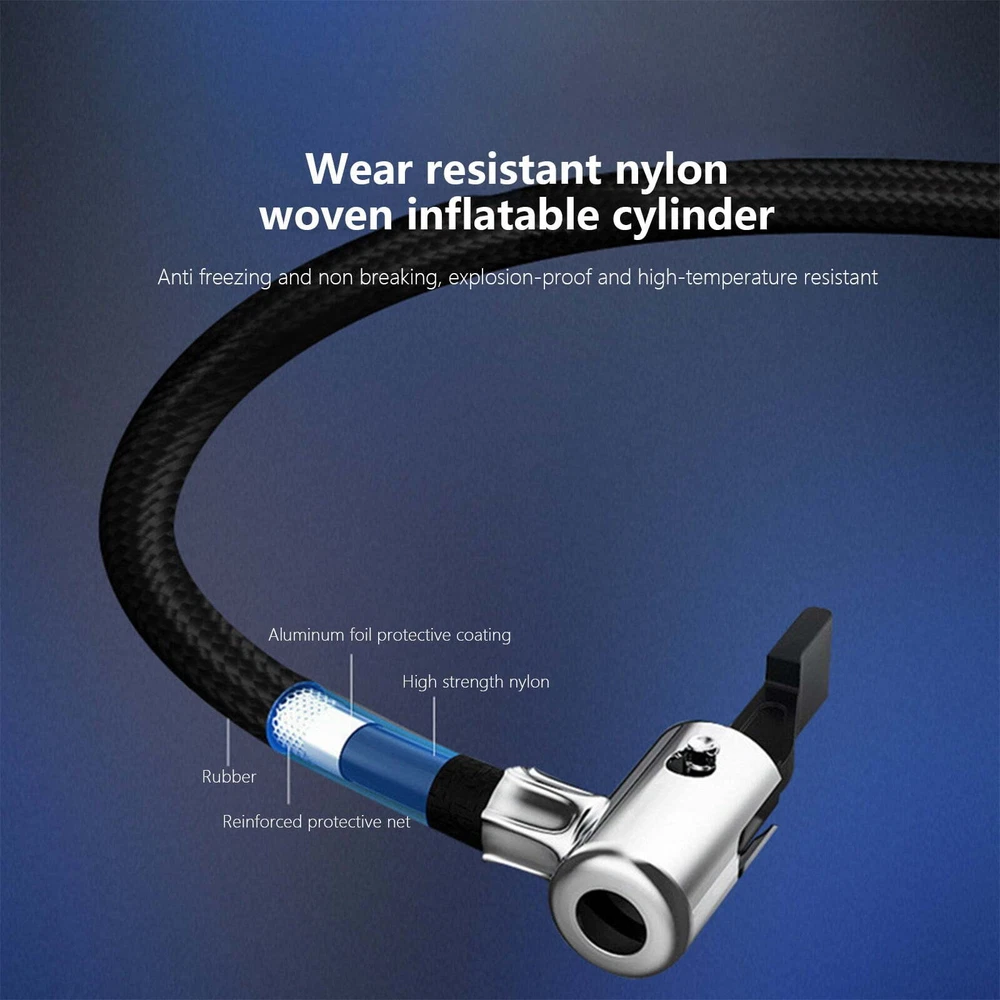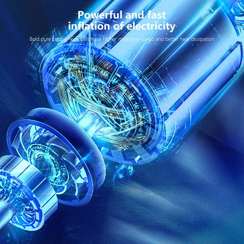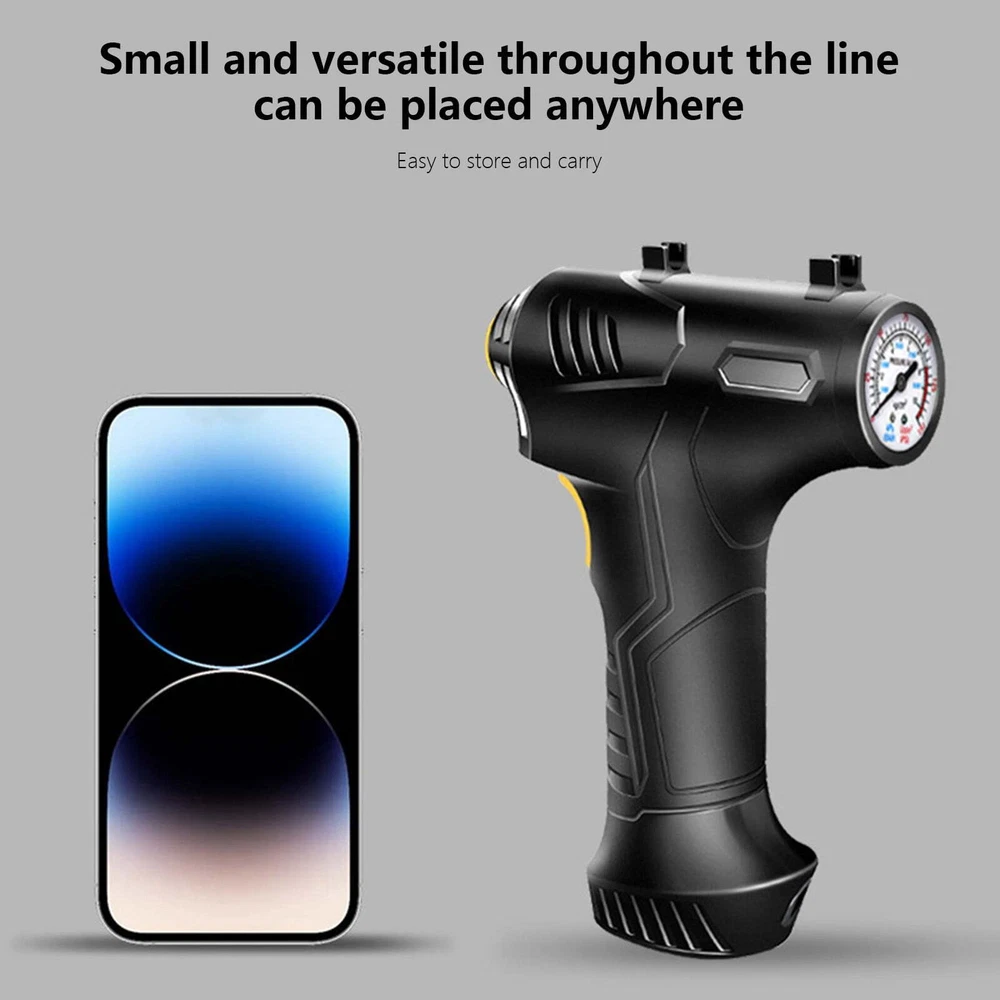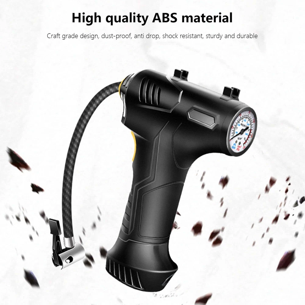 Portable Air Compressor Quick Rechargeable Battery 3 Nozzles Cars Motorcycles Features: ADVANCED ACCURACY: This tire inflator is made of good material, it can inflate car tires up to 25 liters per minute, and it can inflate 195/55/R15 car tires from 0psi to 35psi in 10 minutes.Please note that after 10~15 minutes of continuous use, please allow the tire inflator to cool down before continuing to use it. METAL CYLINDER: The inflator pump is designed with metal cylinder and equipped with permanent magnet motor, which can fully guarantee the quality and performance during use. EXTRA LONG POWER CORD: Powered by car lighter, equipped with 9.8 feet long power cord, it can inflate any tires in your car.1.64 feet inflatable hose is enough for daily use. PRODUCT HIGHLIGHTS: Handle style design, easy to grip. Compact size makes it easy to carry. Features an integrated LED flashlight for emergency use. Wide range of applications: Includes 3 nozzles . Inflates any tire on cars, SUVs, motorcycles and bicycles; included accessories allow for quick balls, cushions, balloons and mattresses. Note: This pump is not suitable for high pressure or high volume applications such as swimming pools and inflatable canoes. Product Description: Color: Black Gross Weight: 498g/1.10lb Product Size: 20.5*14.2*5.4cm/8.07*5.59*2.13in Package size: 21.8*17.2*6.2cm/8.58*6.77*2.44in Product Contains: 1x Tire Inflator 3x inflator nozzle LCD screen: There is a power display, preset the value you want, and the air compressor will automatically shut down when the value is reached. The backlit LCD display will show the desired tire pressure value and the current tire pressure. Portable Design: This portable tire compressor takes up very little space. Even small vehicles do not take up space in the car. Design of Led Lights: Bright LEDs allow you to get work done even in the dark, allowing you to easily deal with various emergencies. Scope of Application: The maximum inflation pressure is 150Psi, it is suitable for all kinds of inflatable toys, balls, and also suitable for bicycles, motorcycles and small and medium-sized cars (including SUVs). Package Contents: 1*12V Air Inflator; 3 * Different Nozzles.
