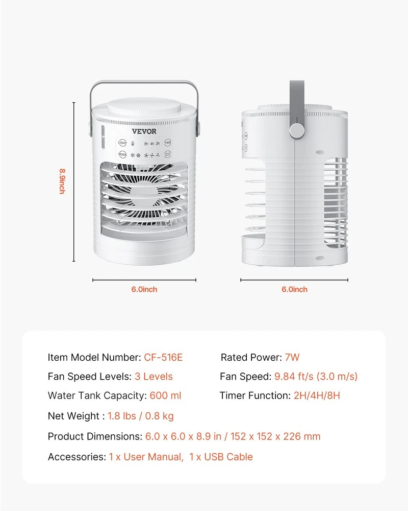 ●【Product Information】All-in-One Mini AC UnitFlexible Cooling ModesUltrasonic Mist MagicTimed Cooling & Vivid ColorsGo-Anywhere CoolingMultiple Power OptionsFan Speed Levels: 3 LevelsWater Tank Capacity: 600 mlItem Model Number: CF-516ERated Power: 7WFan Speed: 9.84 ft/s (3.0 m/s)Product Dimensions: 6.0 x 6.0 x 8.9 in / 152 x 152 x 226 mmNet Weight: 1.8 lbs / 0.8 kgTimer Function: 2H/4H/8H ✅ 【Features】● 4-in-1 Multifunctional Design: This portable air conditioner combines fan, humidifier, air cooler, and 7-color night light—into one compact unit. Utilizing ultrasonic atomization, it transforms water into fine mist, delivering a cool, refreshing breeze that quickly lowers the temperature. And 7-color lighting creates a soothing ambian... VEVOR Portable Air Conditioner,4-in-1 Evaporative Air Cooler,3-Speed Mini Air Conditioner with Smart Timer,600ml Water Tank,7-Color Light,Personal Mini Desk AC Fan for Bedroom Office Room ●【Product Information】 All-in-One Mini AC Unit Flexible Cooling Modes Ultrasonic Mist Magic Timed Cooling & Vivid Colors Go-Anywhere Cooling Multiple Power Options Fan Speed Levels: 3 Levels Water Tank Capacity: 600 ml Item Model Number: CF-516E Rated Power: 7W Fan Speed: 9.84 ft/s (3.0 m/s) Product Dimensions: 6.0 x 6.0 x 8.9 in / 152 x 152 x 226 mm Net Weight: 1.8 lbs / 0.8 kg Timer Function: 2H/4H/8H ✅ 【Features】 ● 4-in-1 Multifunctional Design: This portable air conditioner combines fan, humidifier, air cooler, and 7-color night light—into one compact unit. Utilizing ultrasonic atomization, it transforms water into fine mist, delivering a cool, refreshing breeze that quickly lowers the temperature. And 7-color lighting creates a soothing ambiance, perfect for summer relaxation. ● 3 Speed Settings: Easily switch between a gentle breeze and a strong cooling wind with just one press. Whether you need a quiet companion for reading or rapid cooling on scorching summer day, this evaporative air cooler offers the perfect wind speed to suit your needs. ● Lasting Coolness: With a top-fill 600ml water tank, this mini air conditioner lets you add ice cubes or ice packs for an extended cooling effect. Enjoy up to 6 hours of refreshing airflow without frequent refills. And it will automatically stops misting when the water is low, ensuring safe and reliable operation. ● Low-Noise & Durable: Built with premium materials and a waterproof, anti-clog motor, this mini desktop air conditioner delivers quiet, smooth performance. Experience powerful cooling without disrupting your work or sleep, all while enjoying long-lasting reliability. ● Energy-Saving Timer: Our portable air conditioner AC fan offers 2/4/8-hour auto shut-off settings, making it ideal for nighttime use or short absences. This thoughtful feature ensures you don’t have to worry about forgetting to turn it off, providing peace of mind and energy efficiency. Item Specifics Type Portable Evaporative Cooler Brand Unbranded Capacity 600 ml About us Dear buyer, Thank you for visiting my store! Our warehouses are located in many regions around the United States. According to the customer's delivery address. Use USPS/UPS/DHL logistics transportation service. Prioritize the best quality logistics solutions to transport packages. Ensure package delivery time, At the same time. Have any after-sales problems, Feel free to contact us. At your service Payment PayPal is our preferred method of payments it's the quickest, easiest and most secure way to pay for your goods or services online. PayPal offers buyer and seller protection should there be a problem. If you do not have a PayPal account, to get started and buy your first item with us is very easy. Simply click on the 'Buy It Now' button and follow the eBay checkout steps. Select PayPal as the payment method you then will be given the chance to enter your card details in to PayPal's secure checkout in order to pay for your order. Shipping 1. Your purchase is shipped directly to you as soon as we have received your cleared payment. 2. Normally all of parcels would be shipped within 3days(From Monday to Saturday). 3. We will send information on eBay or email if the parcel was delayed due to our holiday. 4. We provide three kinds of shipping for choice. Shipping way depend on delivery address. Returns If an unit is received defective, of course we take it back or replace it. If the unit is received as expected, we must charge for our expenses if you want to send it back. We have to charge for the work of handling, retesting and restocking. DESCRIPTION PAYMENT SHIPPING RETURN POLICY CONTACT US Shop Category Store Home Home & Garden ◈ Tools ◈ Ride-Ons & Tricycles ▷ Furniture ♢ Sofa Other Hot Item Tool| 6-Inch 412 CFM Inline Duct Fan: Air Circulation Vent Blower for Hydroponic USD 108.40 Tool| Large Package Delivery Parcel Mail Drop Box for Black, 10.5" x 15.5" x 41. USD 264.60 Tool| 71" Metal Garage Storage Cabinet with Wheels - Heavy-Duty Tool| Storage Ca USD 272.00 Tool| Peat Moss Spreader 24inch,Compost Spreader Metal Mesh,T shaped Handle for USD 140.90 Tool| 8 Pockets Horticulture Raised Garden Bed Elevated Wood Planter Box Stand w USD 115.20 Picture New List Item Help & Info Payment Policy Shipping Policy Return Policy FAQ About Us VEVOR Portable Air Conditioner,4-in-1 Evaporative Air Cooler,3-Speed Mini Air Conditioner with Smart Timer,600ml Water Tank,7-Color Light,Personal Mini Desk AC Fan for Bedroom Office Room ●【Product Information】 All-in-One Mini AC Unit Flexible Cooling Modes Ultrasonic Mist Magic Timed Cooling & Vivid Colors Go-Anywhere Cooling Multiple Power Options Fan Speed Levels: 3 Levels Water Tank Capacity: 600 ml Item Model Number: CF-516E Rated Power: 7W Fan Speed: 9.84 ft/s (3.0 m/s) Product Dimensions: 6.0 x 6.0 x 8.9 in / 152 x 152 x 226 mm Net Weight: 1.8 lbs / 0.8 kg Timer Function: 2H/4H/8H ✅ 【Features】 ● 4-in-1 Multifunctional Design: This portable air conditioner combines fan, humidifier, a