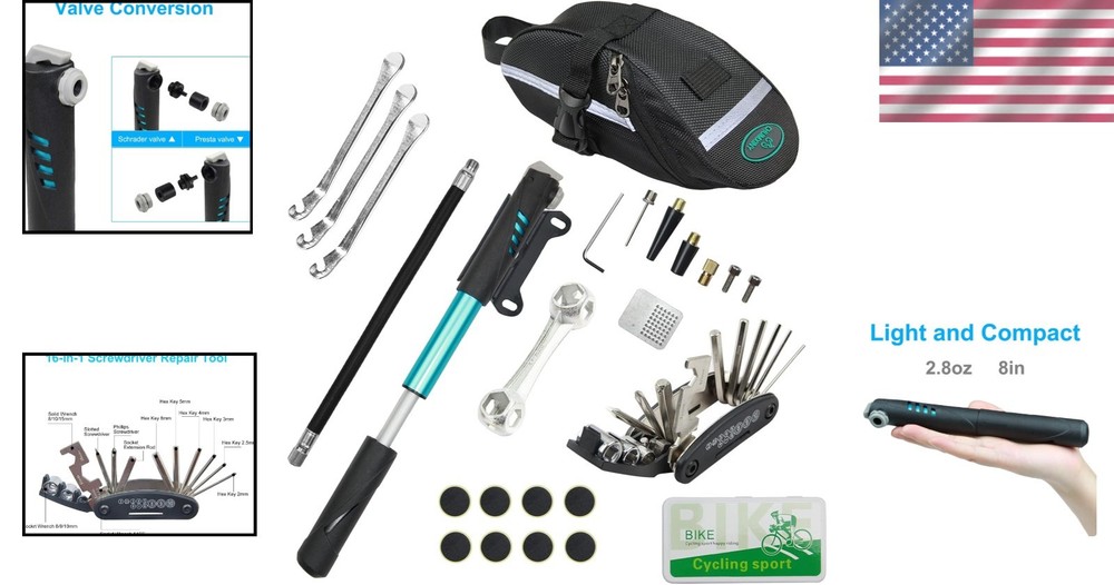 Compact Bicycle Repair Kit - 120Psi Mini Pump & 16 Essential Tools Included ‹ › ‹ › ‹ › ‹ › ‹ › ‹ › ‹ › ‹ › ‹ › Compact Bicycle Repair Kit Prepare for your next cycling adventure with our all-inclusive Compact Bicycle Repair Kit, designed to keep you on the road. This essential kit comes with a 120Psi Mini Pump and 16 vital tools to ensure that you can handle any roadside emergency with ease! Included in this Kit: Bicycle Repair Bag: Equipped with an aluminum alloy mini pump, trachea, 2 screws, tire patch, 3 stainless steel bicycle levers, bone wrench, expansion valve, needle valve, air regulating valve, and a black bike bag for convenient storage. Portable Bike Pump: Measuring only 8 inches, this mini pump is compact yet powerful. Crafted from high-quality aluminum alloy, it features precision parts that easily convert from Presta to Schrader Valve. Convenient Bike Patch Kit: Our pre-bonded tire patch repairs punctures without the need for extra glue. Simply roughen the area with the included file, apply the patch, and you're ready to roll! Easy Installation: The bicycle tool bag comes with 2 adjustable Velcro straps and one rear strap for a simple and secure installation in just two easy steps. Why Choose Our Bicycle Repair Kit? Durable construction for reliable use on the go. Compact and lightweight design makes it easy to carry on any ride. Perfect for both novice and experienced cyclists. An ideal gift for cycling enthusiasts during the holidays! Backed by a brand dedicated to enhancing your biking experience. The Perfect Gift for Cyclists Whether it's a family outing, a Thanksgiving or Christmas gift, or just a treat for yourself, our Compact Bicycle Repair Kit is a must-have for every cyclist. Enjoy the peace of mind that comes with being prepared for any unexpected challenges on your ride. Choose the repair kit that embodies high quality and convenience. Get your Compact Bicycle Repair Kit today and hit the road with confidence! Shipping Free & Fast Shipping - We offer free shipping to most of the USA with a normal delivery time of 3-10 businessdays. However, due to various situations, additional delivery time (up to 3 weeks) may be required for some items. Alternative Carriers - We may use alternative carriers (e.g. USPS, FedEx, UPS, etc.) to ensure your package arrives safely and on time. Due to the use of multiple carriers, we are unable to provide a tracking number automatically. Handling Time - Orders are processed and shipped within 1-5 business days of receiving cleared payment. Shipping Restrictions - Shipping to Alaska, Hawaii, Puerto Rico, Guam, and other US territories may incur shipping charges or delivery restrictions. Please contact us before ordering, or your order can be refunded/cancelled. State Restrictions - There may be restrictions based on your state of purchase. For example, certain items may not be shipped to California due to state regulations. Contact for Tracking Updates - If you require tracking updates or have any concerns about the delivery of your order, please feel free to contact us, and we will be happy to assist you. Return Please see our ebay return policy. We do not accept return on most products. This is to avoid customers mis-using ebay returns. All sales are final. Please be sure to check the return policy listed at the top of the listing. In rare cases, we may accept returns, if the buyer pays both ways shipping and 20% restocking fee. If you are un-sure of return policy of a particular item, please ask before buying. Payment We accept all major credit cards, PayPal, and Apple Pay for your convenience. Your payment information is secure and encrypted to ensure a safe and seamless transaction. Please complete your payment within 3 days of purchase to avoid any delays in shipping. Feedback Your feedback is extremely important to us. We strive to provide the best products and customer service possible. If you are satisfied with your purchase, please take a moment to leave us a positive review. If you have any concerns or issues with your order, please contact us before leaving negative feedback. We are committed to resolving any problems and ensuring your satisfaction. Contact Us If you have any questions or concerns, please feel free to reach out to our customer support team. You can contact us through the eBay messaging system. We are available Monday to Friday, 9:00 am to 5:00 pm EST, and we will do our best to respond to your inquiry within 24 hours. Buy it now and enjoy a pleasant shopping experience! UPC: Not Set Item Depth: 4 inches Item Length: Not Set Item Weight: 1.4 pounds Item Width: Not Set Model: Not Set Unit Quantity: 16 Material: Steel,Aluminum Alloy,Stainless Steel,Iron Brand: Unbranded Type: Tool Kit Application: Universal Color: Blue MPN: Not Set Unit Type: lb