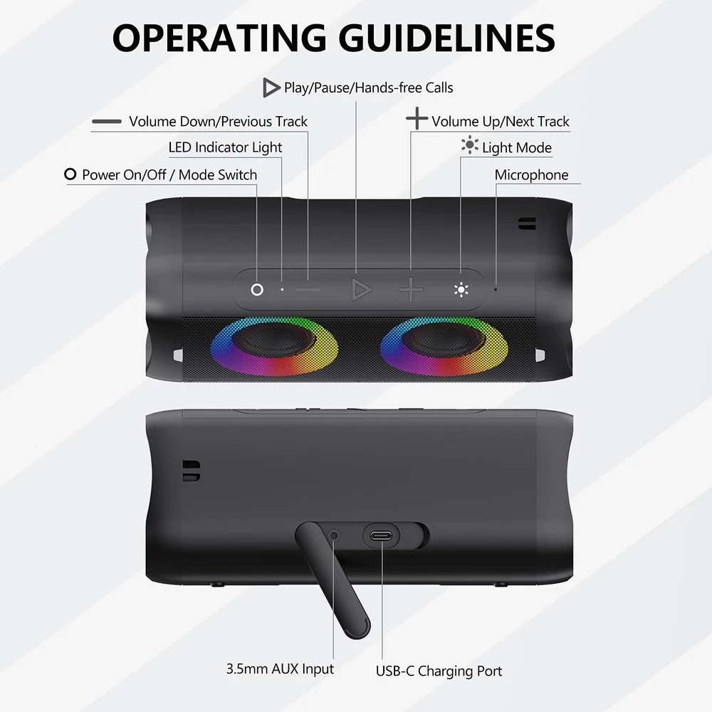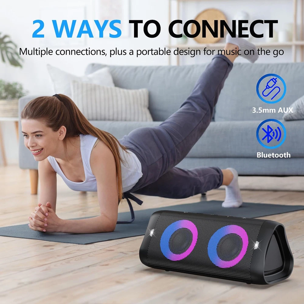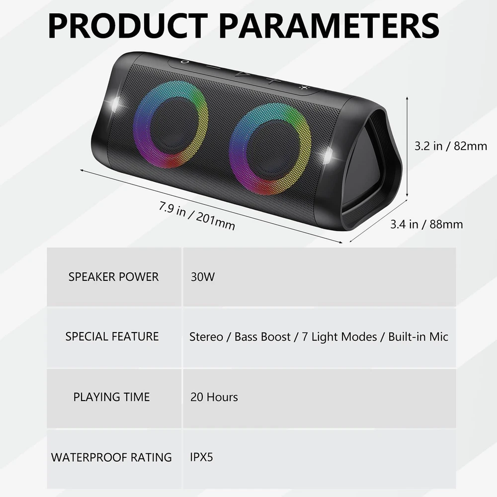 1)【30W High-Fidelity Stereo Sound】Bluetooth speaker comes with top-notch dual high-performance drivers and dual passive radiators to minimize the loss of sound quality and enhance bass. Exclusive DSP audio technology achieves clear highs, rich mids, and powerful bass. Provide an immersive stereo sound experience for all music, gaming, and movie lovers! 2)【Dynamic Light Show Sync Music Beats】speakers bluetooth wireless offer 7 light effects, you can change the rhythm mode of the lights based on the type of music you play. The strobe lights on both sides of the speaker will flash with the beat of the music, and the colorful light show creates a hot atmosphere. Let wireless speaker light up your party to make it more energetic. 3)【Small body but loud enough】The biggest drawback of portable bluetooth speaker is that they are easy to carry but the sound is not loud enough. We hope there will be incredible volume in a small body, and its sound can fill any room and garage, so we developed this loud speaker in the most popular triangular shape for more stable placement and space-saving. 4)【IPX5 Waterproof Speaker】This bluetooth outdoor speaker features a durable design and an IPX5 rating for protection against water splashes and spills. It is perfect for outdoor events such as the pool, beach, camping, biking, hiking, etc. No need to worry about the weather and the environment. 5)【Two Playback Methods】You don't have to worry about this speaker not being compatible with your existing devices. It supports Bluetooth 5.3 technology to ensure a fast and stable connection. The range is up to 100 feet without obstacles. Besides this, you can also use the 3.5 AUX input port to connect your device. Both methods can connect with your preferred device effortlessly to play music.