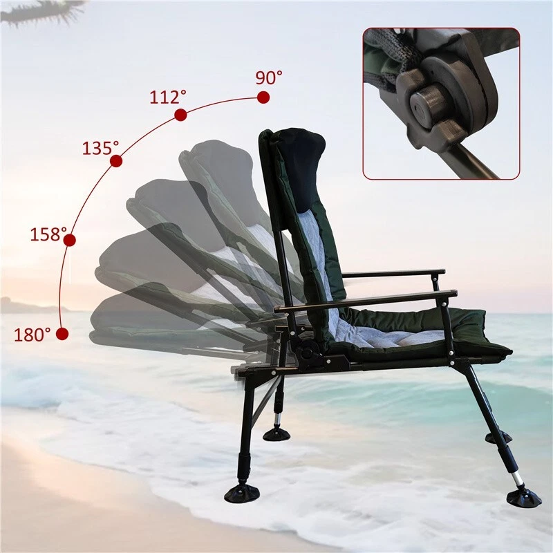 Features and Details: Convenient and Foldable: Dimensions: open: 35.43"*24.61"*34.25", folded: 29.13"*8.27"*25.2". It can be fully folded when not in use, making it easy to carry, store and transport. Sturdy and Durable: This camping chair is made of robust stainless-steel and 600D fabric. The robust frame ensures stability and safety. It is strong enough to bear a weight of 330 pounds. Adjustable Backrest: The backrest of the reclining chair is adjustable (ranging from 90° to 180°), allowing you to customize your seating position. Choose the perfect reclining setting that suits your comfort preferences and enhance your relaxation experience during any leisure activity. Adjustable Foot Cup: The legs can adjust the height balance and the foot cup of the chair can be adjusted 360°, enabling it to adapt to different outdoor environments. Exquisite Details: It is equipped with sponge cushions, enabling you to have a comfortable experience. The inclusion of arc armrests enables us to relax and support our arms while seated, enhancing a more enjoyable experience. Versatile for Use: The chair is a great choice for anyone looking for a comfortable and sturdy chair for indoor and outdoor activities such as camping, picnics, and fishing. Specification: Color: Black+Grey,Green Material: oxford fabric Product Dimensions:35.43"L× 24.61"W × 34.25"H Weight (lbs.): 15.31