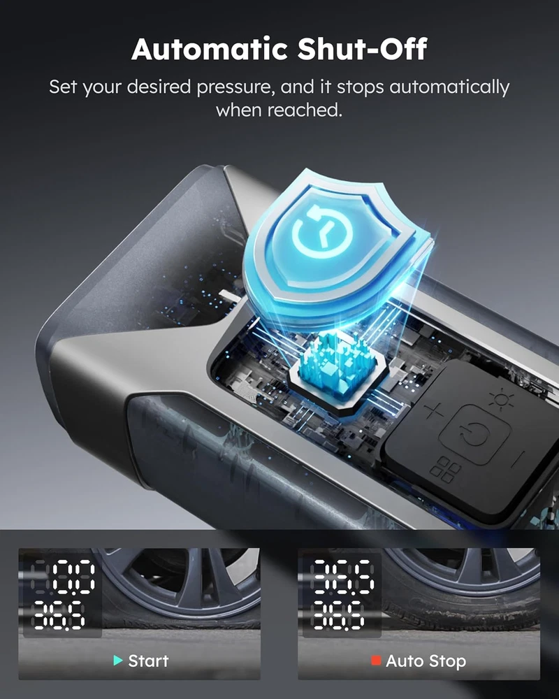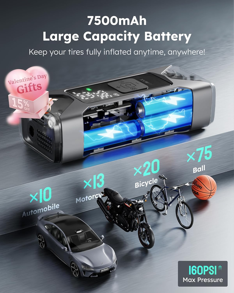 This portable air compressor is a lifesaver! It inflates tires super fast with its powerful 26L/min speed and goes up to 160psi. The built-in pressure gauge ensures accuracy, and the 7500mAh power bank is a handy bonus. Perfect for cars, bikes, and even sports gear—plus, the emergency LED light adds extra convenience. Highly recommend!