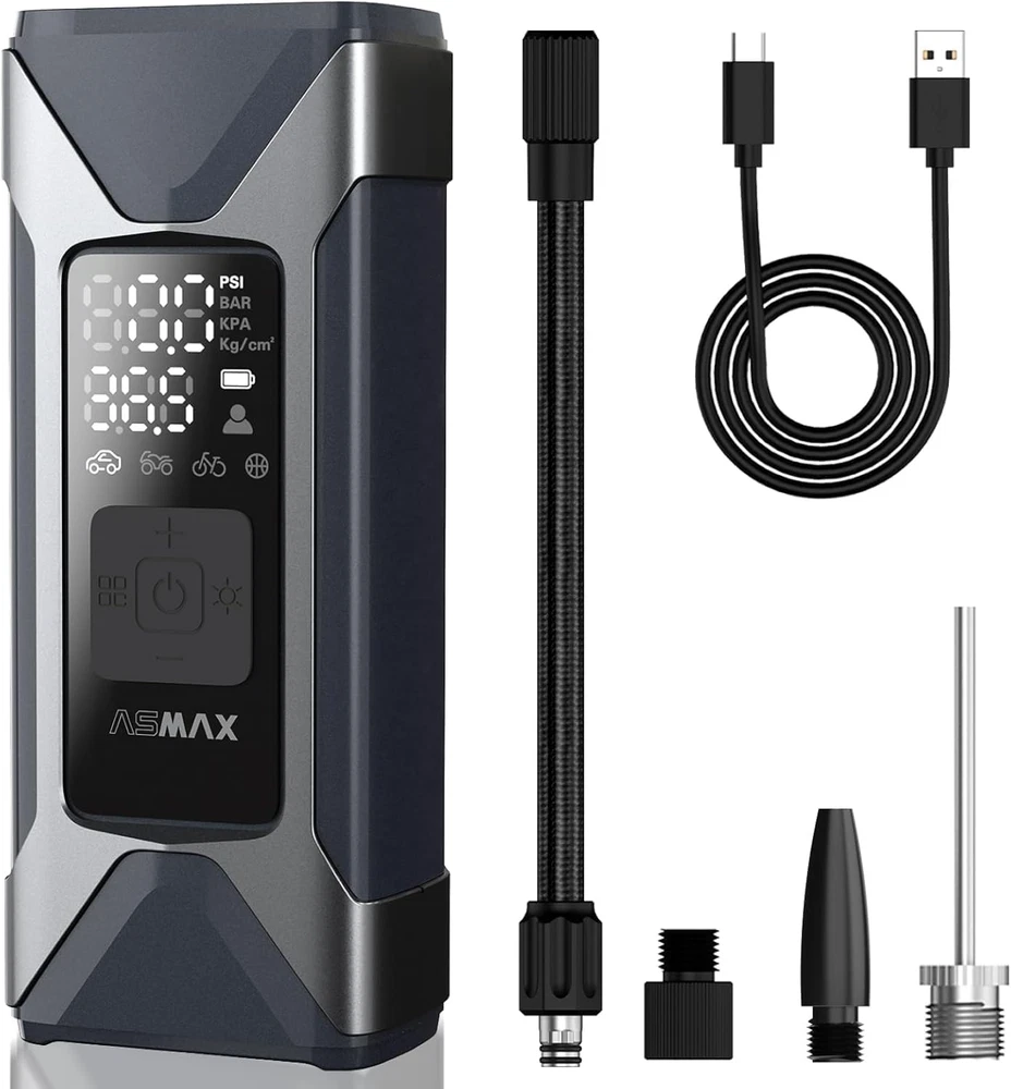 Store New Arrivals Add to Favorite View Feedback Contact Fast deliveries to the customer's home Quality customer service John Make the customers happy! Tire Inflator Portable Air Compressor - Air Pump for Car Tires with Tire Pressure Gauge - One Click Smart Pump, for Car, Motorcycle, Bike, Ball and More, Emergency LED & 7500Mah Power Bank Description Efficient Inflation: This ASMAX portable air pump provides an inflation speed of 26L/min, quickly filling the tire with a maximum pressure of 160psi. The tire inflator would stop inflating to prevent overfilling once the preset pressure value is reached. The built-in high-performance engine and intelligent cooling system effectively prevents the device from overheating. Real-time Tire Pressure Monitoring: The air pressure can be monitored in real time with an accuracy of 0.01bar. The dual LED display shows real-time data such as pressure unit, inflation mode, battery power, set value and real-time air pressure value. Easily switch between PSI, kPa, BAR, and KG/CM pressure units with one click. Wide Application: The portable air compressor provides 5 inflation modes for cars, motorcycles, bicycles, balls and customization. The preset air pressure is up to 10.8 Bar in customized mode. A wide range of accessories including air hose, Schrader valve, Presta valve, needle adapter and swimming ring nozzle. Suitable for inflating cars, SUVs, motorcycles, bicycles, basketballs, and swimming laps to fully meet your daily needs. 7500mAh Large Capacity Battery: ASMAX tire inflator portable air compressor is made of high-quality materials and has a built-in 7500mAh large capacity battery. The tire pump not only supports inflating but also can be used as a power bank. Equipped with a bright LED light on the top, this air pump for car tires is your best assistant whether inflating and changing tires at night, or serving as a warning light for vehicles at night. Multi-functional and Portable: The quick-connect insulated air hose is extended to 320mm. The quick disassembly design allows installation in just one second. Compact and lightweight, equipped with a storage bag makes this electric air pump fit easily into your toolbox or trunk. Easy to operate, suitable for all people, a perfect gift for family and friends! Product Description 1 Smart Cooling System 2 3 LED Light Modes 3 Metal Core Air Pump 1 Global Certifications 2 Multi-functional Pump 3 Real-Time Tire Monitoring Part Number T10 Warranty Description provides a 2-year warranty from the date of purchase. Item Dimensions LxWxH 2.7 x 1.81 x 6.61 inches Power Source Battery Powered Maximum Pressure 11 Bars Color Black Material Acrylonitrile Butadiene Styrene Package Weight 0.77 Kilograms Item Weight 500 Grams Operation Mode Automatic Model Name T10 Air Flow Capacity 26 LPM Included Components 1 x Fast-connected air pipe with schrader valve, 1 x Presta valve, 1 x User Manual, 1 x Smart air pump, 1 x Type-C charging cable, 1 x Air inflation needle for balls Product Dimensions 2.7"L x 1.81"W x 6.61"H Item Package Dimensions L x W x H 7.4 x 4.53 x 2.24 inches Number of Items 1 ABOUT US We offer the best prices around on high quality products. Our E-store includes media such as books, movies, music and games while offering electronics, toys, sporting apparel, clothing, tools, general home, garden items and more. SHIPPING We are always working hard to ensure your package arrives as soon as possible. Please understand that some factors like weather, high postal traffic, and the performance of shipping companies are outside of our control. We offer free shipping to the lower 48 states and ship within 2 business days of payment, usually sooner. We do not accept P.O. Boxes. Please provide a physical address. For shipping outside of the continental USA, we only use eBay's Global Shipping Program. The item is shipped to KY and then sent to the rest of the world. International customers are responsible for all duties and taxes. Continue to 'check out' to calculate costs for shipping the item to your country. Messages regarding eBay's Global Shipping Program MUST be directed at eBay EXCLUSIVELY. RETURNS We offer a 30-Day Return Policy on items in which you are not completely satisfied with. You have the option of a full-refund or an exchange of the item. No returns are available on items shipped outside of the USA PAYMENT We accept PayPal. CONTACT US This page content is yet to come Please ad us to your favorite seller and visit again later Thank You CUSTOMER SATISFACTION We try our very best to make sure every customer is completely satisfied. If there's a problem, message us! We're happy to help. WE ACCEPT