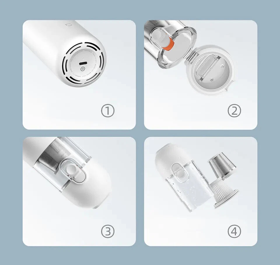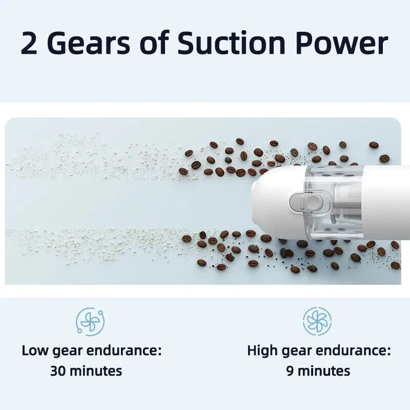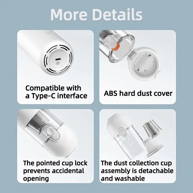 • High Suction Power : With a suction power of 13000Pa, this vacuum cleaner can easily remove dust and dirt from your car or home. • Wireless Operation : The wireless design of this vacuum cleaner makes it easy to use and maneuver, allowing you to clean hard-to-reach areas. • Cyclone Suction : The cyclone suction feature ensures that the vacuum cleaner can effectively remove dust and dirt from all surfaces, including carpets and upholstery. • Lightweight and Portable : Weighing only a few kilograms, this vacuum cleaner is easy to carry and store, making it perfect for use at home or on the go. User Instructions: Charging: 1.For the initial use or after prolonged storage, please fully charge the product first. 2.It is recommended to charge every 3 months. 3.Please use a 5V/2A power adapter (to be purchased separately) and the original Type-C charging cable for charging. Nozzle Installation: Select the appropriate nozzle and install it into the nozzle mounting port. Tip: Both nozzles can be used individually or combined. Power On/Off / Mode Switching: Press the power button briefly to cycle through the following modes: Power On (default low speed), high speed, power off. Notice: 1.Avoid charging, using, or storing the product in high-temperature conditions. When placed in a car, avoid direct sunlight, as it may cause overheating, ignition, or explosion. 2.It is recommended to use the product in environments ranging from 0°C to 40°C. Outside this temperature range, the battery may not function properly. 3.Do not use the product to suction any liquids (such as water, cola, etc.). 4.Do not use the product to suction any burning or smoking objects (such as unextinguished cigarette butts). 5.Do not use the product to suction hard or sharp objects (such as construction debris, glass, nails, etc.). Portable car vacuum cleaner Attention to Detail, Clean Up Easily Dual-Use for Cars and Homes, Powerful Suction, Brushless Motor, One-Touch Dust Emptying Slimmer than a Thermos Flask Home Dust Removal, One-Touch Clean Living Free yourself from the constraints of cords for more flexible cleaning. Even dirty and cluttered corners can be easily dusted, allowing you to enjoy a cleaner life. Cleaning Inside the Car, Tidying Up Small Messes In smog and dusty weather, the interior of the car is prone to accumulating dust. With a quick and convenient vacuum, even the finest dust and debris have nowhere to hide. *Strictly prohibited to be placed in direct sunlight. It is not recommended to leave the Xiaomi handheld vacuum cleaner in the car during high temperatures in summer to avoid potential hazards. Brushless motor for powerful performance, dual air passage for efficient cleaning. Equipped with a high-performance brushless motor and an internal straight-through dual air passage design, effectively reducing energy consumption and improving cleaning efficiency. Equipped with a high-speed start-stop function to prevent dust from remaining at the nozzle when the device is turned off. 2 Gears of Suction Power, 30-Minute Long Battery Life Low Gear Battery Life: 30 minutes* High Gear Battery Life: 9 minutes* Innovative Combination Brush Heads for Easy Dust Removal in Various Scenarios Crevice Dusting Flexibly clean hard-to-reach crevices and corners. Keyboard Cleaning Effortlessly remove hidden dust beneath the keycaps. Car Interior Cleaning Instantly sweep away long-hidden fine dust. Compact in size, it doesn't take up space for storage. ① Sofa placement; ②Drawer storage; ③ In-car storage One-key dust disposal, convenient and hands-free. Designed with a one-key dust disposal feature, press the button, and the dust cup cover automatically pops open, avoiding secondary pollution. ①Button lock design to prevent accidental opening of the cup cover. The button lock design allows you to slide down to unlock when dumping the dust, and then simply press the button to open it. ②The initial filter steel mesh is detachable, separating large particles of dust. ③Built-in high-standard filter core.The whole machine has a filtration efficiency of >99.5%. The double filtration system of the initial filter steel mesh and high-standard filter core ensures that vacuuming doesn't create more dust and is not afraid of tiny dust particles. Craftsmanship, quality originates from details. ①Compatible with a Type-C interface, it can be used with mobile phone and mobile power data cables. ②ABS hard dust cover.Closes tightly, effectively preventing dust from leaking. ③The pointed cup lock prevents accidental opening, securely locking the cup cover and preventing accidental opening. ④The dust collection cup assembly is detachable and washable, reducing consumables and extending the product's lifespan. Specifications: Product Name: Handheld Vacuum Cleaner Product Weight: Approximately 0.5kg Rated Power: 120W Product Dimensions: 267 × 55 × 55mm Rated Voltage: 10.8V Package Information: ①Main Unit ×1 ②Crevice Nozzle × 1 ③Brush Nozzle x1 ④ Type-C Charging Cable × 1 ⑤User Manual ×1