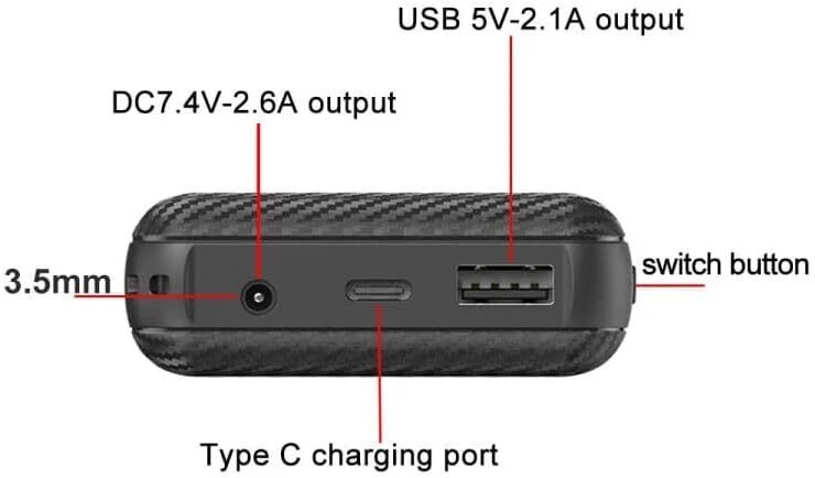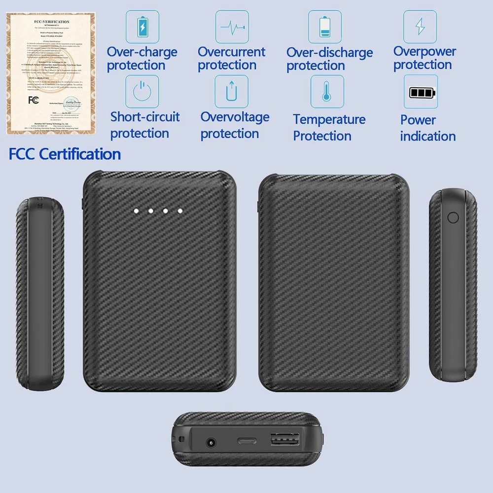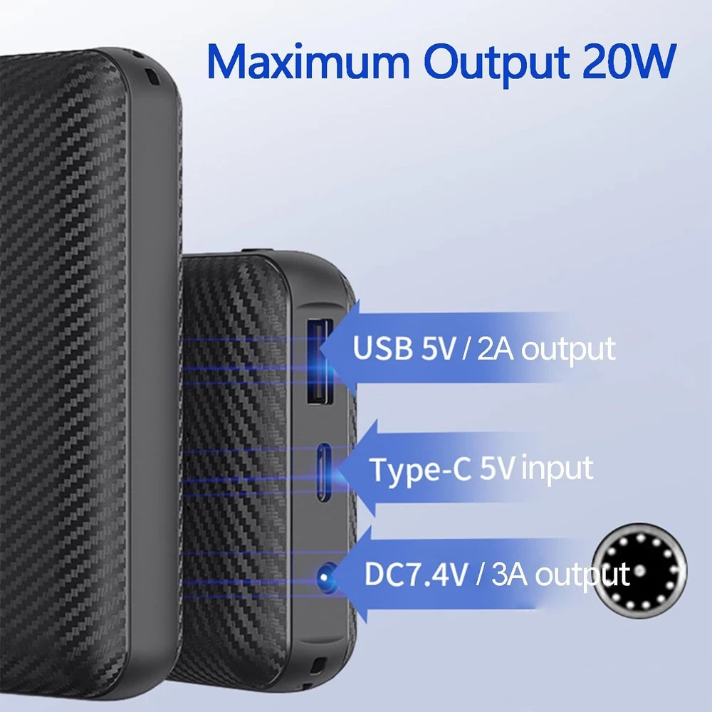 Product Description Portable Charger, 7.4V 3A USB C Power Bank, 20000 mAh DC 3.5mm Portable Phone Battery Portable Battery Bank, External Battery Pack Charger Compatible with Smartphones and USB Devices 20000mAh Ultra-Large Cell Capacity power bank will keep your phone running all day, It widely compatible with smartphone and all USB devices. Allowing you to charge mobile devices without having to be tethered to a plug socket. This power bank has 1 USB 5V output ports and DC 7.4V that detect all the connected devices and efficiently distributes the current output up to 7.4V 3A. The USB C and DC ports can fully refill the battery itself in 7 hrs at 7.4V 3A. Designed for use with virtually any device that charges from a USB port. This portable charger utilizes a safe high-density lithium polymer battery module. It is much safer than any Li-ion charger. It is not only more compact, but it also offers a larger battery capacity, surpassing traditional lithium-ion batteries in safety standards. UL 2056: NCT210501268XU3-1 (Application Dated:4/1/2022) Wide Compatible: Compatible with iPhone and Android smartphones, tablets.and other USB device. Lightweight design means you can effortlessly carry it in your bag to stay charged anywhere. It feels incredibly compact for a 20000mAh power bank, weighing just 200g and only 24mm thick.