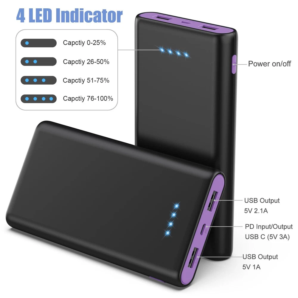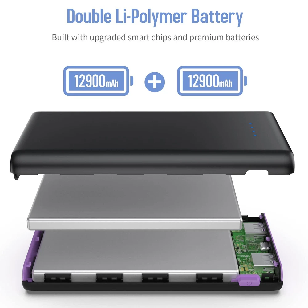 2019 Latest Design Portable Charger Power Bank with 25800mAh Ultra-Huge Capacity ---For use on the go anywhere anytime! Make sure your smart devices always connected with it all the time! ★More performs in safety efficiency and compatibility etc with Advanced intelligent controlling IC 100% checked and continuous aging test which it will brings you unprecedented convenience! Features: --25800mAh High Capacity charges any smart and cell phones for 6-8 times; --Fashionable Classic Style & Ultra Slim Design Ultra comfortable skin; --Dual USB Outputs(5V/2 1A + 5V/1A) Charges devices simultaneously without sacrificing charging speed; --High-Speed Charging With fastest speed 2 1A less time to charge more time to go out; --Flight Safe Lighter features can be securely taken on a plane or in your bag. --Widely Compatibility: with iPhone(iPhone XS max/XR/XS/X/8plus/8/7plus/7/6plus/6s/6 etc), Android phones(Samsung Galaxy S10+/S10/S9+/S9/S8+/S8/S7 edge/S7 etc) Google Pixel Nexus 6P Table with iPad and more... ➊Compatible with iPhone 6/6s/7/8 6 8 times ➋Compatible with iPhone 6 Plus/7 Plus/8 Plus 4 5 times ➌Compatible with iPad Table 2 3 times ➍Other Android or USB Smart Devices Multiple times Specification: ●Capacity 25800mAh ●Battery Type Li-polymer(A CE RoHs and UL certification) ●Input 5V/2 1A ●Dual Output 5V=3 1A(2 1A max + 1A) ●Item Size 0 72 X 2 95 X 5 94 inch ●Item Weight 335g/11 8oz ●Usage Temperature 0℃ 45℃ Important Tips: 1.We suggest you please charge power bank in full for the first using; 2.Use the included cable your original cable or a third-party certified (such as MFi) AC adapter not included. What's in the box? 1 X 25800mAh Battery Portable Charger 1 X USB C Cable 1 X User Manual 2019 Latest Design Portable Charger with 25800mAh Ultra-Huge Capacity, adopts our advanced intelligent controlling IC, higher quality, safer and more reliable, powerful and longer-lasting life after 100% checked and continuous aging test; Universal Compatibility -- The power bank with iPad, iwatch, with iphone, Samsung Galaxy, most other Smart cell phones, , Bluetooth devices and more. It can charge 6 to 8 times to eliminate the anxiety of your battery exhaustion. Suit for travel, and other indoor outdoor activities; Dual USB Charging & Fast Recharge -- The Dual USB ports (2.1A+1A) to charge your devices simultaneously, Fully recharges itself in 8~12 hours with 2.1A input charger, or 12-24 hours with 1A charger; 4 LED Lights & Certified Safe -- Four led lights show the current remaining power of the item(25%~50%~75%~100%), easily press the power button to turn it on or off. Built-in smart protection system, the USB battery pack ensures complete protection for you; 24 Months Support Services -- 25800mAh portable battery charger, USB C cables, user manuals. Together 2 Years friendly, easy-to-reach support! Any question, please kindly us.