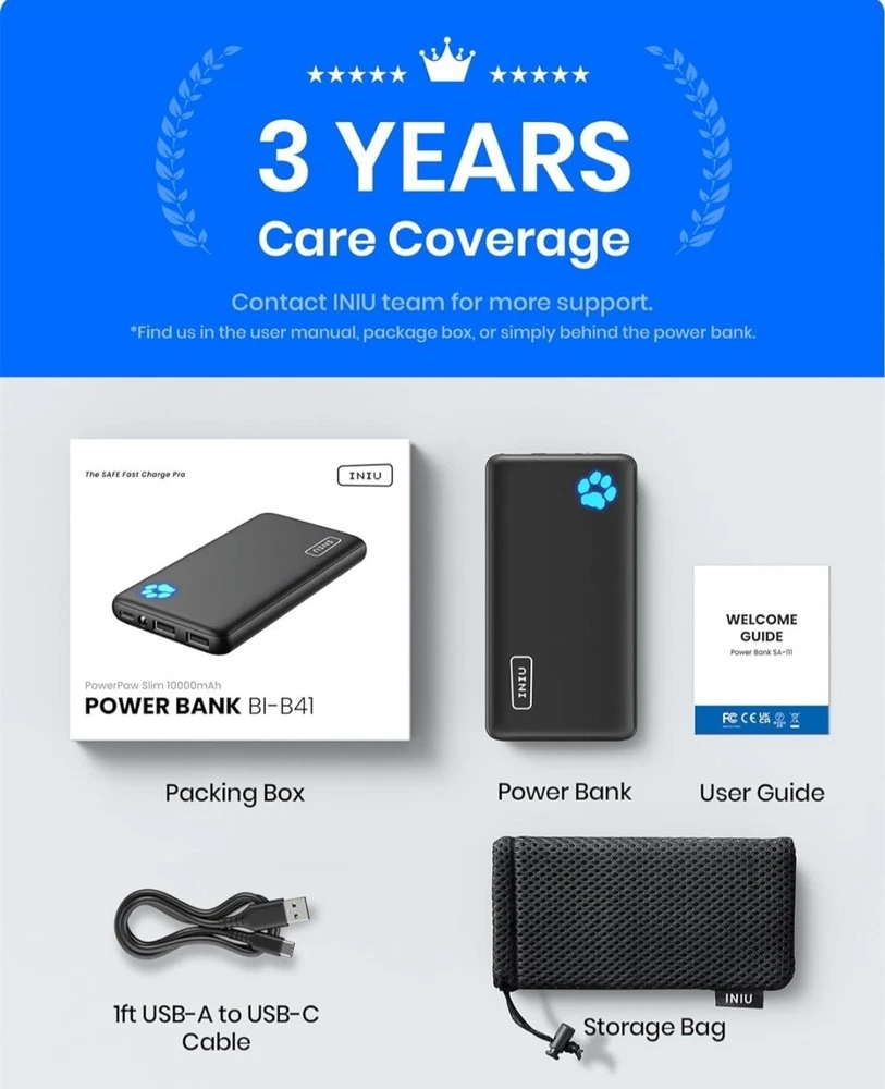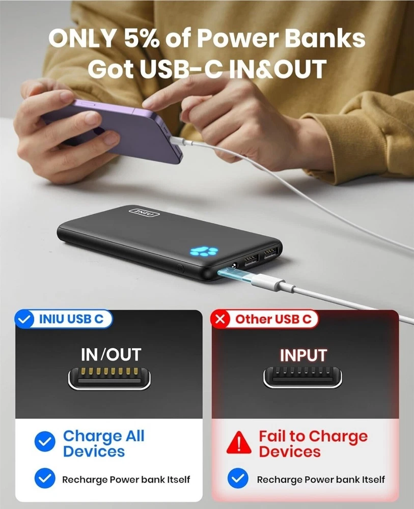 Portable Charger, Slimmest 10000mAh 5V/3A Power Bank, USB C in&out High-Speed Charging Battery Pack, External Phone Powerbank Compatible with iPhone 16 15 14 13 12 Samsung S22 S21 Google iPad etc From INIU-- the SAFE Fast Charge Pro: Experience the safest charging with over 38 million global users. At INIU, we use only the highest-grade materials, so we do have the confidence to provide an industry-leading 3 years iNiu Care. Market's Thinnest 10000mAh : The market’s one and only 0.5-inch power bank that breaks the limit of 10000mAh, easily slipped into any travel lover's pockets or bag. Enjoy the days’ worth of charging capacity, enough to top up iPhone 8 3.6 times, Samsung S22 1.8 times, or AirPods Pro 13.2 times. Only 5% Got USB-C IN&OUT : INIU is the only 5% of power banks got a USB-C IN&OUT port. Unlike others only recharge via USB-C port, INIU can charge all devices with your USB-C cables directly. 3A High-Speed Charging : 3A fast charging fuels iPhone up to 78% in just one hour. INIU's AutoFit identifies and meets your device's ideal speed, charging double than 2.1A chargers. 15-Layer SAFE Charging : INIU's unique 15-Layer SmartProtect system shrugs off any unusual charging at the start. Take overheating risk and battery damage away from your devices. What You Get: INIU 10000mAh portable charger*1, 0.3M/1ft USB-A to USB-C Cable*1, travel pouch*1, user manual*1, INIU industry-leading 3-year iNiu Care and lifetime technical support. Payment ●Payment must be received within 3 business days of auction closing. ●Please Note: Import duties, taxes and chargers are not included in the item price or shipping charges. These charges are the buyer's responsibility. Shipping ●Items will be shipped within 3 days after the cleared payment. All items will be checked carefully and packages in good condition. ●We will ship to ebay's address only. Please make ¬¬¬¬¬¬¬¬¬¬sure your address on ebay is the same with your shipping address before you pay. ●Shipping and Handling will be determined based upon the ship to address ●If you didn't receive your package, this time schedule, please do not hesitate to contact us. Within 24 hours we will try to update you with the latest tracking details of the shipment. Return and Feedback ●We sincerely hope that you can leave us a positive feedback. If, for any reason you are not satisfied with your purchase, please contact us through "Ask Seller Questions" before leaving neutral or negative feedback ●If you are not satisfied about your received item, please return it within 30 days for a refund. ●We will accept any return and give a full refund (without shipping cost) on any item. The item must be returned to us in original condition and the buyer need to pay return shipping cost