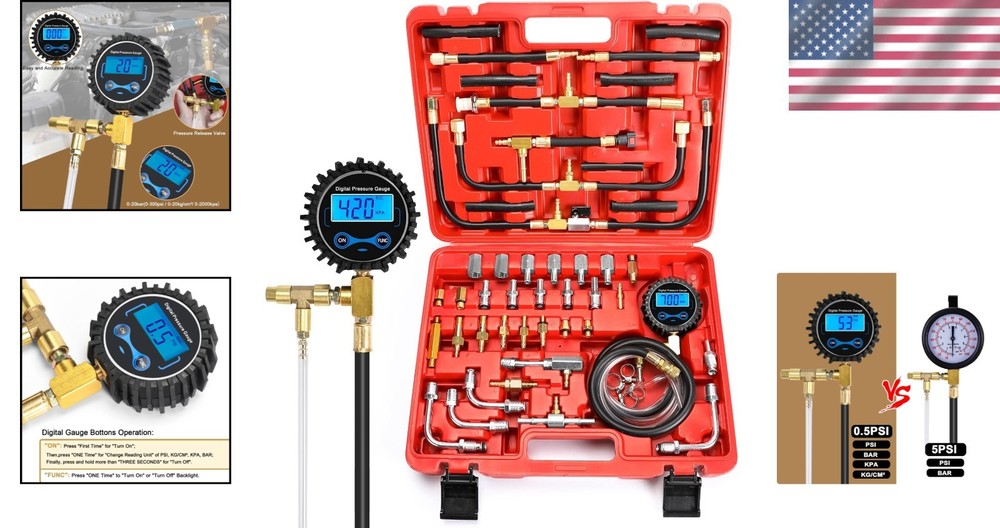 Portable Digital Fuel Injection Pressure Tester - Precise 0-300 PSI Measurements ‹ › ‹ › ‹ › ‹ › ‹ › ‹ › ‹ › ‹ › Portable Digital Fuel Injection Pressure Tester Precise 0-300 PSI Measurements Features: Digital Fuel Pressure Gauge: Enjoy accurate and clear data on a vibrant backlight display for easy readability. Multiple Measurement Units: Switch between 4 different numerical units: PSI, KPA, BAR, KG/CM² at the touch of a button. Quick Pressure Release Valve: Equipped with a safety pressure release valve and a transparent hose for safe pressure discharge and fuel recovery. Efficient Connection: The coupler at the end of the gauge hose connects rapidly with most adapters, streamlining your work process. Precision Measurement: Features a remarkable 0.5 display resolution for precise readings, covering a measurement range of 0-300 PSI; 0-20 BAR; 0-2000 KPA; 0-20 KG/CM². Scope of Application: Kit includes adapters, hoses, and fittings compatible with all fuel injection systems and most cars, trucks, and vehicles worldwide! Benefits: Exceptional Accuracy: Experience high precision with every measurement, ensuring your diagnostics are reliable. User-Friendly Display: Easy-to-read backlight ensures visibility in all conditions for a hassle-free experience. Time-Saving Design: Rapid connection and clear readings mean less downtime and more efficient diagnostics. Enhanced Safety: The quick pressure release valve allows for safe fuel discharge, ensuring a secure working environment. Wide Compatibility: Perfect for both professional mechanics and DIY enthusiasts, made to work seamlessly with a variety of vehicles. Why choose the Portable Digital Fuel Injection Pressure Tester? When it comes to maintaining your vehicle’s performance, precision is key. Our Portable Digital Fuel Injection Pressure Tester offers unparalleled accuracy and safety, designed to meet the needs of both seasoned mechanics and DIY enthusiasts. The intuitive design, combined with a high-range measurement capacity, makes it an essential addition to your toolbox. Invest in a tool that elevates your diagnostics and enhances vehicle maintenance - order your Portable Digital Fuel Injection Pressure Tester today! Shipping Free & Fast Shipping - We offer free shipping to most of the USA with a normal delivery time of 3-7 days. However, due to the current situation, additional delivery time (up to 3 weeks) may be required for some items. Alternative Carriers - We may use alternative carriers (e.g. USPS, FedEx, UPS, etc.) to ensure your package arrives safely and on time. Due to the use of multiple carriers, we are unable to provide a tracking number automatically. Handling Time - Orders are processed and shipped within 1-2 business days of receiving cleared payment. Shipping Restrictions - Shipping to Alaska, Hawaii, Puerto Rico, Guam, and other US territories may incur shipping charges or delivery restrictions. Please contact us before ordering, or your order can be refunded/cancelled. State Restrictions - There may be restrictions based on your state of purchase. For example, certain items may not be shipped to California due to state regulations. Contact for Tracking Updates - If you require tracking updates or have any concerns about the delivery of your order, please feel free to contact us, and we will be happy to assist you. Return 30-Day Hassle-Free Returns - We want you to be completely satisfied with your purchase. If you are not, you can return the item within 30 days of receiving it for a full refund or exchange. Easy Return Process - To start a return, simply contact us and we will provide you with a prepaid return shipping label and detailed instructions. Restocking Fee - There are no restocking fees for returns. However, the buyer is responsible for return shipping costs if the return is not due to a seller's error. Refund Processing Time - Refunds will be processed within 5 business days of receiving the returned item in its condition. Payment We accept all major credit cards, PayPal, and Apple Pay for your convenience. Your payment information is secure and encrypted to ensure a safe and seamless transaction. Please complete your payment within 3 days of purchase to avoid any delays in shipping. Feedback Your feedback is extremely important to us. We strive to provide the best products and customer service possible. If you are satisfied with your purchase, please take a moment to leave us a positive review. If you have any concerns or issues with your order, please contact us before leaving negative feedback. We are committed to resolving any problems and ensuring your satisfaction. Contact Us If you have any questions or concerns, please feel free to out to our customer support team. You can contact us through the eBay messaging system. We are available Monday to Friday, 9:00 am to 5:00 pm EST, and we will do our best to respond to your inquiry within 24 hours. Buy it now and enjoy a pleasant shopping experience! Manufacturer Part Number: Fuel Pressure Tester Unit Quantity: 16.4 x 13 x 3.7 inches Items Included: Fuel Pressure Gauge,Adapters,Hoses,Fittings Accessories: Fuel Pressure Tester Suitable For: Petrol Engine Fuel Pressure,Fuel Injection Systems,Automotive Testing Features: Backlight Display,Quick Pressure Release Valve,Accurate & Fast Connection,Precise Measurement,Digital Fuel Pressure Gauge,4 Numerical Units Display,Pressure Release Valve,Transparent Hose,Quick Coupler,0.5 Display Resolution Maximum PSI: 300 PSI