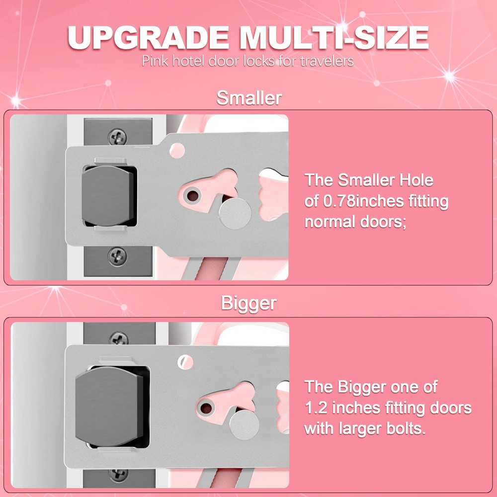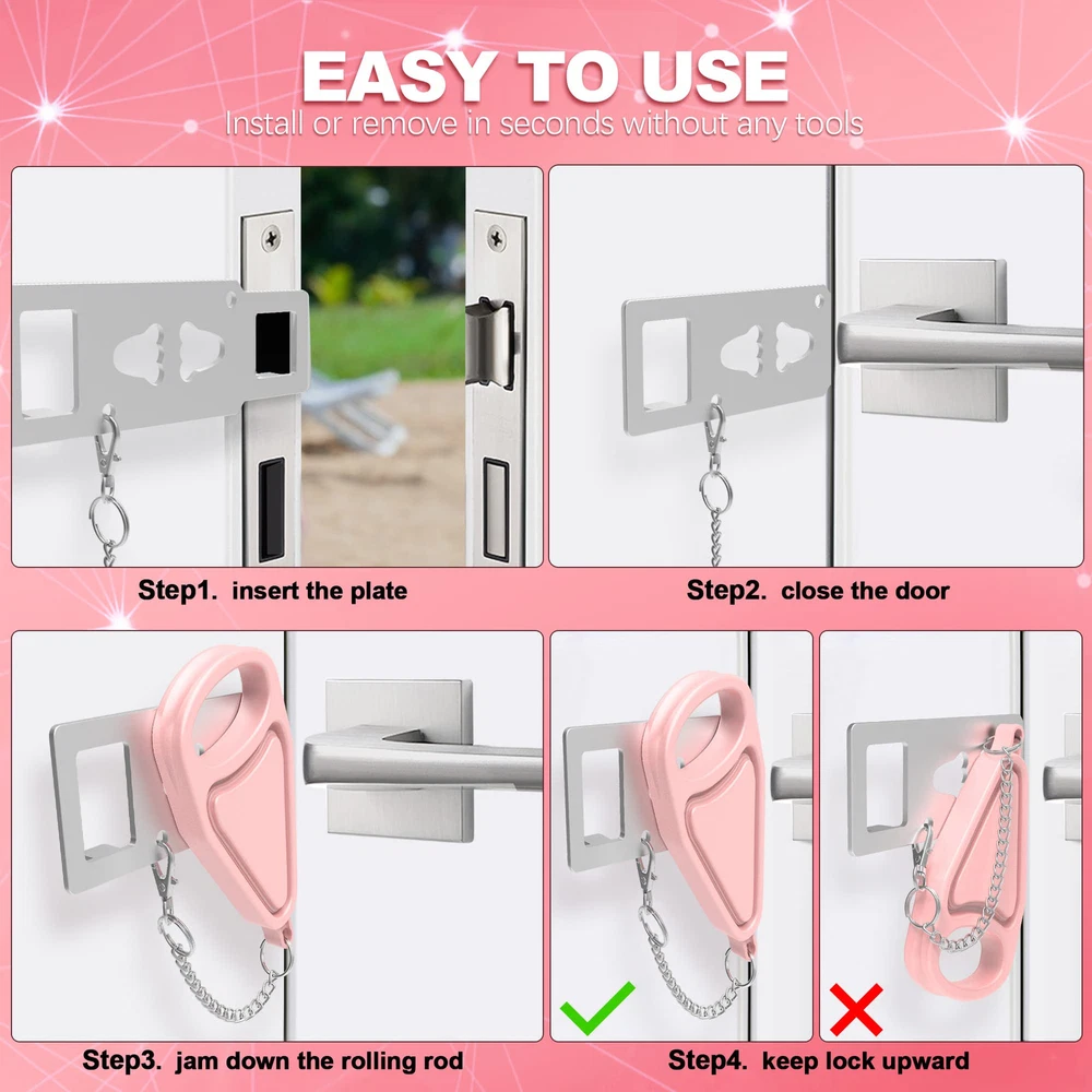 SECURITY AND PRIVACY- This portable door lock provides you with extra security and privacy, greatly improving your security and preventing unauthorized entry, so the door can't be opened from the outside, not even with a key; which is a great helper for you when you are on business and trips, or live alone. EASY TO USE - Easy to install or remove, this door security device can be installed in seconds without any tools, even in emergency situations and in the dark. Just insert the door lock metal piece into the slot of the door frame, close the door, and then put the handle groove to the stud on the metal sheet, then no one can open the door from outside. HEAVY DUTY LOCK- The door security device is made of strong stainless steel. Rugged ABS plastic cover to prevent damage to doors under pressure. Steel surfaces with electroplating and polishing technology ensure a smooth touch and minimize any injury to your skin. A strong door lock with high quality may guarantee prolonged service life. WIDELY USE - The security door stopper contains two holes of different sizes to ensure that all types of door locks are matched. Perfect for hotels, dormitories, apartments, short-term rentals, Airbnbs, bathrooms, bedrooms, or private rooms. It may also be applied to avoid pets going out, and also to prevent children from opening their doors to strangers. Portable Door Lock - This package comes with 2 pack sturdiness extra door locks, dust bag and manual for privacy and safety. Size 4.3 x 1.26 x 0.4 inches with 0.78inch (2 cm) and 1.2inch (3 cm) holes, lightweight and small, you can put it in a pocket or handbag. It only suitable for swing-in door with door hole less than 1.1 inches(This is the upgrade patented lock, a gift for wherever you need.Email us if you need help.)