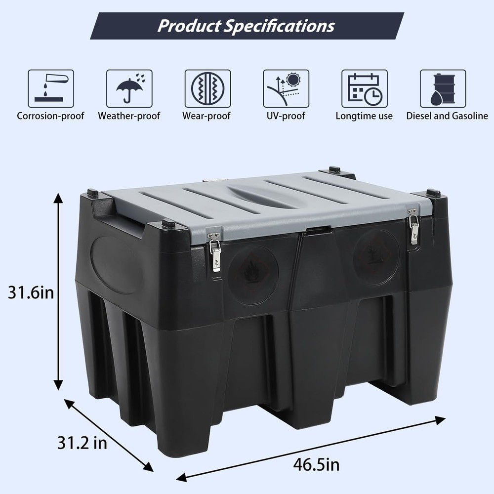 Large Capacity Fuel Tank for Versatile Use - Featuring a 128 gallon capacity, this portable fuel tank is ideal for long trips and diverse tasks. Designed for use with diesel, gasoline, and other fuels, it supports tractors, trucks, lawn mowers, and generators, offering efficient mobile refueling without needing multiple containers. High-Efficiency Transfer Pump System - Equipped with a 12V electric fuel pump delivering a rapid flow rate of 10 gallons per minute (GPM), this diesel transfer tank ensures fast and effective fuel delivery. Save time refueling and focus on your work without unnecessary delays. Durable and Weather-Resistant Construction - Made from premium-quality polyethylene, this diesel fuel transfer tank is built to last. Its sturdy design resists scratches, dents, and corros Portable Fuel Tank 128 Gallon Diesel &Gasoline Transfer Tank W/12V Electric Pump Upgraded Design Previous page Next page Efficiency Pump Large Capacity More Details About Fuel Tank Garvee Portable Fuel Tank, 128 Gallon Diesel & Gasoline Transfer Tank With 12V Electric Pump, 10 GPM Flow Rate, 13.1ft Hose, Auto Fueling Nozzle , Durable Fuel Transfer Tank for Easy Transportation 13.1 FT Delivery Hose The fuel delivery hose is made of rubber, which has better aging resistance. The length of both the cable and the fuel hose is 4 meters (13.1 feet), which is perfectly suited for everyday use. Mechanical Fuel Gauge The fuel gauge features 8-level gauge scales that help you closely monitor the capacity of fuel, allowing you to fill it up in time. Convenient Reinforced Strap Two safety ropes with aluminum quick-connect buckles are available to secure the diesel tank to the top of your car, tractor, or truck, which prevent slips and falls while in transportation. 12V Electric Pump Flow Rate: 10 GPM; Output Power: 140W. The 12V DC fuel transfer pump delivers up to 10 gallons per minute (40 liters per minute). Corrosion-resistant Features: Large Capacity Fuel Tank for Versatile Use - Featuring a 128 gallon capacity, this portable fuel tank is ideal for long trips and diverse tasks. Designed for use with diesel, gasoline, and other fuels, it supports tractors, trucks, lawn mowers, and generators, offering efficient mobile refueling without needing multiple containers. High-Efficiency Transfer Pump System - Equipped with a 12V electric fuel pump delivering a rapid flow rate of 10 gallons per minute (GPM), this diesel transfer tank ensures fast and effective fuel delivery. Save time refueling and focus on your work without unnecessary delays. Durable and Weather-Resistant Construction - Made from premium-quality polyethylene, this diesel fuel transfer tank is built to last. Its sturdy design resists scratches, dents, and corrosion, ensuring reliable performance in harsh environments, from extreme heat to snow or rain. Advanced Refueling Features - The tank comes with a 13.1-foot rubber hose, an automatic fueling nozzle, and a 360-degree connector, ensuring effortless and spill-free operation. The automatic shut-off prevents overflows, while the integrated fuel level indicator keeps inventory in check for seamless use. Portable and Easy to Transport - This gasoline and diesel tank is lightweight yet robust, this gasoline and diesel tank Its compact design and convenient handling make it perfect for job sites, farms, or outdoor activities requiring reliable fuel transportation. PACKAGE INCLUDES: 1 x Tank Payment Delivery details Terms of sales About us Contact us Payment We accept payment either via PayPal or any of the following credit cards; Visa, MasterCard, Discover, and American Express. Delivery details 1. We will delivery out at the handing time when we receive the payment. 2. The delivery time is 3-5 business days to US by usually time.The parcel maybe delay 1-2day of the weekend.Due to the bad weather,Holidays,Hot Season ect.the parcel maybe delay,If you have any problems,mssage us,we will try our best to solve it. 3. We ship to your eBay address. Please make sure your eBay address is correct before you pay. 4. If you want to change the shipping address,message us before our send out. Terms of sales If you are not satisfied with the item for any reason, please do not quick to leave negative/neutral feedback even open request and case without any communication with us. We devote ourselves making EVERY CUSTOMER in 100% Satisfactory and resolve any problem. Thank you for your understanding and recognition,we are always leave positive feedback to all our customers. About Reply: All replies will be sent to your email box, if you do not get response within 24 hours (Sat. & Sun. excluded) please check your eBay My Messages in case that our emails will be filtered automatically by your settings. About us skybridge99 is a brand new store but we are one of North America’s top online suppliers of specialized, high-quality aftermarket online retailers and suppliers, committed to developing new markets. We primarily offers tool sets, auto parts, home goods, etc..With over 20 years of product selection and manufacturing experience, we delivers unparalleled quality, value, service and satisfaction. Our highly-trained, professional staff offer in-depth knowledge and personalized assistance for customers worldwide. Providing our customers with a simple, hassle-free experience with best-in-class customer service is more than a goal. Contact us Any problem please rest assure to contact us by eBay message first. We will reply you as soon as we can. We will deal with it within 24hs on working days. Brand GARVEE MPN Does not apply Model Portable Diesel Fuel Tank Item Weight 138.01 lb Color Black+Grey Material High Density Polyethylene (HDPE) Type Fuel Tank Warranty 5 Year Capacity 128 Gallon Fuel Type Diesel Features High Flow Rate Item Height 31.6" Item Width 31.2" Item Length 46.5"