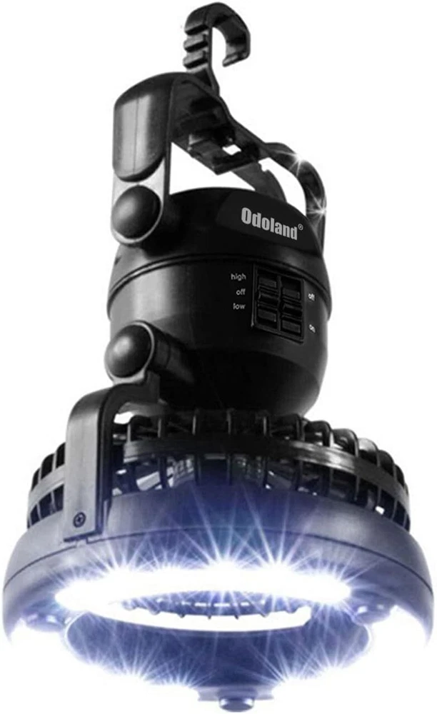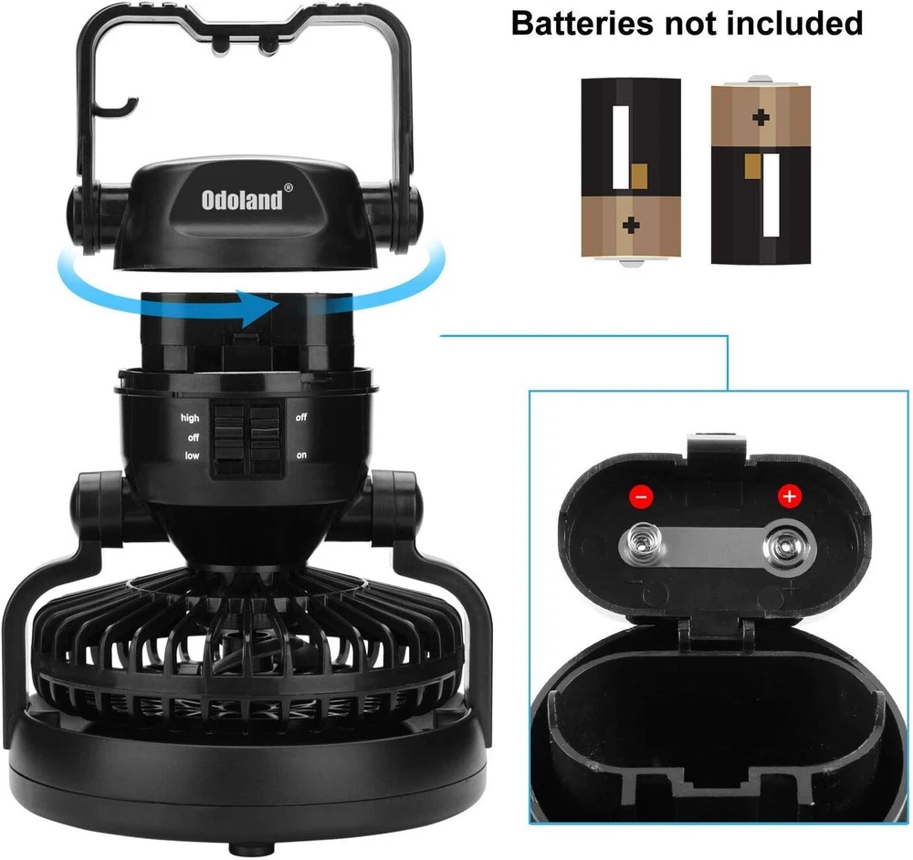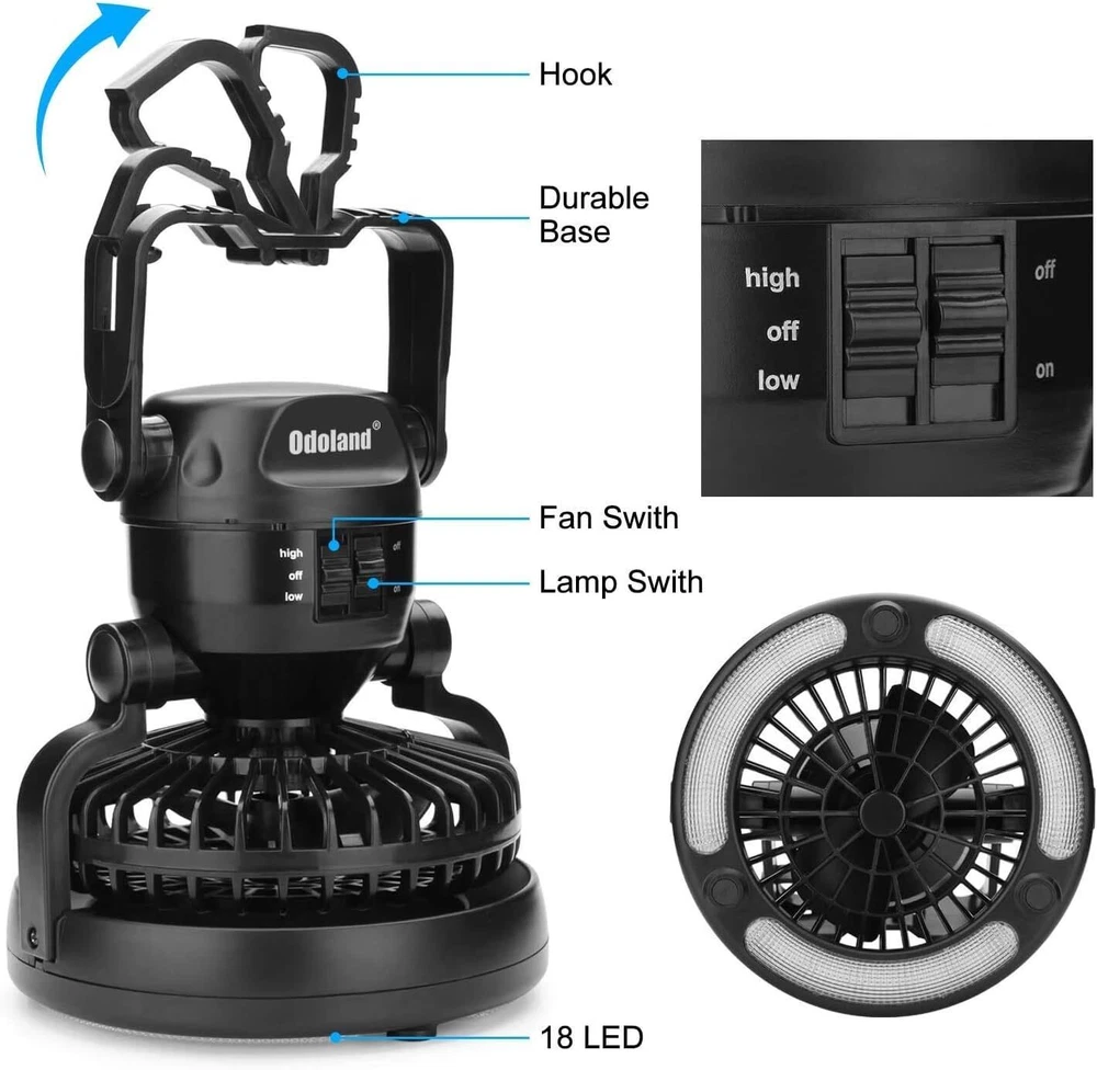 Camping Essentials: Portable fan combines tent fan and camping light. Lantern useful for lights up your tent. Fan circulate air enables to cool down instantly. Versatile light/fan: Ultra Bright 18 individual low powered LED bulbs. The fan has high and low settings to provide nice air circulation and lit up the tent. You can orient in so many positions. Powerful camping fan speed and bright lighting: High quality brushless motor for whisper operation, max wind speed 10ft/s, strong airflow and 2 setting speeds. Glamping essentials tent fan. Lightweight & Portable: Collapsible design with hanging hook, can be hang it on tents, tree or inside a car. Aslo can placed on desk at home or in office. Lightweight design also easy to carry. Multipurpose Use: 2 D batteries (Battery is not included) can keep the fan work for 5 hrs in high speed mode. Best survival kits for outdoor indoor, emergency, light power outages, hiking hurricane.
