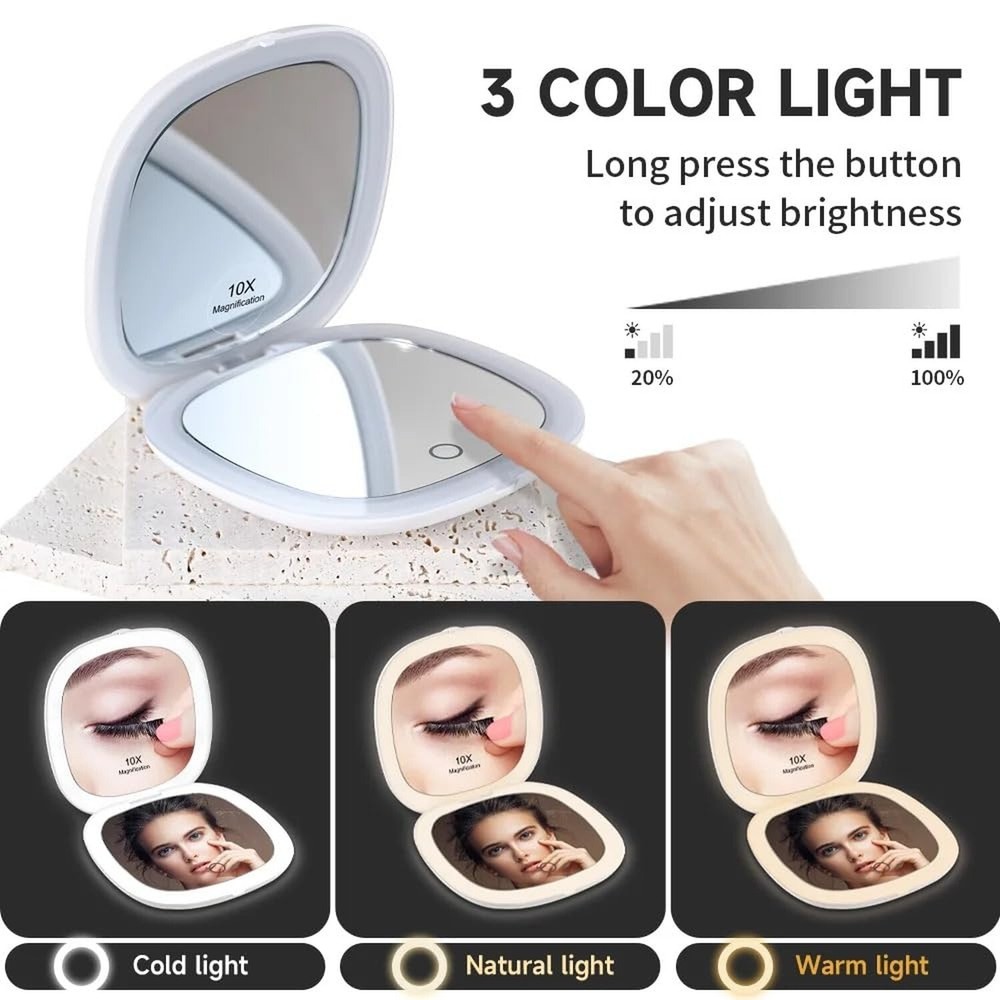 Absolutely love this mirror! The LED lights give perfect brightness for flawless makeup, and the compact size makes it super portable. The touch button is so convenient, and the two-sided design is a game-changer – one side for detail, the other for regular use. Bonus: USB charging means no fussing with batteries! The pink color is cute and stylish. Perfect for travel or home use.
