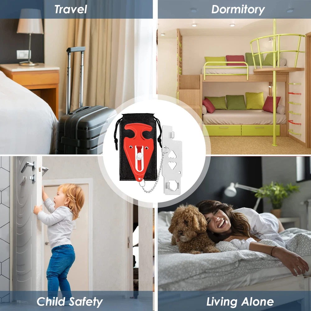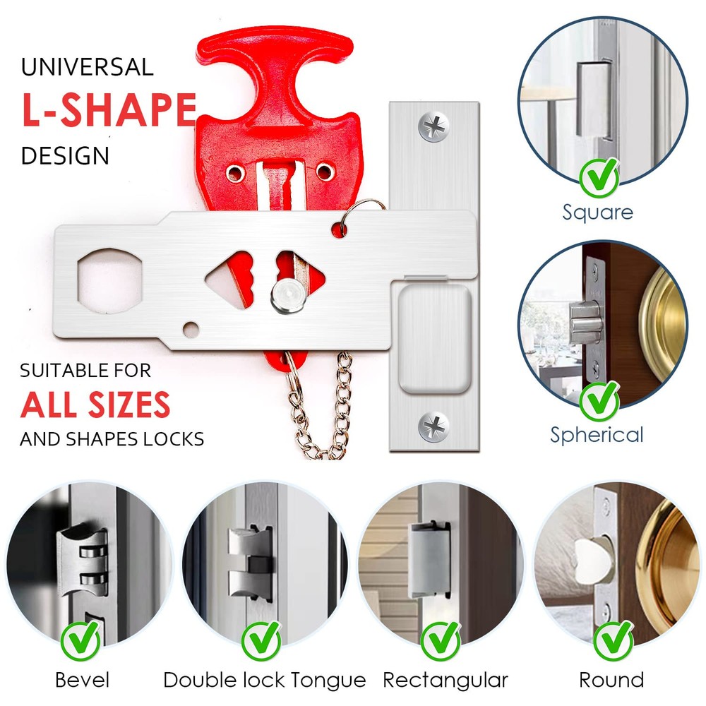 UPGRADE UNIVERSAL L-SHAPED PORTABLE DOOR LOCKS: For portable door locks on the market with only two sizes of holes, there are size restrictions on the length and width of the deadbolt that uses the door lock, and most door locks are not suitable. In response to this problem, our portable door lock adopts a new L-shaped design, which can perfectly fit all door locks and is suitable for door locks of various lengths, widths and shapes. SECURITY AND PRIVACY -: This portable door lock provides you with extra security and privacy, greatly improving your security and preventing unauthorized entry, so the door can't be opened from the outside, not even with a key; Hotel door lock are small and come with a cloth bag, and it's TSA compliant and will not be confiscated in your carry-on luggage if you are traveling by air. Which is a great helper for you when you are on business trip and travel , or live alone. INSTALLED & REMOVE IN SECONDS - WITHOUT ANY TOOLS: Door lock security installs in seconds without tools, requires no drilling or installation. Just put the metal piece goes into the hole on the door jam then you close the door, take the red handle, and insert it into the lock in place, and then no one can open the door from outside. Even in emergency situations and in the dark, you could remove the lock in seconds! HEAVY DUTY LOCK: The portable door lock is made of heavy duty steel, thick and rigid, with better performance and durability, While ensuring the life of the lock. Rugged ABS plastic cover to prevent damage to doors under pressure. Used the latest electroplating and polishing tech to ensure a perfect smooth touch, avoid any injury while using door lock. Provides secondary security for hotel, apartment, dorm room, bathroom, bedroom. WIDELY USED: It is a great gift idea for women living alone, It may be applied to avoid pets going out, and also to prevent children from opening their doors to strangers. it can provide additional security and privacy for family or pets. Perfect for hotels, Airbnbs, apartments, short-term rentals, dormitories, bedrooms, bathrooms or private rooms.