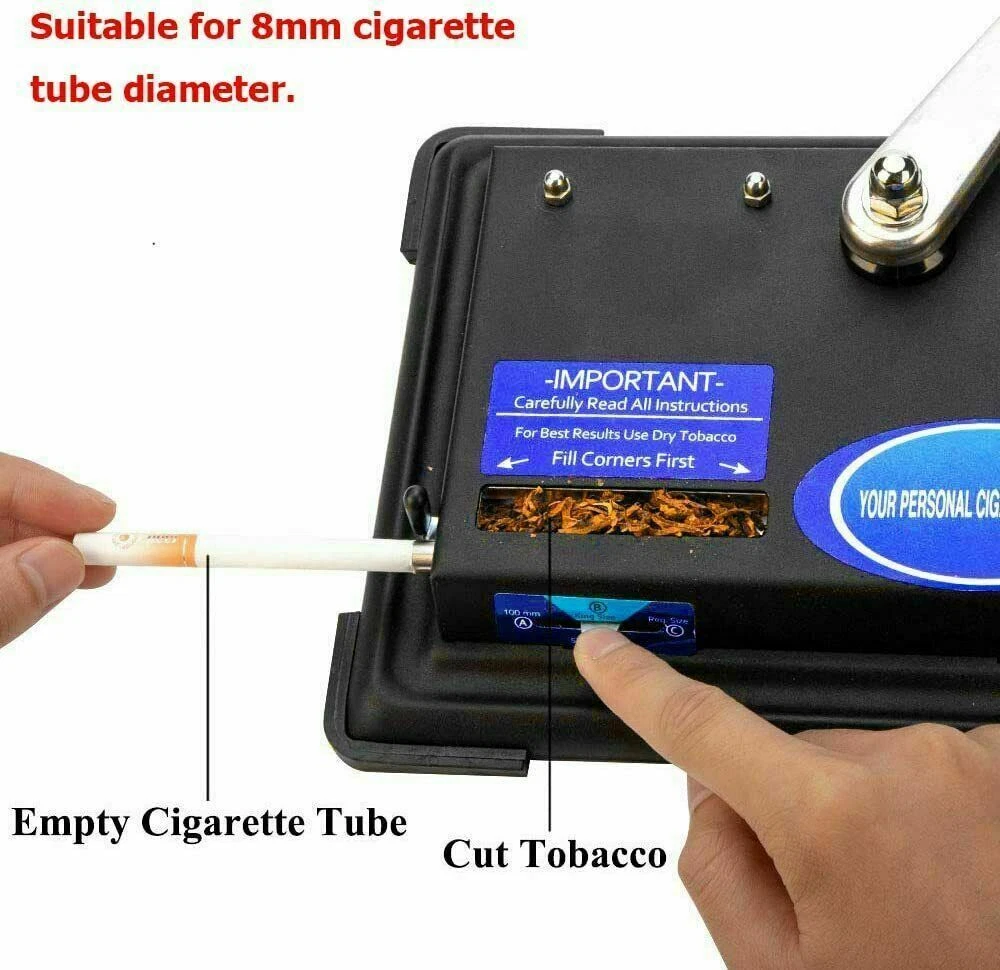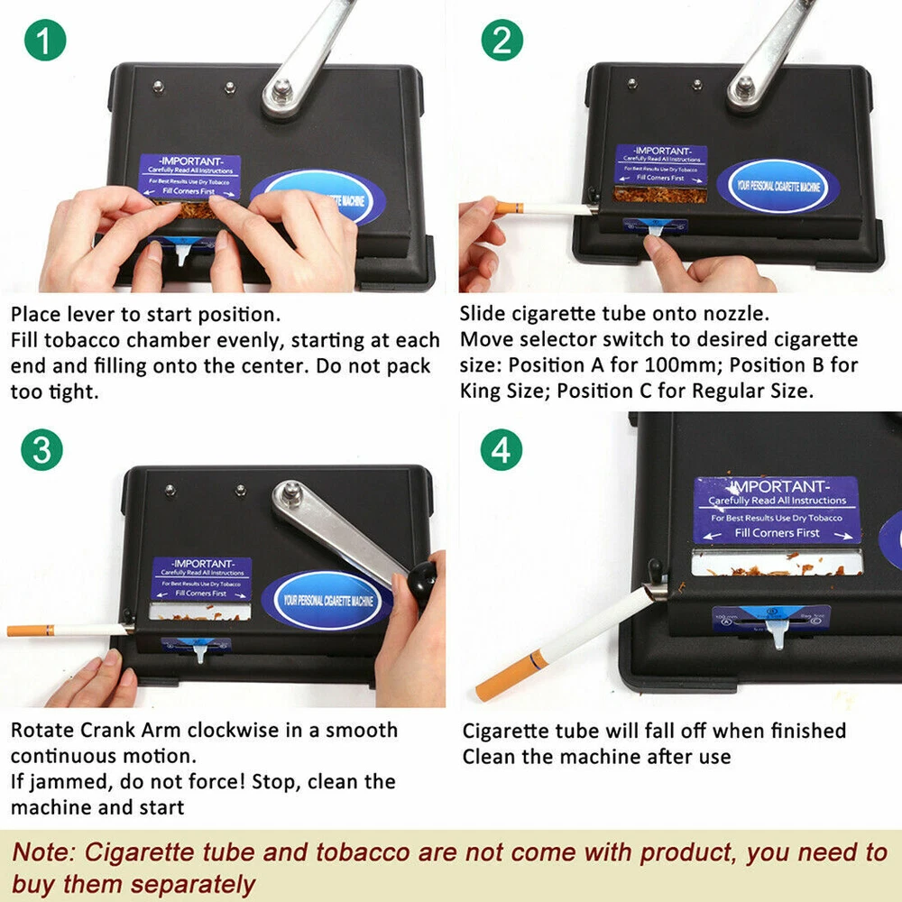 Portable Manual Cigarette Rolling Machine Tobacco Roller Injector Maker Easy Features: (1) Simply insert a cigarette tube into the nozzle, fill the tobacco chute, and rotate the crank arm to inject the tobacco into the tube. (2) This cigarette roller is lever action injection with an adjustable switch to allow 100mm, Kings, and Regular filtered tubes to be used. (3) The smooth handle and 4 good quality anti-slip pads on the rolling machine for tobacco ensure comfort and stability in use. (4) This is the perfect way to make your own cigarettes cheap and easy to use. (5) Ergonomically designed cigarette machine with non-slip underside. (6) Save money and it makes rolling your own cigarettes simple and easy. (7)Fit for 8mm diameter tube. Specification: Material: Iron with spray coating Color: Black Fit for 8mm diameter tube. Size: 25 x 19 x 4cm/ 9.8 x 7.4 x 1.6inch (L x W x H) Length of crank handles: 14cm/ 5.5inch Cigarette Size: 3 Standard (100, King, Regular) Function: Cigarette Making Operation: Hand Operate How to use: 1. Place lever to start position. Fill tobacco chamber evenly, starting at each end and filling onto the center. Do not pack too tight. 2. Slide cigarette tube onto nozzle. Move selector switch to desired cigarette size: Position A for 100mm; Position B for King Size; Position C for Regular Size. 3. Rotate Crank Arm clockwise in a smooth continuous motion. If jammed, do not force! Stop, clean the machine and start again 4. Cigarette tube will fall off when finished 5. Clean scattered tobacco after use Package included: 1 x Manual cigarette maker Notice: 1.Any problems,please contact us firstly.Thank you. 2.Please allow 0-1inch error due to manual measurement and make sure you do not mind before ordering. 3.Monitors are not calibrated same, item color displayed in photos may be showing slightly different from the real object. Please take the real one as standard. We only accept the payment by Paypal. Buyers are required to carefully follow payment instructions on the checkout page, and note down any necessary details on it (e.g. bank account details). If buyers fail to follow the instructions on the checkout page, We are not liable for any unidentified payments and subsequent delivery delays. If you are paying through Paypal using eCheck, note that your item can be shipped only after eCheck has cleared. All payments are expected within 4 days after the last winning auction is closed. A non-payment dispute will be opened if full payment is not received automatically. Our warehouse is located in US . All orders will be shipped from our US warehouse. Combined shipping discount is offered. Please kindly contact us freely if you need. Orders will be sent by Stand Delivery Free or Express Delivery with extra charge. Delivery times may vary, especially during peak periods. Delivery is not available during weekends or public holidays. All items will be shipped to the address on Ebay order. Buyers have full responsibility to provide us with the correct delivery address on the checkout page before payment is made. Re-delivery fee may be charged to buyers for items that are undelivered and/or returned to us due to incorrect delivery address or unsuccessful deliveries. If it is the buyer's personal reason to return the item, the return postage fee would be at buyer's charge. 30 days return and exchange is offered. Returns must be agreed by both parties prior to the actual return with 30 business days. Buyers must also strictly follow our returns procedure when returning an item. We reserves the rights to provide buyers a replacement, parts or a full or partial refund. Charges may apply if the product is damaged by buyers when the returned item is received. We make sure everything we do honors that connection – from our commitment to the highest quality items we can achieve, to the way we engage with our customers and communities to do business responsibly. You Are guaranteed to have your items delivered or your money back Shipment in US,Fast delivery guaranteed Features: (1) Simply insert a cigarette tube into the nozzle, fill the tobacco chute, and rotate the crank arm to inject the tobacco into the tube. (2) This cigarette roller is lever action injection with an adjustable switch to allow 100mm, Kings, and Regular filtered tubes to be used. (3) The smooth handle and 4 good quality anti-slip pads on the rolling machine for tobacco ensure comfort and stability in use. (4) This is the perfect way to make your own cigarettes cheap and easy to use. (5) Ergonomically designed cigarette machine with non-slip underside. (6) Save money and it makes rolling your own cigarettes simple and easy. (7)Fit for 8mm diameter tube. Specification: Material: Iron with spray coating Color: Black Fit for 8mm diameter tube. Size: 25 x 19 x 4cm/ 9.8 x 7.4 x 1.6inch (L x W x H) Length of crank handles: 14cm/ 5.5inch Cigarette Size: 3 Standard (100, King, Regular) Function: Cigarette Making Operation: Hand Operate How to use: 1. Place lever to start position. Fill tobacco chamber evenly, starting at each end and filling onto the center. Do not pack too tight. 2. Slide cigarette tube onto nozzle. Move selector switch to desired cigarette size: Position A for 100mm; Position B for King Size; Position C for Regular Size. 3. Rotate Crank Arm clockwise in a smooth continuous motion. If jammed, do not force! Stop, clean the machine and start again 4. Cigarette tube will fall off when finished 5. Clean scattered tobacco after use Package included: 1 x Manual cigarette maker Notice: 1.Any problems,please contact us firstly.Thank you. 2.Please allow 0-1inch error due to manual measurement and make sure you do not mind before ordering. 3.Monitors are not calibrated same, item color displayed in photos may be showing slightly different from the real object. Please take the real one as standard. PAYMENT We only accept the payment by Paypal. Buyers are required to carefully follow payment instructions on the checkout 