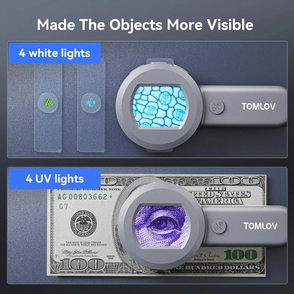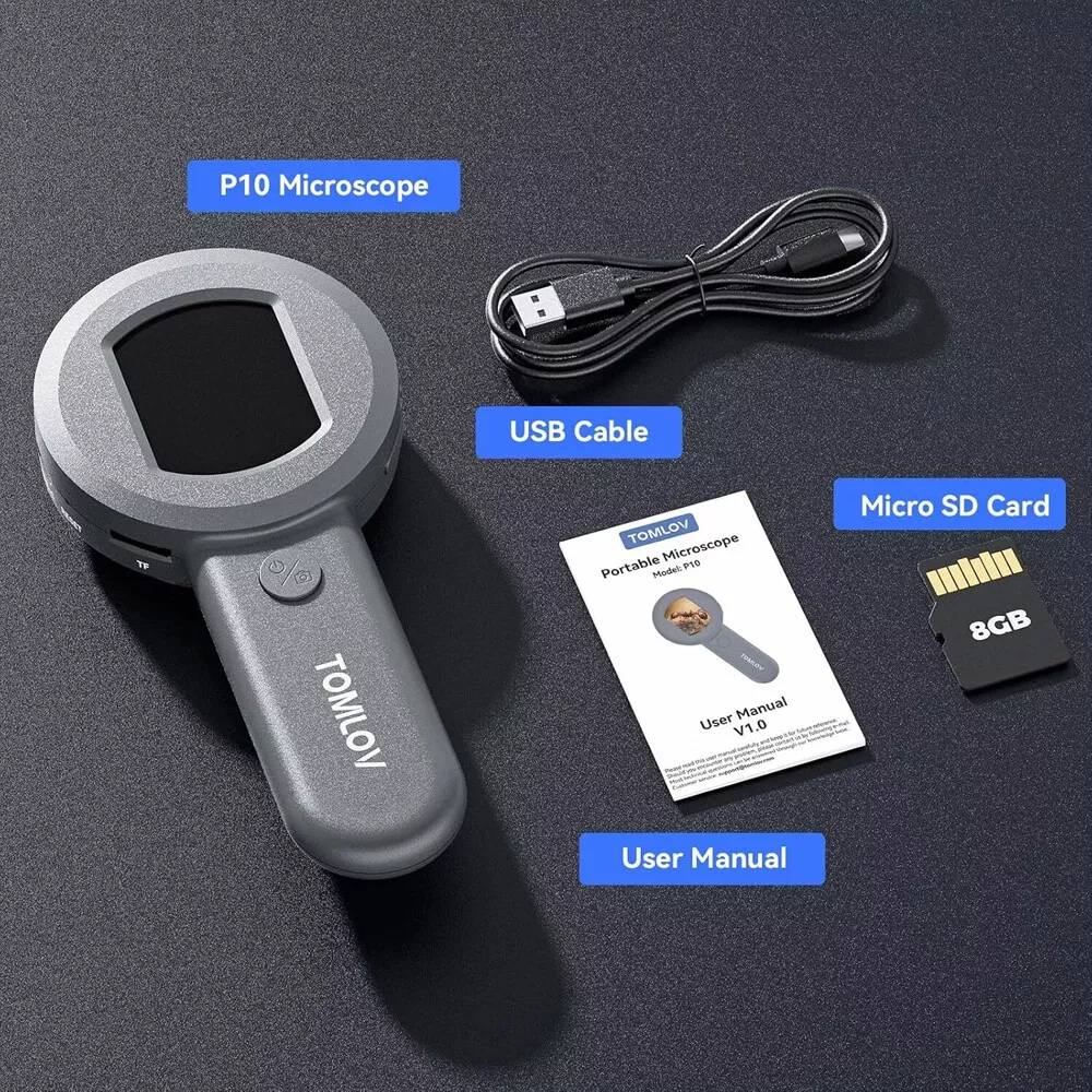 【Visible & Shareable 2" LCD Screen】 P10 miniscope takes seriously close-up, clear shots of everything. You can use this kids' microscope live on the screen with a great, clear picture. Compared to other pocket microscopes, the easy-sharing screen greatly enhances the fun of exploring nature. 【Mini & Lightweight Design】 The little microscope weighs only 3.9 oz, easily fits into your pocket for portability. Ideal for hobbyists, jewelers, and nature enthusiasts who need a reliable magnification tool anywhere they go. Kids can share lots of fun looking close up at nature in the park and at the creek now! 【Easy to Operate】This pocket scope is designed for user-friendliness. With a fixed 100x magnification, there's no need to adjust settings. Simply power on the mini scope, place the illuminated magnifier about 0.3 inches from the object, and you'll get a clear 100x magnified image! It's easy for both kids and adults to use. A handy tool for micro things. 【Powerful 100X Magnification】If you work with small items and really need to see up close, this is the loupe magnifier for you. The 100X fixed magnification provides a very clear view of the ring letters. It's nice to have a digital magnifier for jewelry, diamonds, gems, coins, stamps, and rocks to know if you've got the real deal. With great size and optics, all housed in a rugged case, it's an essential tool for anyone who needs precise inspection. 【4 White Lights + 4 UV Lights】When the electron magnifying glass with light turns on, the LEDs that illuminate the image light up below the lens making it easy to see what you are looking at. You can switch the light from white lights or UV light according needs. (NOTE: The brightness is unadjustable) 【16MP Camera & 8GB SD Card】With the ability to capture high-resolution 16MP images, it facilitates detailed documentation of microscopic specimens, making it an invaluable tool for scientific research, education, and personal exploration. Whether you're a student, scientist, hobbyist, or educator, a mini microscope camera provides an immersive and interactive way to explore the microscopic world, fostering curiosity and discovery. 【PC Connection for Large Viewing】Plugging it into a computer unlocks a whole new realm of possibilities. This usb microscope easily connects to a computer for use on a larger scale. Therefore, you can view large images on a large screen. You can also easily document and upload them to the internet! 【Built-in Rechargeable Battery】The 500mAh battery offers up to 50 minutes of working time and enhanced portability, allowing for usage in various settings, including outdoor environments, classrooms, and field research. Independence from electrical outlets, users can explore and observe specimens without constraints, making it ideal for on-the-go exploration. 【A Wonderful Offering】 It's incredibly user-friendly. Great digital microscope for kids science discovery. Totally recommend this to any parent who wants to fan that flame of learning science and get their kids to enjoy learning and off of tv and video games for a bit. This is clearly an excellent birthday/Christmas offering for Childrens What's in the box 1x P10 portable microscope 1x 8GB Micro SD Card 1x USB Cable 1x Manual