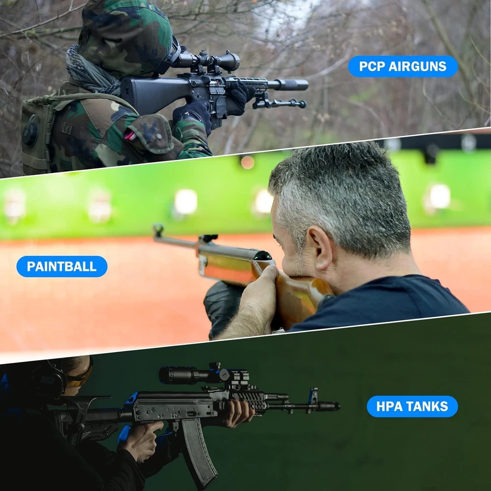 Product Description Package included: 1 x PCP Air Compressor 1 x AC Power Cord 1 x Battery Clip Cord 1 x Air Hose 1 x Accessory Kit 1 x Detailed Instruction Portable PCP Air Compressor-4500PSI High performance and durable This is a brand new PCP air compressor with fast charging speed. It takes about 18 minutes to inflate a 0.5 liter cylinder from 0 to 300 bars. The compressor has the characteristics of excellent performance, easy operation and simple maintenance, which can be powerer by AC 110V or car DC 12V. The rated power is 350 watts. It can easily handle air gun inflation at home or in the wild. Auto-stop Built-in Adapter Oilless and Waterless Efficient Cooling Fan Large Filter Newly Upgraded Portable Car or Home PCP Air Gun Compressor: BUILT-IN POWER ADAPTER can be powered by the 12V car battery, also can be powered by the home 110V/220V AC. Inflate your equipment PCP air rifles, air pistols, paintball guns, and HPA tanks anywhere and make it ready for action anytime. 8MM Quick Connector & Oil-Water Separator: The inflation nozzle is a 8MM female port, which can be quickly connected and disconnected. It is suitable directly for nipples of PCP air rifles/pistols and paintball tanks.The activated carbon separator on the hose can be used repeatedly. It can efficiently filter oil and water in the air and output clean and dry high-pressure air. Water/Oil-Free & Oil-Moisture Filter: There is no need to add oil and circulating cooling water, which reduces the trouble of connecting an additional water pump and simplifies the operation. The built-in high-power fan can improve the cooling efficiency greatly and make the compressor fill your airgun continuously. The temperature monitoring function is added this time. When the temperature reaches 90 degrees, please shut off the compressor for cooling and keep the cooling fan running. Features & Details Newly Upgraded Portable Car PCP Air Gun Compressor: BUILT-IN POWER ADAPTER can be powered by the 12V car battery, also can be powered by the home 110V/220V AC. Inflate your equipment PCP air rifles, air pistols, paintball guns, and HPA tanks anywhere anytime.The Air Compressor can easily achieve 300Bar/4500Psi/30Mpa.It is recommended that the air cylinder volume is limited to 1L (60ci).The net weight is 5-8 kg.The top side is slightly larger than your open palm convenient to carry and store. Oil/Water-Free & Oil-Moisture Filter: The Air Compressor no need to add oil and circulating cooling water, which reduces the trouble of connecting an additional water pump and simplifies the operation.Instead, a high-power side fan is built-in to dissipate heat. An oil-moisture filter has been integrated at one end of the hose. It can efficiently prevent oil and moisture from corroding your airguns or air tanks. 8MM Quick Connector & Oil-Water Separator PCP Air Compressor: The inflation nozzle is a 8MM female port, which can be quickly connected and disconnected.The activated carbon separator on the hose can be used repeatedly. Inflating Speed: 500CC tank, from 200BARS to 300BARS takes about 7-9 minutes;The duty cycle of this pump is: continuous inflation for 25 minutes and rest for 10 minutes. The rated power of this air compressor is 350W. Small Weight & Compact size & high quality: The Air Compressor net weight is 5-8 kg.The top side is slightly larger than your open palm convenient to carry and store. What you will get: 1 x PCP Air Compressor,1 x AC Power Cord,1 x Battery Clip Cord,1 x Air Hose,1 x Accessory Kit,1 x Detailed Instruction. Every compressor from us has a one-year worry-free warranty. Providing customers with high-quality products and services is our constant pursuit.