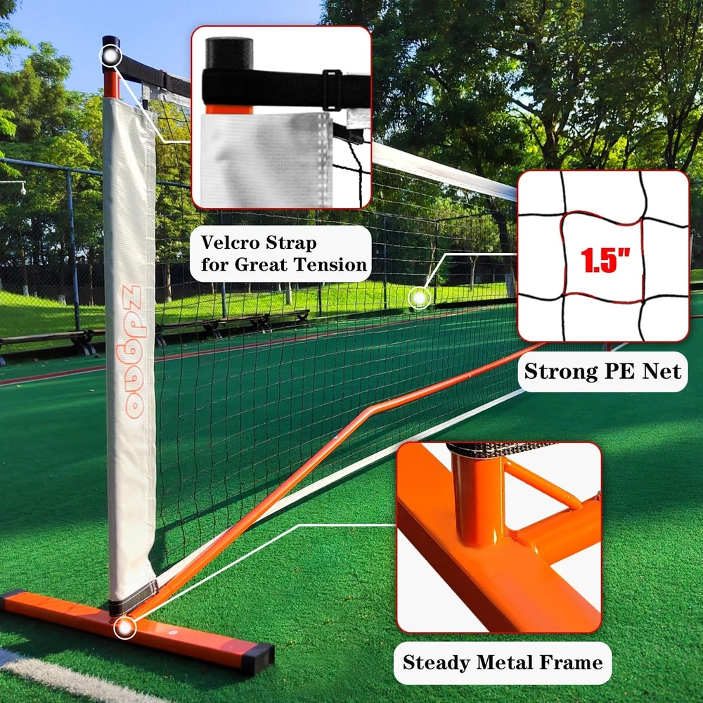 PORTABLE PICKLEBALL NET REGULATION SIZE: the pickleball net is 22ft wide, 36” high at sideline and 34” high at the center, the pickleball set with net meets all USAPA portable pickleball net regulations. INSTANT ASSEMBLY PICKLEBALL NET SYSTEM. The interlocking design with numbered pieces and assemble instruction make assembly easy and quick, as well as a step by step visual instruction manual. This pickle ball set also packed with 2 pairs FIBERGLASS LIGHTWEIGHT pickle ball paddles with comfort handle grip and build-in toggle. 600D Oxford fabric carry bag with handles, could be transported or stored at many places. Pack List: 1x pickleball net in 22ft length 1 x pickleball net frame in official size 4 x lightweight fiberglass pickleball paddles 6 x outdoor pickle balls (in green and orange colors) 1 x set of pickleball court marking kit (4pcs L shape and 8pcs T shape) 1 x soft measure tape 1 x durable carrying bag PICKLEBALL NET WITH PADDLES, PICKLEBALLS AND COURT LINE MARK, COMPLETE SET: This pickleball set includes official size pickleball net, 6 outdoor pickleball balls (40-holes), 4 deluxe fiberglass pickleball paddles, a complete set of pickleball court marking kit, a soft measure tape (4 meter length), and a durable carry bag for easy transport. FIBERGLASS PICKLEBALL PADDLES SET OF 4: With a honeycomb core and a fiberglass finish, these pickle ball paddles can provides excellent spin to improve your skill level on the field. Our pickle ball racket provides more sweet spots for the shot. With edge guard designed to protect pickle ball paddles from damage. PLAY ANYWHERE: With this durable pickleball court marking kit and measure tape, players can set up a pickle ball court on any flat surface, both indoors and outdoors. The net and poles are designed for durability and stability, ensuring a consistent playing experience. STEADY AND RELIABLE, This pickleball set with net has steel frame features wide post bases and a center stabilizer to ensure that it does not tip or fall over easily. Also, velcro straps on the top of two side helps maintain the net in tension even after a long time use. FUN FOR ALL AGES: Pickle ball is a fun and exciting sport that can be enjoyed by people of all ages and skill levels, making this set a great way to get the whole families involved.