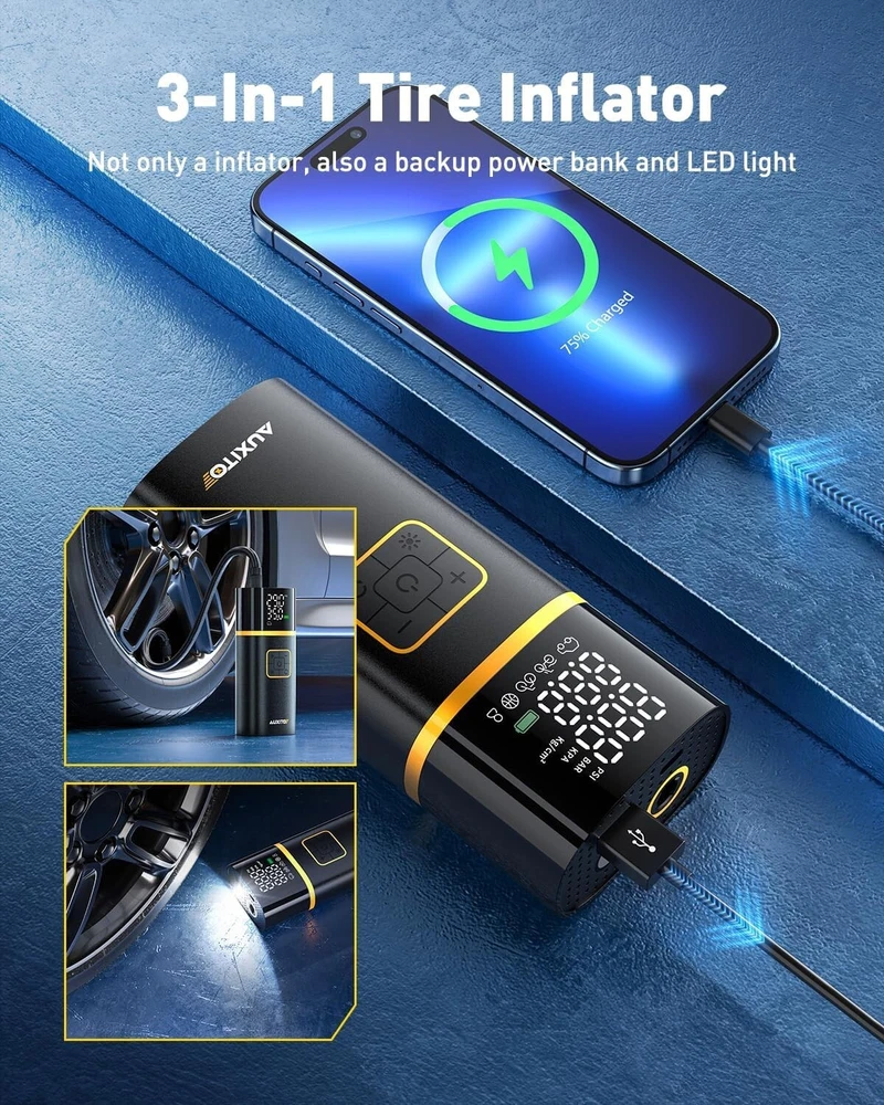 This tire pump is a game-changer for road trips! It inflates tires super fast, even from flat, and the rechargeable battery lasts forever. The LED light is super handy for nighttime emergencies, and it’s so compact it fits anywhere. No more struggling with bulky pumps—this one’s a must-have for every car!