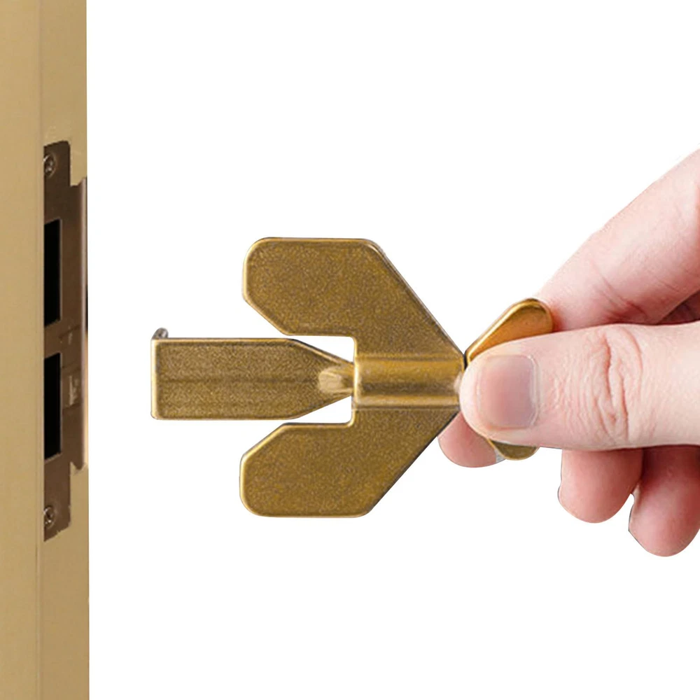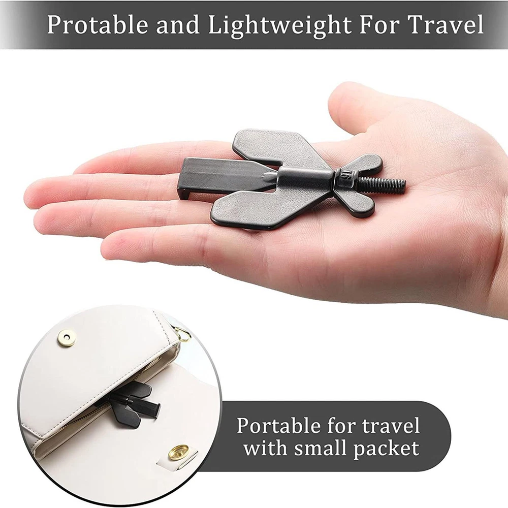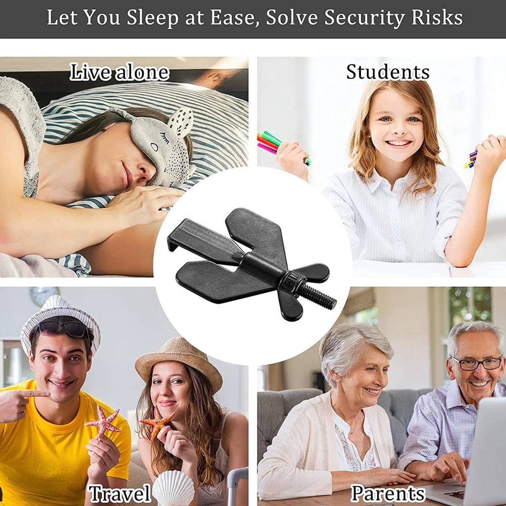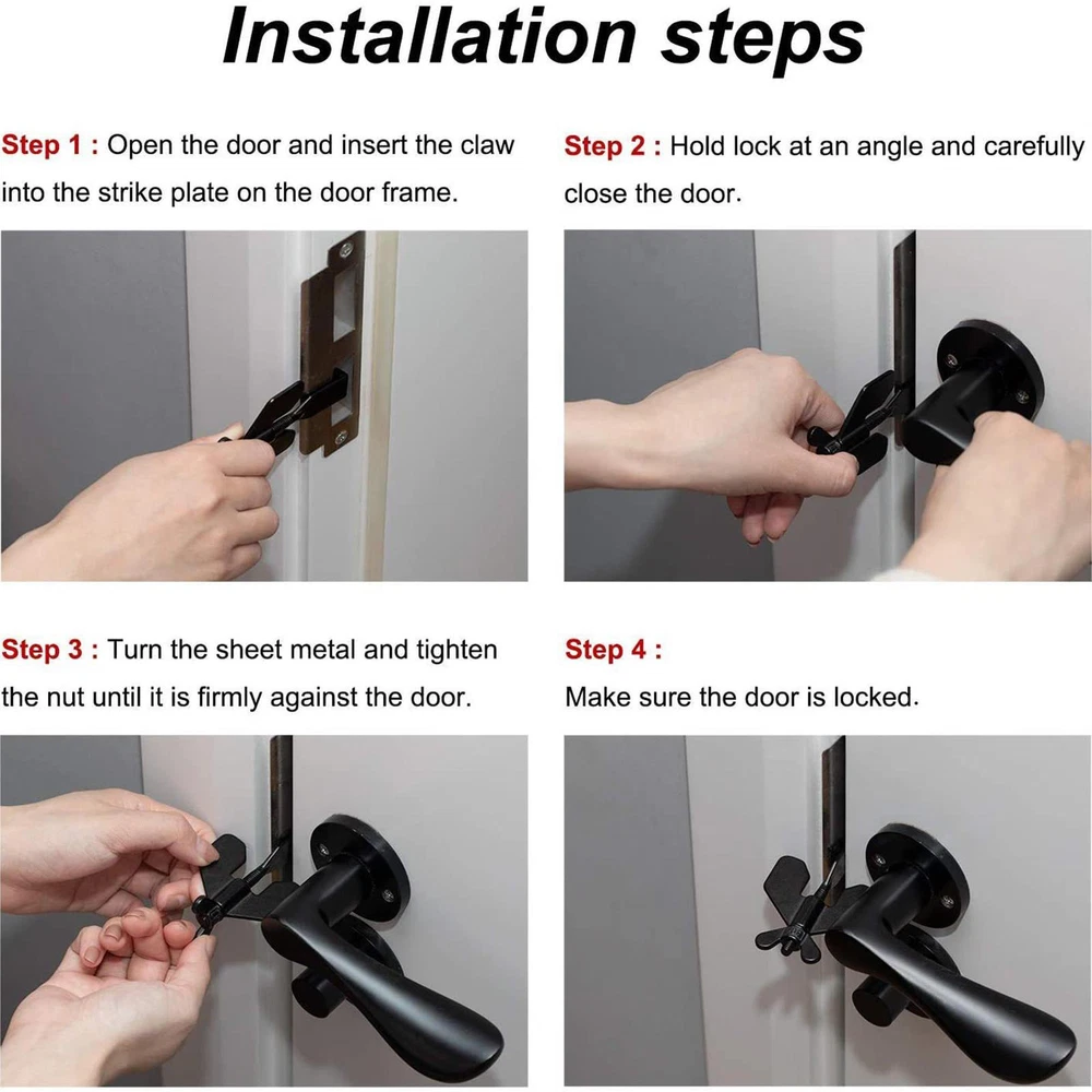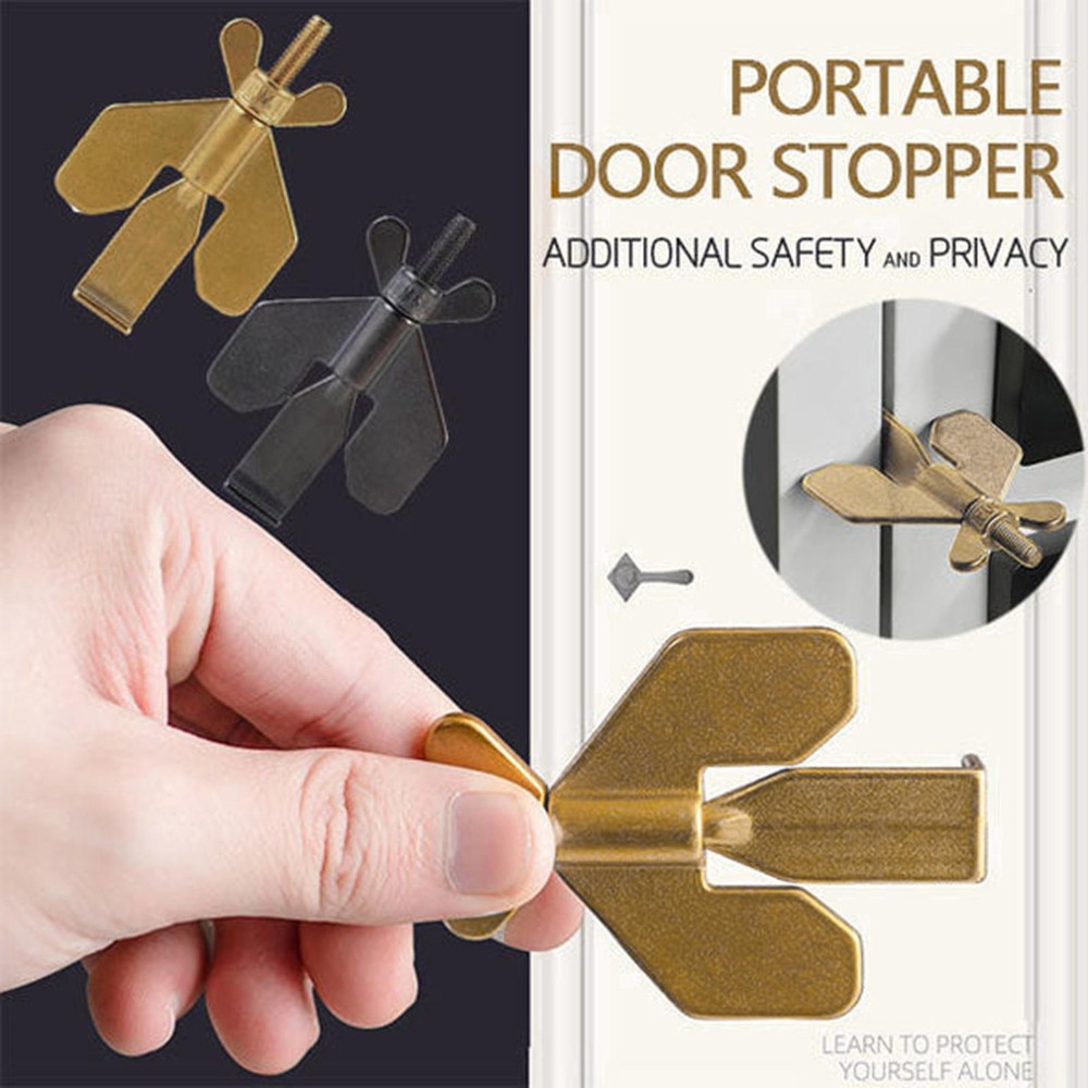 Bullet Points: [ Additional Security and Privacy: ] Door Lock Stopper especially when traveling or staying alone in a hotel, will securely close your door and allow you to sleep peacefully., cannot be opened from the outside, even with a key. [ Wide Compatibility: ] Door Stoppers Security can also be used to keep pets out and prevent children from opening doors to strangers., perfect for hotels, dormitories, apartments, bathrooms, bedrooms, or private rooms, and fits most types of door locks. [ Handy to Use: ] Pocket Door Lock is only for doors that open inward, the door seam must be greater than 0.12 inches to ensure that it will not block a single door, and doors without seams cannot be used, small and lightweight compared to other portable locks that can be carried in a pocket or handbag to provide self-protection, easy to install or remove without any tools. [ Solid Lock: ] Travel Door Lock is made of strong and durable metal, can serve you for a long time, 304 stainless steel precision casting thickened, strong enough not to bend under the force, greatly improving security and preventing unauthorized access. [ Upgrading Design: ] More stable after installation, Door Security Lock is novel and unique, bringing you extra safety, security, and privacy, threaded and fixed. Description: Door Stopper Lock is made of quality metal that is durable and heavy-duty, suitable for long-time use. 1. Provide additional security and privacy. 2. Fits most types of door locks. 3. Novel and unique. Properties: Product Name: Portable Travel Door Lock Material: Stainless steel Color: black, golden color Size: as shown in the figure Application: Entrance Anti-theft door: Portable door lock for family safety A single white box size: about 8.5x5.5x2cm/3.34*2.16*0.78inch, weighing about 70g; Packing list: 1X portable travel door lock 1X storage bag