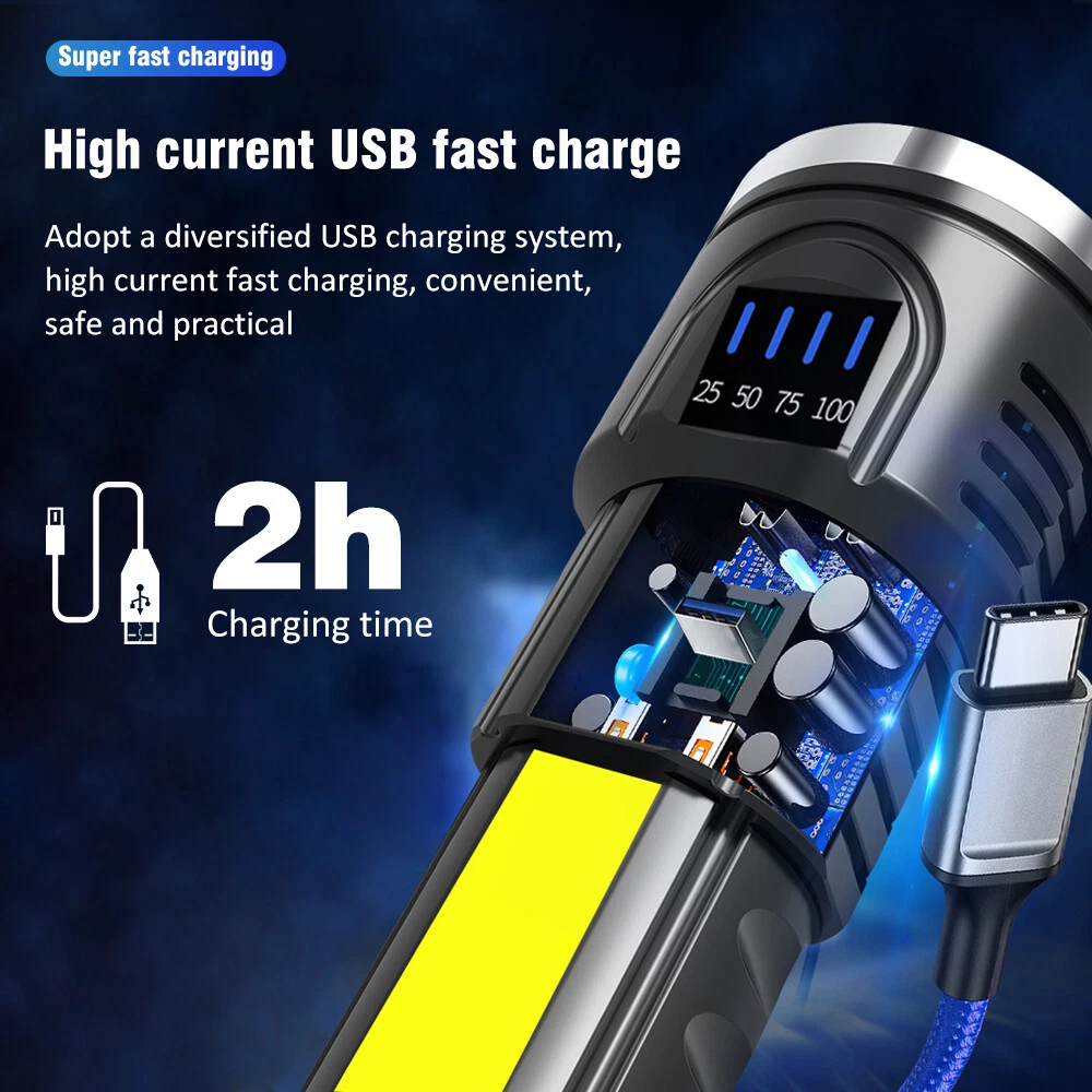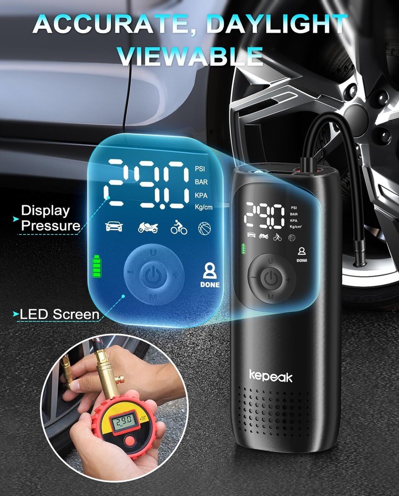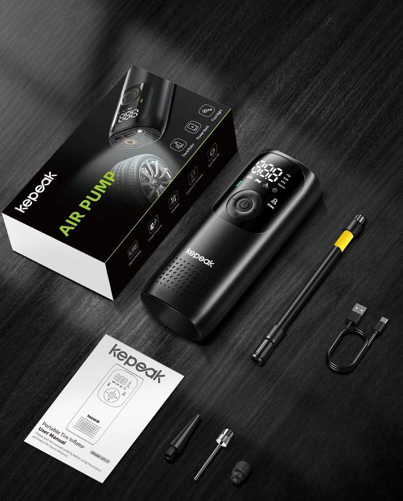 Note: Model B Only USB Flashlight,not include Cordless Tire Inflator Pump!!!! A: Cordless Tire Inflator Pump About this item [One-Click Operation, Auto-stop] You can select from (bicycle, motorcycle, car, ball, custom) 4+N preset modes, and 4 preset units (PSI, KPA, BAR, KG/CM²), which makes this portable tire inflator for car super user friendly. With its one-button design, the portable tire inflator starts inflating with just a simple press. Once the desired pressure is reached, the tire inflator portable automatically stops, no more having to drive to the gas station [Accurate, Daylight Viewable LED Screen] Easy to read even under sunlight, the digital screen displays the target value first, flashes for 3s, and then shows the real-time pressure, the built-in pressure gauge of tire pump with +/- 1.5 PSI accuracy, this car tire air pump portable allowing you to inflate tires to the desired pressure level precisely, don't overinflate or underinflate your tires [All in One Device - Tire Inflator, Flashlight, Power Bank] Not only for tire inflation, 3 modes LED light provide convenience for inflating and changing tires in the dark. USB-C input and USB-A output port, as an emergency power pack for your phone. The car air pump is designed to be practical and hassle-free in any situation [Cordless Inflation, Sto re with Ease] Wireless battery-charged design enables the car tire pump to have easier air inflation. Weighing only 0.93 pounds, the compact size and lightweight tire air pump is convenient to carry around or store in your glove box, trunk, bicycle rack, car, or backpack [Supports Presta Schrader Valve] The air pump for bike tires comes with a Presta valve, connecting the hose directly to Schrader valves, ball needles, and swim rings nozzle, the variety of nozzle attachments included make the tire pump for car portable versatile enough to handle your inflation needs, such as bikes, motorcycles, cars, balls, and small floats Does the tire inflator air compressor support Presta valves? Yes, this bike pump portable come with a presta valve adapter. Which nozzle do I use this car tire air compressor to fill my car tires? Use the nozzle on the hose, this cordless tire pump is no need other attachment for car tires. Is this car tire pump portable suitable for inflating bike tires, motorcycle tires, car tires? Yes, this cordless inflator is suitable for inflating bike tires, motorcycle tires, car tires. it includes a Presta valve adapter, allowing it to be used as a bike tire compressor. Does this portable car compressor automatically shut off when desired pressure is reached? Yes, this portable car pump is easy to use and it will automatically shut off once the desired pressure is reached. =========================================== B: USB Bright Flashlight Feature: 1.USB Rechargeable: Micro USB charging port, supports multiple charging methods, making charging more convenient. 2.Four-level Real-time Power Display: Charging indication: the blue light flashes when charging and stops flashing after fully charged. 3.4 Lighting Modes: strong light-low light-strobe-COB side light. 4.Built-in Large-capacity Battery: 1200mAh lithium battery will allow this headlight to provide long lighting time. 5.Durable to Use with Great Performance: High-quality and high-strength ABS mater ial, large aluminum reflector, high light-gathering performance, enhanced long-distance effect, can emit comfortable and smooth spots. 6.Fast Heat Dissipation: Thick aluminum lamp cup, large area heat dissipation design. 7.Waterproof Design: Waterproof design allows this headlight to be suitable for outdoor use, especially in rainy days, but cannot be immersed in water. 8.Wide Application: It is suitable for outdoor activities, such as fishing, hunting, climbing and camping. Specification: Type: USB Rechargeable Camping Headlight Size: 145.5 * 57mm Waterproof Grade: IPX4 Battery Capacity: 1200mAh 4 Lighting Modes: strong light-low light-strobe-COB side light Micro USB charging port, supports multiple charging methods. Four-level real-time power display, charging indication: the blue light flashes during charging, stops flashing, charging is complete. Four lighting modes, strong light-low light strobe flash-core rod bright side light. Built-in large capacity rechargeable lithium-ion battery. High-quality high-strength absorbing material, large aluminum reflector, high light-gathering performance, enhanced long-distance effect, can emit a comfortable and soft spot. Transparent thick aluminum cup, large area heat dissipation design. Portable flashlight, size as picture, service life waterproof ipx4, not immersed in water. Package Included: 1 * Flashlight 1 * USB Charging Cable