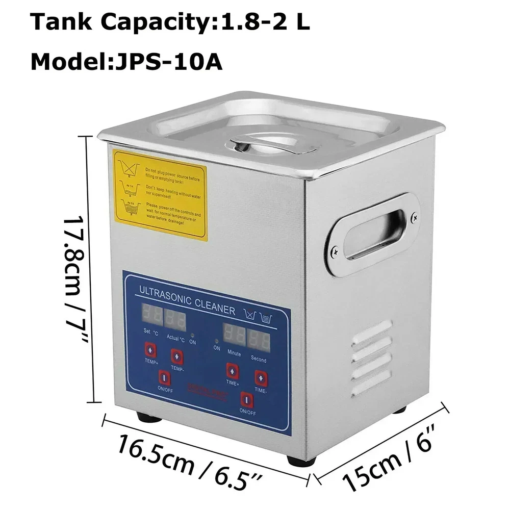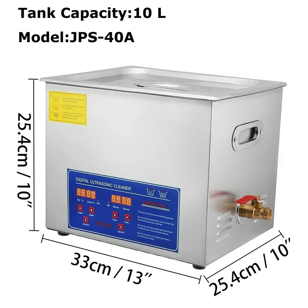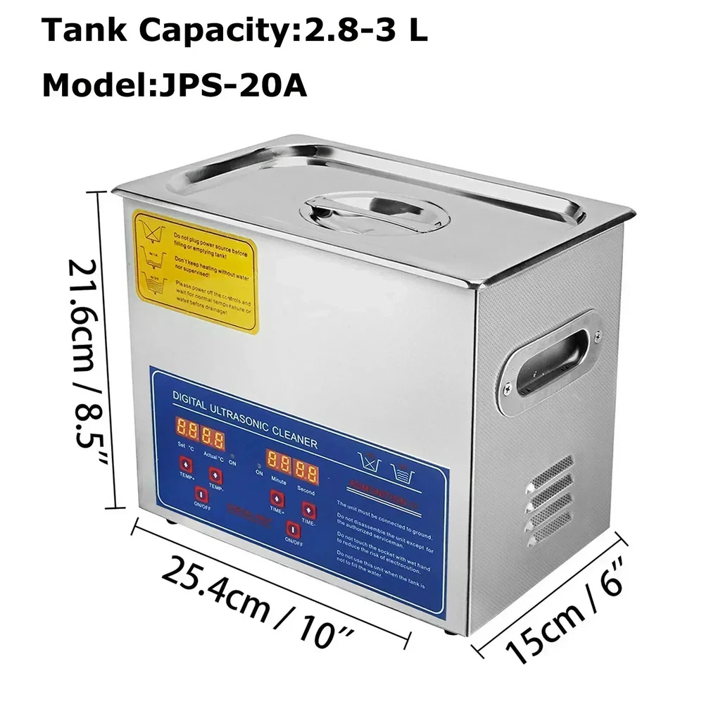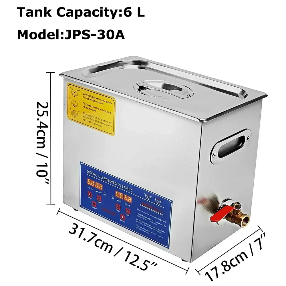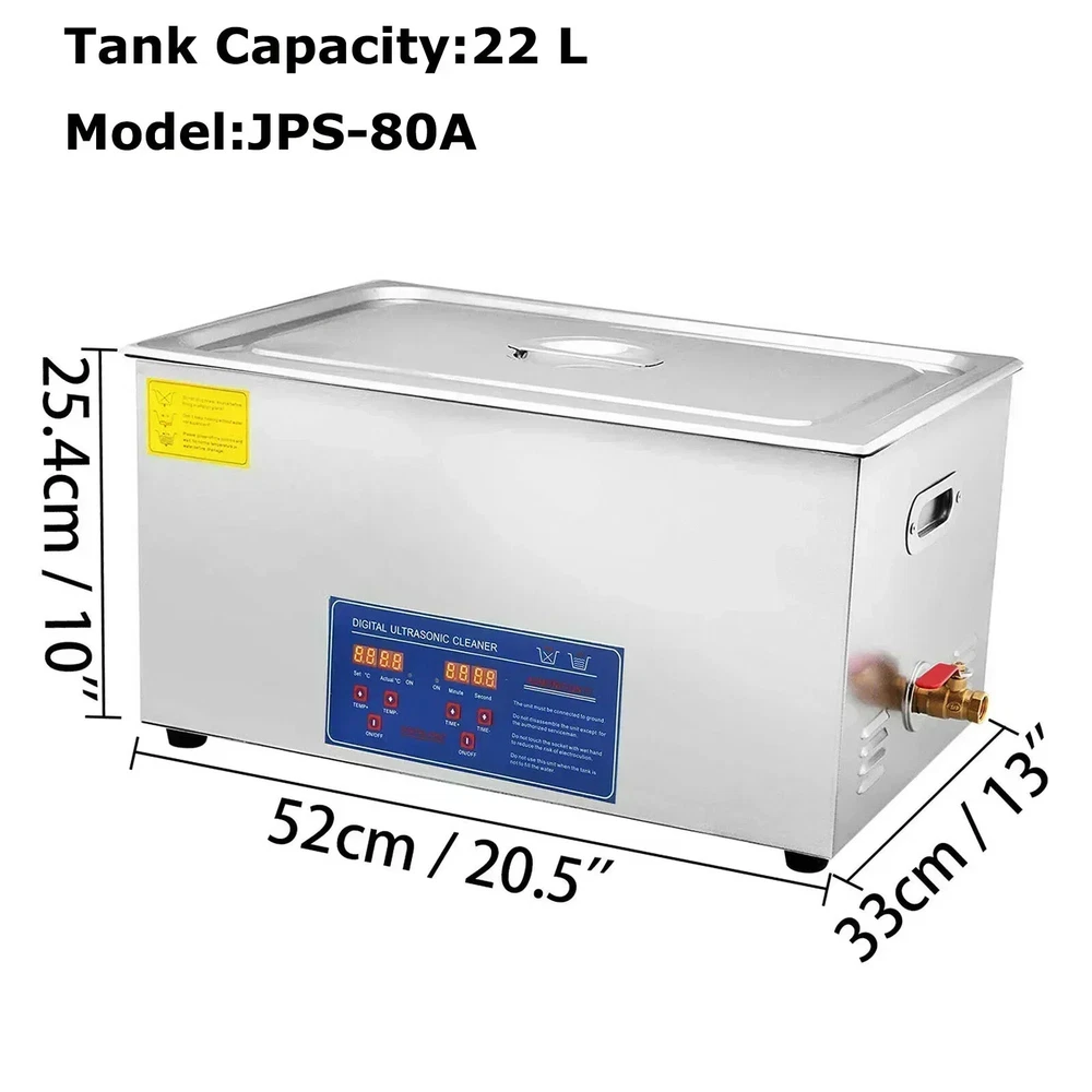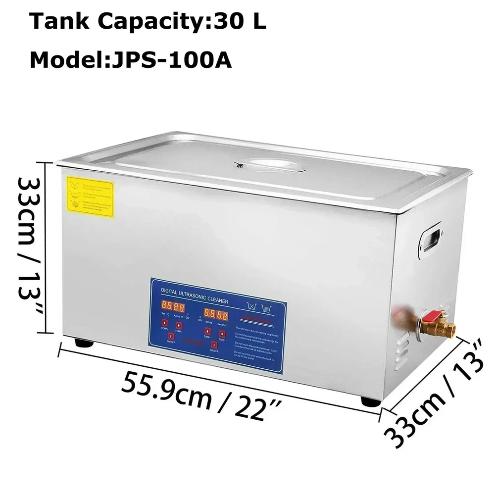 Product Description 1.3-30L Digital Ultrasonic Cleaner Get a professional diamond ring cleaner at home!!! 40KHZ ultrasonic wave, deeply wash dirt, grime, oil on your valuable's surface, long hole, crevice, and shelter. Silver jewelry cleaner is ideal equipment for the optical shop, jewelry shop, watch shop, mobile phone repair shop, dental, office, home, and other stuff. 40kHz Deep Cleaning Digital Control Panel Premium SUS304 Material User-Friendly Design Why Choose it? Premium Tough Quality Incredibly Low Prices Fast & Secure Delivery 30-Day Free Returns 24/7 Attentive Service Key Features 40kHz Frequency With the 40kHz ultrasonic frequency and powerful transducer, our ultra jewelry cleaner does well in cleaning stuff with complex shapes, holes, or long-time stains. Adjustable Time/Temp Time is adjustable from 0 to 30 min, and temperature can be set within RT-176℉/RT-80℃, displayed on LED screens. The heating function dramatically improves cleaning efficiency. 1.3/2/3/6/10/15/22/30 L Tank Capacity The sonic jewelry cleaner features a sizeable 1.3/2/3/6/10/15/22/30L(0.34/0.53/0.8/1.6/2.6/4/5.8/8 gal) tank, coming with a cleaning basket and a ball-shaped jewelry cleaning basket to reduce friction during washing. 304 Stainless Steel This ultrasonic parts cleaner is made from 304 stainless steel with a noise reduction lid and built-in handles on both sides, designed for durable use and easy cleaning. Humanized Details Heat dissipation holes on the side and back are designed for overheat protection, and a spare fuse is provided in case of over-current. The water outlet valve is convenient for drainage. Versatile Uses Perfect for home or professional use, our ultrasound cleaner machine is widely used to clean jewelry, glasses, watches, metal tools, dental equipment, lab utensils, etc. 30L Specifications Tank Material: Stainless Steel SUS304 Heating Power: 600W Ultrasonic Power: 600W Frequency: 40kHz Power Supply: AC110/220V 60Hz Tank Capacity: 26-30L (Since the bottom of the ultrasonic cleaner is a curved surface, the actual volume will be smaller.) Maximum Working Water : 22.37L Minimum Working Water : 5.32L Time Setting: 0 - 30 minutes (LED Digital Display) Temperature Setting: RT-176℉/RT-80℃ Transducer Quantity: 10 sets Tank Size (L x W x H): 19.69" x 11.81" x 7.87"/50 x 30 x 20 cm Product Size (L x W x H): 23" x 13" x 13.1"/58.5 x 33 x 33.3 cm Package Content 1 x Ultrasonic Cleaner 1 x Cleaning Basket 1 x Ball-Shaped Cleaning Basket 1 x Stainless Steel Cover 1 x Outlet Pipe 1 x Power Cord 1 x Instruction Manual 22L Specifications Tank Material: Stainless Steel SUS304 Heating Power: 600W Ultrasonic Power: 480W Frequency: 40kHz Power Supply: AC110/220V 60Hz Tank Capacity: 19-22L (Since the bottom of the ultrasonic cleaner is a curved surface, the actual volume will be smaller.) Maximum Working Water: 18.32L Minimum Working Water : 5.32L Time Setting: 0 - 30 minutes (LED Digital Display) Temperature Setting: RT-176℉/RT-80℃ Transducer Quantity: 8 sets Tank Size (L x W x H): 19.69" x 11.81" x 5.91"/50 x 30 x 15 cm Product Size (L x W x H): 23" x 13" x 11"/58.5 x 33 x 28 cm Product Weight: 27.8 lbs/12.6 kg Package Content 1 x Ultrasonic Cleaner 1 x Cleaning Basket 1 x Ball-Shaped Cleaning Basket 1 x Stainless Steel Cover 1 x Outlet Pipe 1 x Power Cord 1 x Instruction Manual 15L Specifications Tank Material: Stainless Steel SUS304 Heating Power: 400W Ultrasonic Power: 360W Frequency: 40kHz Power Supply: AC110/220V 60Hz Tank Capacity: 13.5-15L (Since the bottom of the ultrasonic cleaner is a curved surface, the actual volume will be smaller.) Maximum Working Water: 11.2L Minimun Working Water: 3.65L Time Setting: 0 - 30 minutes (LED Digital Display) Temperature Setting: RT-176℉/RT-80℃ Transducer Quantity: 6 sets Tank Size (L x W x H): 13" x 11.81" x 5.91"/33 x 30 x 15 cm Product Size (L x W x H): 15.75" x 13.78" x 11"/40 x 35 x 28 cm Package Content 1 x Ultrasonic Cleaner 1 x Cleaning Basket 1 x Ball-Shaped Cleaning Basket 1 x Stainless Steel Cover 1 x Outlet Pipe 1 x Power Cord 1 x Instruction Manual 10L Specifications Tank Material: Stainless Steel SUS304 Heating Power: 250W Ultrasonic Power: 240W Frequency: 40kHz Power Supply: AC110/220V 60Hz Tank Capacity: 9.6-10L (Since the bottom of the ultrasonic cleaner is a curved surface, the actual volume will be smaller.) Maximum Working Water:7.41L Minimun Working Water:1.91L Time Setting: 0 - 30 minutes (LED Digital Display) Temperature Setting: RT-176℉/RT-80℃ Transducer Quantity: 4 sets Tank Size (L x W x H): 11.81" x 9.45" x 5.91"/30 x 24 x 15 cm Product Size (L x W x H): 15" x 11" x 11.4"/38 x 28 x 29 cm Package Content 1 x Ultrasonic Cleaner 1 x Cleaning Basket 1 x Ball-Shaped Cleaning Basket 1 x Stainless Steel Cover 1 x Outlet Pipe 1 x Power Cord 1 x Instruction Manual 6L Specifications Tank Material: Stainless Steel SUS304 Heating Power: 200W Ultrasonic Power: 180W Frequency: 40kHz Power Supply: AC110/220V 60Hz Tank Capacity: 5.8-6L (Since the bottom of the ultrasonic cleaner is a curved surface, the actual volume will be smaller.) Maximum Working Water: 4.82L Minimun Working Water: 1.25L (Since the bottom of the ultrasonic cleaner is a curved surface, the actual volume will be smaller.) Time Setting: 0 - 30 minutes (LED Digital Display) Temperature Setting: RT-176℉/RT-80℃ Transducer Quantity: 3sets Tank Size (L x W x H): 11.81" x 5.91" x 5.91"/30 x 15 x 15 cm Product Size (L x W x H): 15" x 7.9" x 10.8"/37.5 x 20 x 27.5 cm Package Content 1 x Ultrasonic Cleaner 1 x Cleaning Basket 1 x Ball-Shaped Cleaning Basket 1 x Stainless Steel Cover 1 x Outlet Pipe 1 x Power Cord 1 x Instruction Manual 3L Specifications Tank Material: Stainless Steel SUS304 Heating Power: 100W Ultrasonic Power: 120W Frequency: 40kHz Power Supply: AC110/220V 60Hz Tank Capacity: 2.8-3L (Since the bottom of the ultrasonic cleaner is a curved surface, the actual volume will be smaller.) Maximum Working Water: 2.05L Minimum Working Water: 0.9L Time S