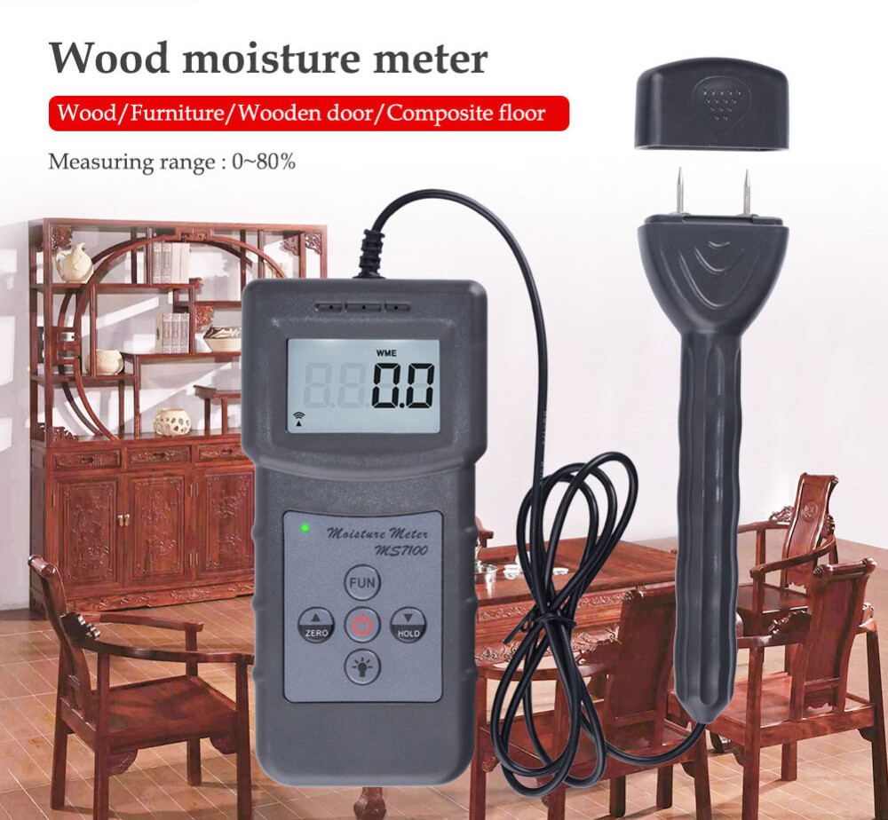 Portable Moisture Meter Analyzer Tester For Wood Furniture Flooring bamboo !!!Shipping Policy : Battery not included during the shipping!!! wood moisture meter: mainly used for measuring the water content of wood products, by the vast number of users has the following products used for measuring wood moisture content: wood, furniture, flooring, wooden doors, wooden pallets, wood flooring, composite flooring, bamboo flooring, wood sticks, wood, wood, plate, mahogany, wood products, packaging boxes, chopping board, plywood, wood powder, bamboo, wood, plywood, MDF, MDF, wood, wood, wood, wood, bamboo, wooden handle, etc. more than 150 kinds of domestic and international wood moisture content. The instrument adopts advanced integrated circuit the sensor technology and international advanced electronic components development, high measuring accuracy, stable performance, is the ideal choice for furniture and wood products industry to detect the moisture content of the product. Technical Specifications *Display mode: 4 bit backlit LCD display with LCD *Measuring range: 0~80% *Display accuracy: 0.1 *Measurement environment: Temperature: -10℃~60℃ Humidity: 5%~90% *Measuring principle: conductance method, temperature compensation *Accuracy: ±0.5% *Response time: 1 second * Power supply: 4x1.5V AAA (UM-4) battery (Battery not included in the package) *Volume: host: 140mm * 60MM * 24mm; handle: 150mm * 40MM * 20MM *Net weight: about 175 grams