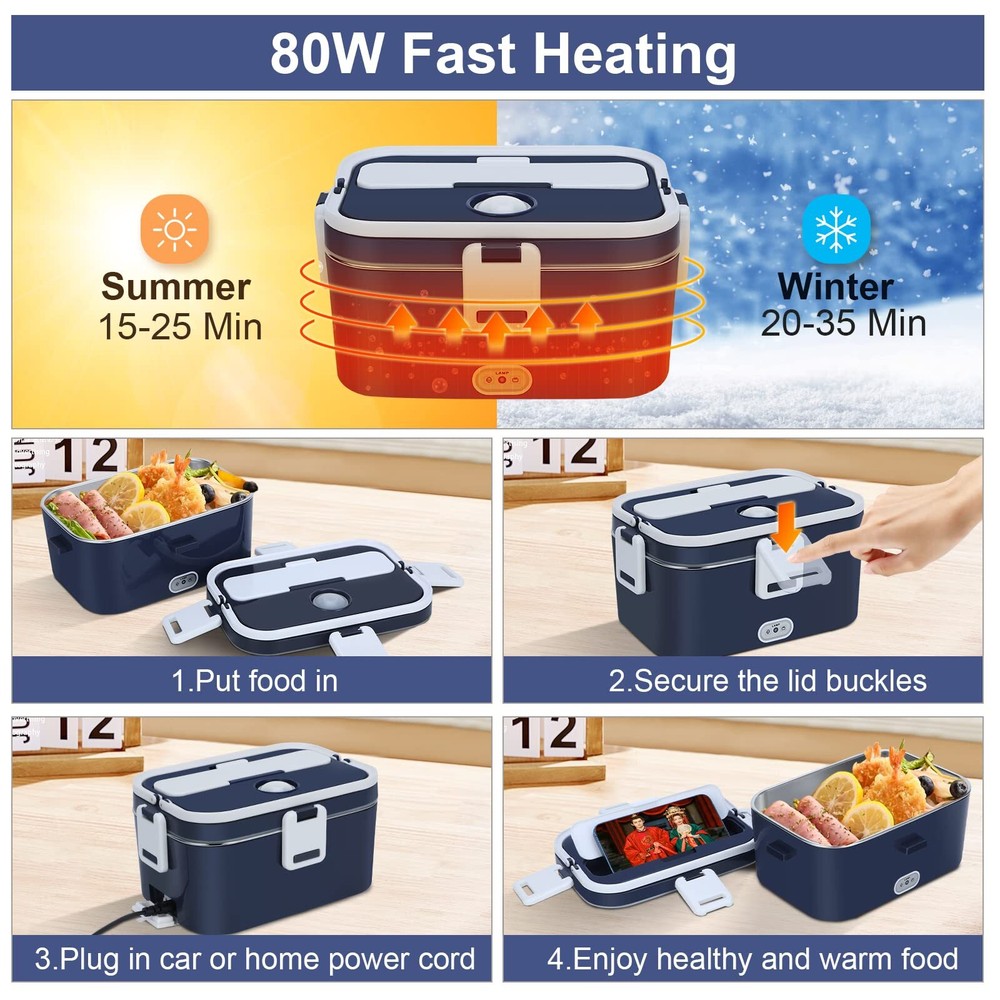 lunch box food electric warmer heated car portable fast heater 3 In 1 Electric lunch box: Do you often stand in line to heat up your meals or eat fast food? Come here! Our upgraded electric lunch box will solve this problem and let you enjoy hot meals anytime, anywhere! This electric heated lunch box supports 110V-220V home/office + 12V car and 24V truck use. Perfect for truck drivers, workers, office workers, etc. Make you enjoy hot and healthy meals 100W Faster heating: To shorten the heating time, we specially use the latest design of PTC thermostatic heating. Heat up your lunch as fast as possible, in just 15-35 minutes, you can have fresh and warm home-cooked food in the shortest time at office. This electric food heating lunch box is designed with circulating heat to keep your food nutritious and fresh. Keeping you eating healthy 1.8L+0.45L large capacity: The previous 1.5L capacity food warmer lunch box was not enough to meet the needs of some adults. That's why we designed this 1.8L capacity specifically for adult men or people who eat larger amounts of food. In addition, we offer a 0.45L plastic compartment where you can place different kinds of food individually. They are easy to clean and dishwasher safe Double layer leak-proof design: Sealing and leak-proof are the key points of our good food heater lunch box. We designed four side snaps, plus a built-in rubber seal, you no longer have to worry about soup leaking during transport, or a mess in the car.Comes with an insulated carrying bag to protect the box in heavy rain and dust Perfect for you: You will be surprised to find a small compartment on the lid to store your spoon and fork, you can also use it as a phone stand to enjoy your food while watching a movie. If you receive our electric lunch box food warmer is broken and there is a quality problem after using it for a period of time, please contact us and we will provide a satisfactory solution for you Heating Time: Summer: 25-30 minutes Shipping We offer FREE shipping on all orders! We ship within Three business days of payment, usually sooner. We use a selection of shipping services such as UPS, FedEx, USPS etc. We only ship to the lower 48 states, no APO/FPO addresses or PO Boxes allowed. Local pickups and combined shipping options are not provided at this time. Return You can return a product for up to 30 days from the date you purchased it. Any product you return must be in the same condition you received it and in the original packaging. Please keep the receipt. Payment We accept payment by any of the following methods: PayPal Please pay as soon as possible after winning an auction, as that will allow us to post your item to you sooner! Feedback Customer satisfaction is very important to us. If you have any problem with your order, please contact us and we will do our best to make you satisfied. Contact Us If you have any queries, please contact us via ebay. We usually respond within 24 hours on weekdays. Please visit our eBay store to check out other items for sale! Thank you for shopping at our store.