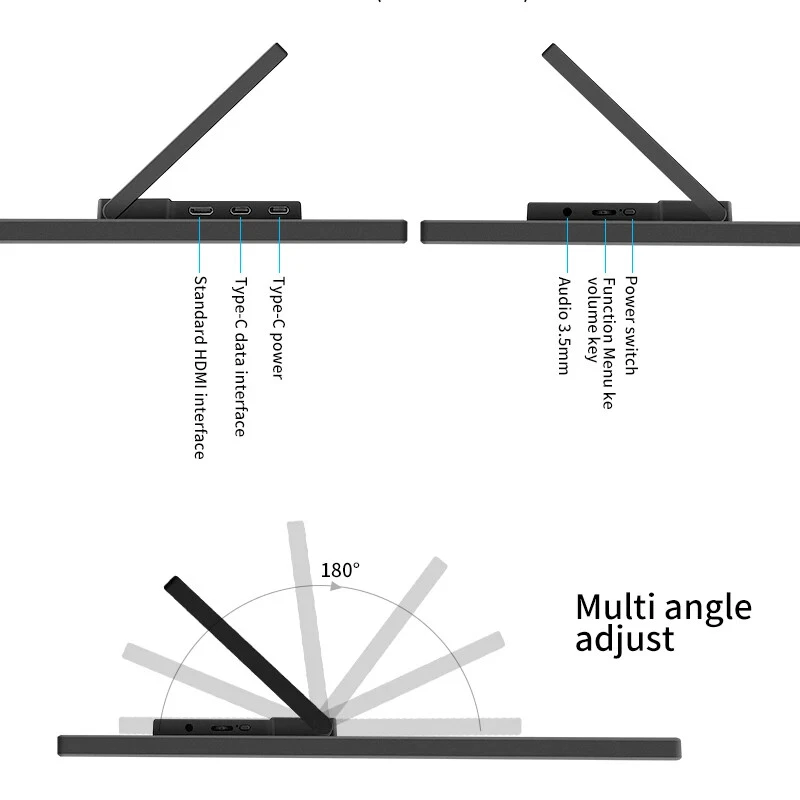 • High-Resolution Display : Experience immersive visuals with the 15.6-inch touch screen monitor's 1920*1080P resolution, offering crisp details and vibrant colors. • Superior Brightness : Boasting a brightness of 300cd/m2, this monitor ensures optimal screen visibility even in bright surroundings, enhancing your viewing experience. • Fast Refresh Rate : With a refresh rate of 60Hz, this monitor ensures smooth and lag-free visuals, providing an optimal user experience. • Versatile Connectivity : Equipped with a TYPE-C interface, this monitor supports seamless data transfer and video display from your laptop or device. • HDR Support : Enjoy superior color gradation and high-dynamic range with HDR10 support, enhancing your multimedia experience. • Wide Viewing Angle : The monitor offers a wide viewing angle of 178° horizontally and 178° vertically, ensuring comfortable viewing from various angles. Specification Screen size: 15.6 "IPS touch screen Resolution: 1920*1080P FHD Display Ratio:16:09 Display Colors: 262K (6-bit) 47% NTSC,66% sRGB Brightness(Max): 300 cd/㎡ Contrast:800:1 Visual Angle: 178° Full View Angle FPS: 60Hz Panel Type:IPS HDR :support Speaker: Dual Built-in 8Ω 1W Surface treatment: matte VESA:75mm*75mm Input Interface: Type-C * 2, Mini HD * 1 ,3.5mm Audio * 1. Package 1x Monitor 1x Hdmi cable 1x Type-C to Type-C Cable 1x Power cable 1x Touch cable 1x power adapter plug 1x Manual Support Single Type-C Cable For Display & Power Device Model -Mobile Phones Support USB-C 3.1: -Laptops Support Thunderbolt 3 or USB 3.1: *NOTE: If you can not find your devices above, please use mini HDMI cable instead. Q; Black screen or No signal? A;1. Please use the original accessories we provide (cables and charger) Type C 3.0 Male to Type C cable does not support video signal transmission. 2. Please plug in the wall charger to Type-C port for power supply and wait for the screen displays“no signal", then plug in the USB-C cable to another Type-C port or HDMl cable to MiniHDMl port for video signal transmission. 3. For single Type-Cconnection for power and display, the Type-C port of some devices like HP Elitebook, Acer Aspire does not support video output and only supports charging. Please contact us to help you confirm if your device supports. 4. Please set the display mode to Extend in Windows. 5. Connect the monitor to other devices to check if the monitor can work well with other devices. Q;How to connect this monitor to laptop without HDMI port like? A;Microsoft Surface Pro,Surface Book,HP EliteBook, etc. A (mini) DP to HDMl adapter is required to connect the monitor to your device. Q; Monitor keeps flashing/restarting? A; 1. Flashing or continuously restarting is usually caused by not enough power supply. If the monitor and your device are connected by single Type-C cable, some laptops and phones cannot provide enough power supply for this monitor. Please plug in wall charger to Type-C port of monitor for enough power supply. Q; I use the Type C to Type C 3.0 Male cable to connect the monitor to my device, but it displays "no signal”? A; Please confirm whether the type-c interface of my device is version 3.1. Q; My Android Phone is equipped with Type-C port. But it does not work with this monitor? A; Phones may not be able to provide enough power supply for the monitor, please plug in the wall charger to Type-C port, then connect phone to another Type-C port by Type-C cable. 2.The Type-C port of some phones does not support display and only supports charging. For example, the Type-C port of Google phones like Pixel does not support video output. An Android to HDTV cable is required to mirror the screen. Q; Can the monitor work with Apple iPhone? A; Yes. A Lightning to HDMl adapter is required for iPhone to work with the monitor. Q; Can this monitor work with iPad? A; Yes. If the port of iPad is Type-C port, the monitor will work well with iPad by single Type-C cable But for iPad with lightning a lightning to HDMI adapter is required to work with the monitor. Q; How to save the setting of brightness? A; The monitor will automatically save all settings when using Type-C connection or HDMI connection for display. As for singleType-Cconnec- tion for power and display, if the device cannot provide enough power supply for this monitor, then the monitor will reset the brightness to 30 automatically.