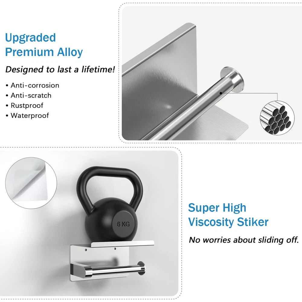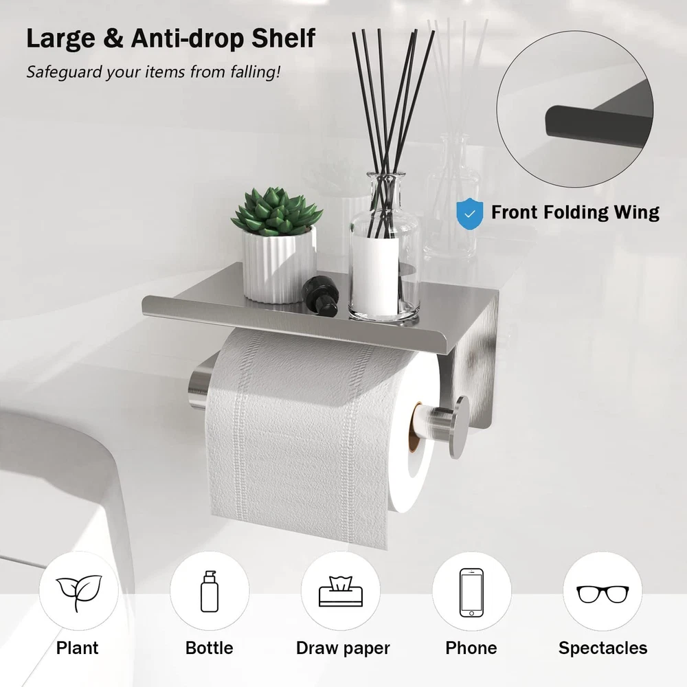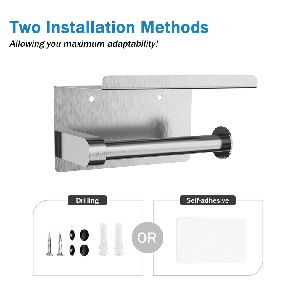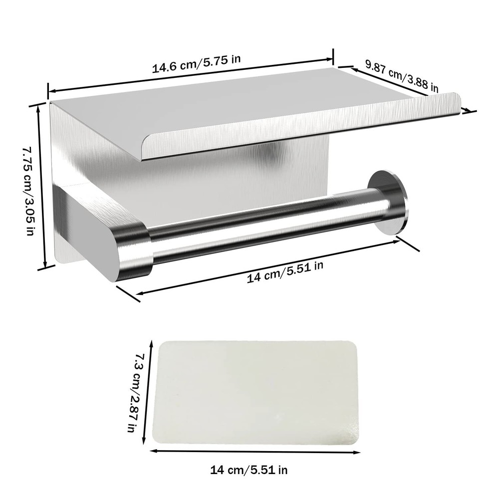 Portarrollos de papel higiénico de pared con estante para teléfono Features: Dos métodos de instalación: Hay dos métodos para instalar nuestro portarrollos negro: 1. Péguelo a la pared con el adhesivo de alta viscosidad incluido, o 2. Perfore agujeros en la pared e instale el producto con el kit de herrajes incluido. Material de primera calidad: Fabricado en acero inoxidable de primera calidad, impermeable y resistente a la corrosión, con un acabado exterior resistente al desgaste y ecológico. Esto lo hace resistente a la corrosión y al óxido en cualquier entorno, manteniéndolo como nuevo. Estante grande para teléfono: El borde curvado hacia arriba del estante superior protege su teléfono y otras pertenencias de caídas. El soporte para teléfono es lo suficientemente grande como para albergar una variedad de artículos, como toallitas, desinfectante de manos, pañuelos faciales, ambientadores, aromaterapia, etc. Este portarrollos se adapta a la mayoría de los tamaños de rollos. Diseño moderno y elegante: Este portarrollos minimalista puede complementar una amplia variedad de estilos de decoración, a la vez que ofrece toda la funcionalidad que necesita. Es la combinación perfecta de estética y utilidad. Compatible con la mayoría de los rollos de papel: Nuestro portarrollos está diseñado para adaptarse a la mayoría de los tamaños de rollos de papel. SHIPPING We are always working hard to ensure your package arrives as soon as possible. Please understand that some factors like weather, high postal traffic, and the performance of shipping companies are outside of our control. We offer free shipping to the lower 48 states and ship within 3 business days of payment, usually sooner. We do not accept P.O. Boxes. Please provide a physical address.