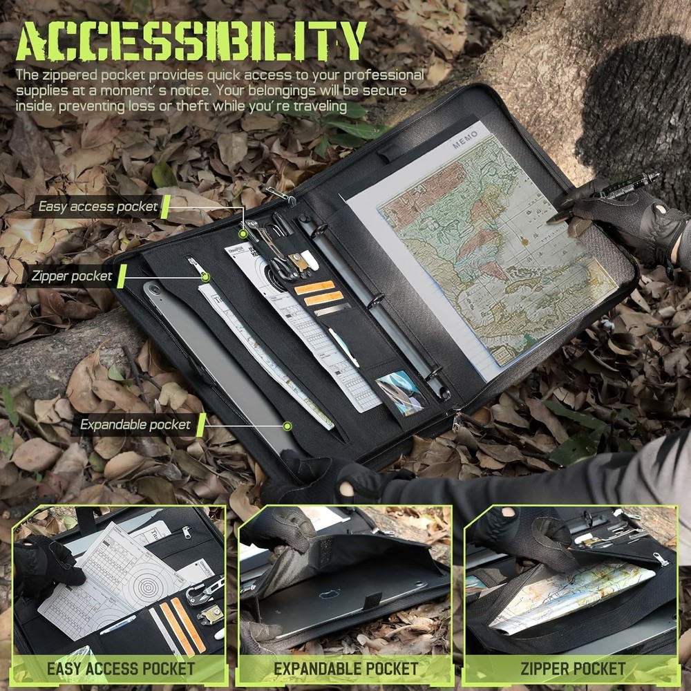 About this item Easy To Carry : Larger than A4 size (12 x 13.6 x 1.2 inches), Padfolio ring binder built with multi-functional pockets and a strong handle. Easy to carry all your necessary items, like a portfolio handbag without any mess, ideal for outdoor enthusiasts, field work, office professionals, and college. All-in-One Storage : Portfolio organizer offers ample storage space for essentials. Hoop-N-Loop-type exterior pocket for easy access to loose papers. Multiple interior pockets, card slots, and pen loops to keep pens, driver's license, cards, iPad, notepad, and cash neatly organized. Customize & Expand Papers : The planner binder comes with a detachable 3-ring metal binder, easily customize and expand. Refill 3–ring loose-leaf paper, like budget /calendar planner, blank / lined /grids paper, or as a notepad, file folder organizer and clear game card binder. Secure & Durable Protection : Zip 3-ring binder crafted from durable 1000D fabric tactical notebook cover offers rugged durability and 2 zipper closures, safeguarding your important documents from rain and dust damage. Personalized Decoration (Include a US flag patch) : Binder notebook with patches to reflect your personality. Express your uniqueness by decorating the binder according to your preferences, and embrace the spirit of adventure and patriotism. Ready-to-Gift Notebook (includes 25 sheets of A4 letter paper) : Portable handle, zipper closure, multifunctional pocket, detachable binder - carefully designed for personalized paper configuration. A truly thoughtful present that helps organize thoughts and safeguard every story. Color: Black Material: 1000D Fabric, Polyester Capacity: 1.98 Pounds Brand: Sheet Size: A4 letter paper(8.2" x 11" // 20.8 x 28.3 cm) Inches