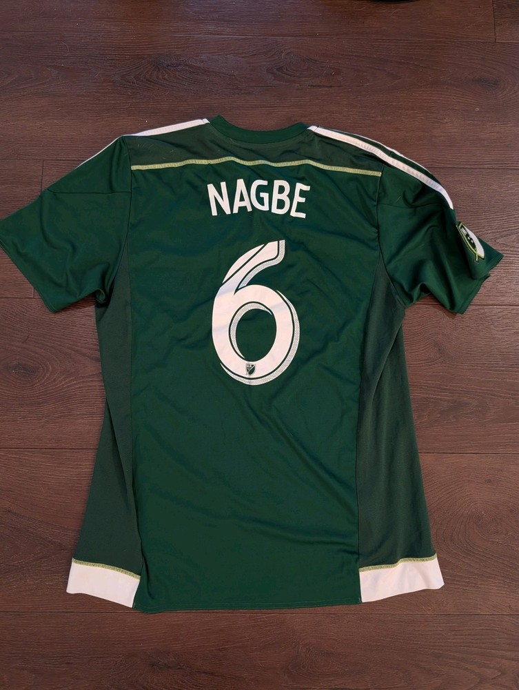 This product is a Portland Timbers MLS Adidas Men's Size Large #6 Nagbe Soccer Jersey. The jersey is officially licensed by Major League Soccer and features the team's signature green color. Made by Adidas, this jersey is designed for men and showcases the team's logo and player name. Perfect for fans of the Portland Timbers and soccer enthusiasts alike, this jersey is a high-quality and stylish representation of team pride.