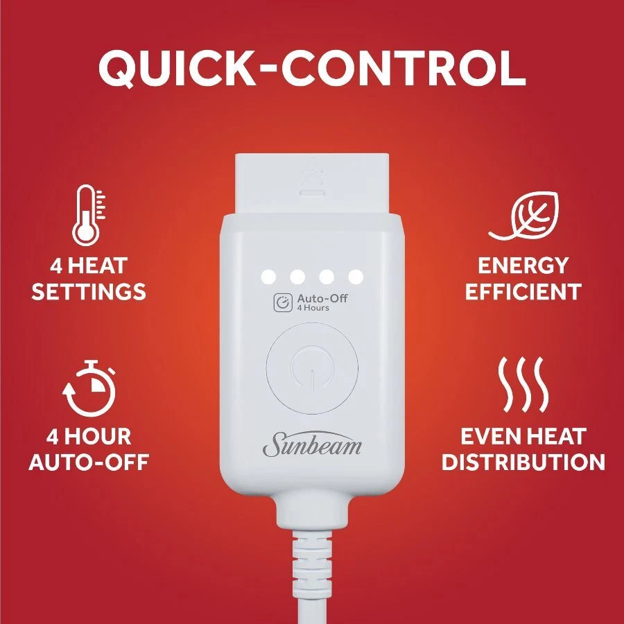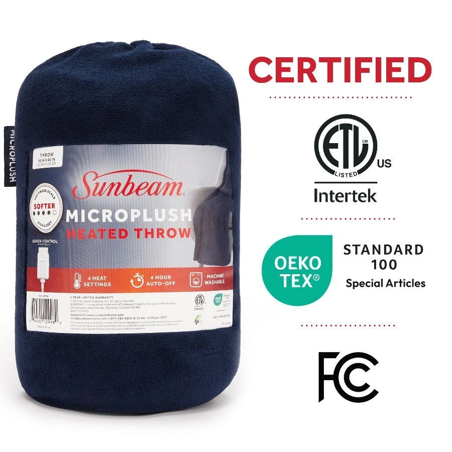 Sunbeam Poseidon Microplush Electric Heated Throw wraps you in ultimate comfort, perfect for those chilly cold nights. Snuggle yourself in the rich, cozy microplush fabric that keeps you toasty warm as you unwind. The stylish 50" x 60" electric blanket makes a great accessory while relaxing on the couch, bed or your favourite chair and the poseidon color complements any décor. This throw features an easy-to-use push-button controller with 4 adjustable heat settings, so you can find your perfect temperature. The 4-hour auto shut-off function ensures added peace of mind. Premium heated wires are equipped with advanced technology to ensure continuous even heat distribution. When ready to clean, simply detach the controller from the throw and place in the washing machine and dryer for easy care, stays silky soft wash after wash. Sunbeam is an American brand trusted for over 125 years in electric home appliances. All Sunbeam electric bedding products are ETL certified. On Dec 26, 2024 at 18:59:11 PST, seller added the following information: