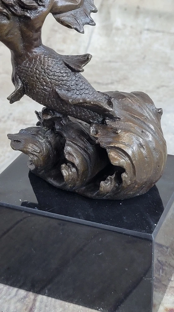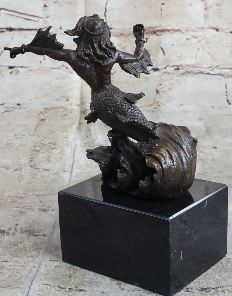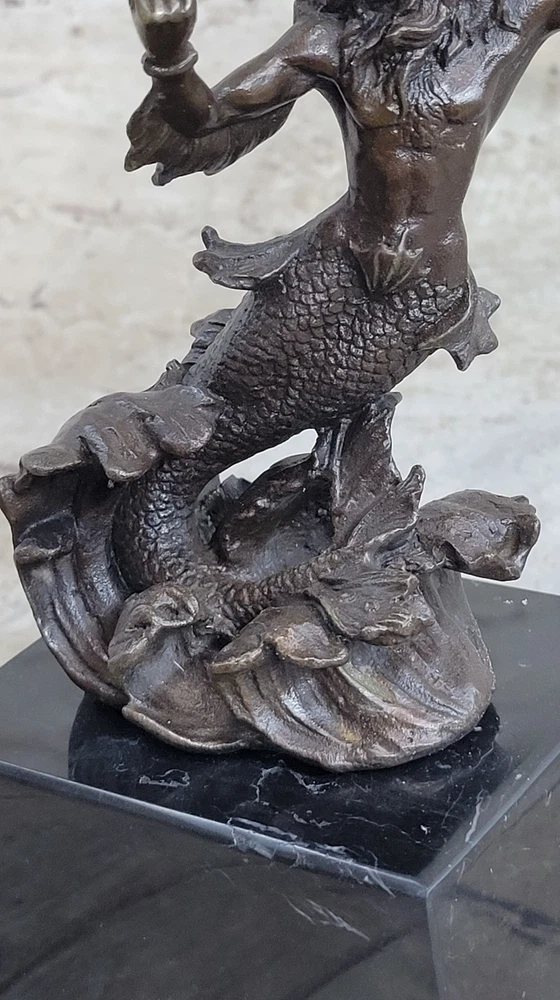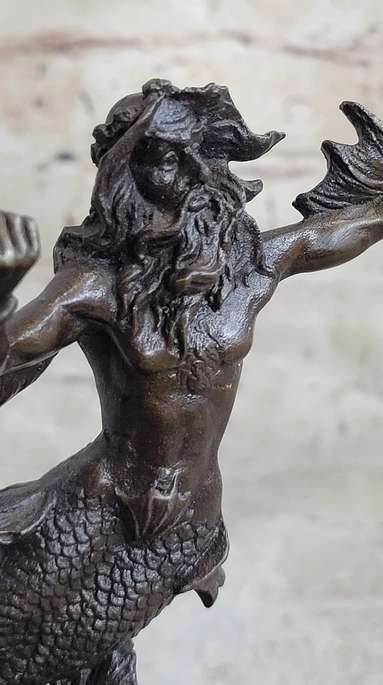 Signed Original Poseidon God of Sea Bronze Marble Base Figurine Home Decor Deal Signed Original Poseidon God of Sea Bronze Marble Base Figurine Home Decor Deal Condition : This sculpture is in perfect condition. Bronze Dimensions with Marble Base: Height 7" X Width 4" Marble Dimensions:4" X 3" Height without base:6" Weight:4 LBS Inventory:34XNCH0182243 This sculpture portrays Poseidon, the mighty god of the sea, storms, and earthquakes in Greek mythology, as a powerful merman wielding his iconic trident. Known for his tumultuous temperament and control over the oceans, Poseidon held significant importance in ancient Greek and Roman cultures, revered as a protector of cities and sailors alike. His complex character was depicted in various aspects, from benevolently creating new islands to wrathfully causing chaos and destruction. Crafted using the esteemed "Lost Wax Method," this sculpture exemplifies meticulous attention to detail, capturing the dynamic energy and strength of Poseidon as he brandishes his trident. The brown patina enhances the sculpture's lifelike appearance, while the marble base adds stability and elegance to its presentation. Signed by the artist Nick, this piece pays homage to the enduring legacy of Poseidon and his mythological significance. With its portrayal of Poseidon as a merman, this sculpture offers a unique interpretation of the deity, blending elements of human and sea creature to convey his divine power and authority over the maritime realm. Whether displayed as a centerpiece in a collection or as a standalone piece of art, it serves as a reminder of the awe-inspiring forces of nature and the enduring mythological narratives that continue to captivate our imagination. Signed Poseidon God of Sea Bronze Bookend Book End Sculpture Marble Base Statue XNCH-018 Video will open in a new window Using the eBay App? Paste link into a browser window: [isdntekvideo] Shipping Terms : Most of our items are shipped via USPS (United States Postal Service) mail or UPS. Most orders are shipped within 24-48 hours of purchase. Please be aware that not all items are available for USPS shipping due to size and weight. We do ship to Hawaii, Alaska, Canada, Puerto Rico, APO/AE, and U.S. Virgin Islands, however, an additional charge may be required. Please contact us before making any purchases in these areas. For Non-USA customers, you may be responsible for all duty, tax, brokerage fees that may be due upon delivery (shipping costs cover freight charges only). We also ship internationally. Please refer to the "Shipping and Handling" chart for the rates for each area. Payment : We accept just about any form of payment. PayPal, Master Card, Visa or American Express credit cards. Money orders, cashiers checks, and even personal or business checks. For governmental institutions, we will also accept a purchase order. Please understand that for personal or business checks we have to wait for the check to clear (usually 7 days) before shipping. Condition : New Detailed Hand Crafted Hot Cast Bronze Satisfaction Guaranteed. This is Stock Photo, Slight Color Variation!! Listing and template services provided by inkFrog