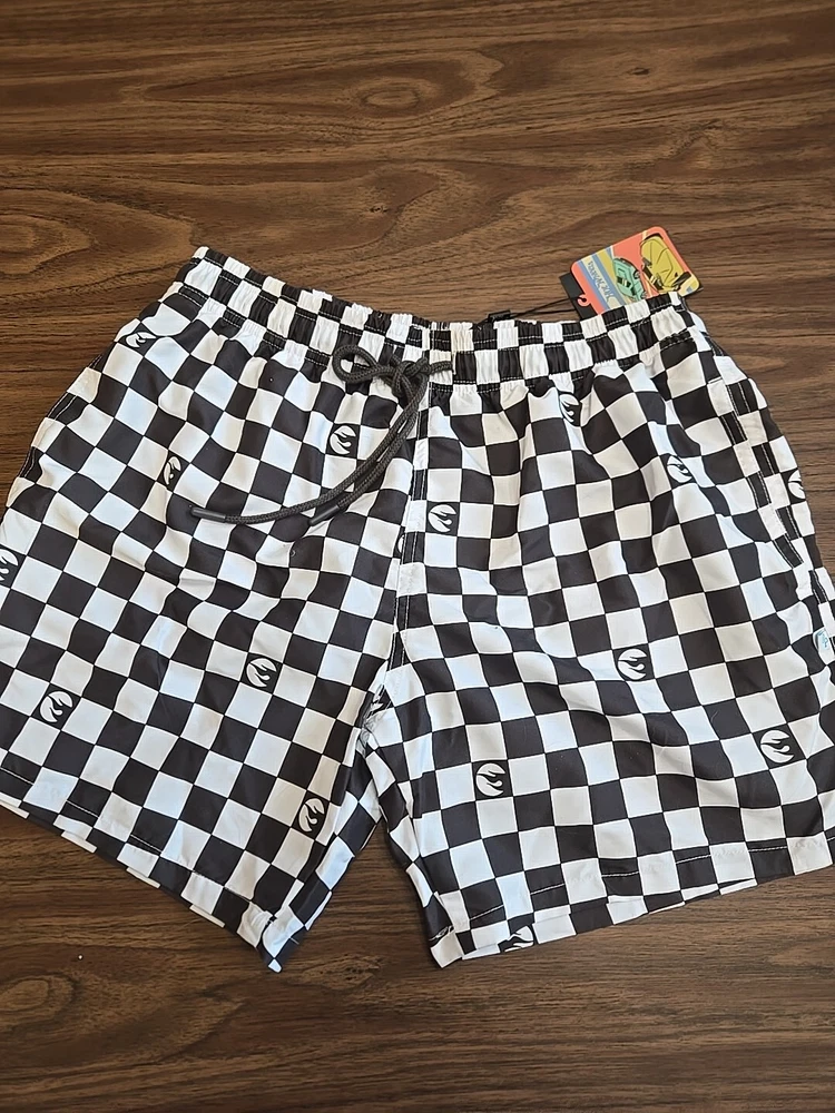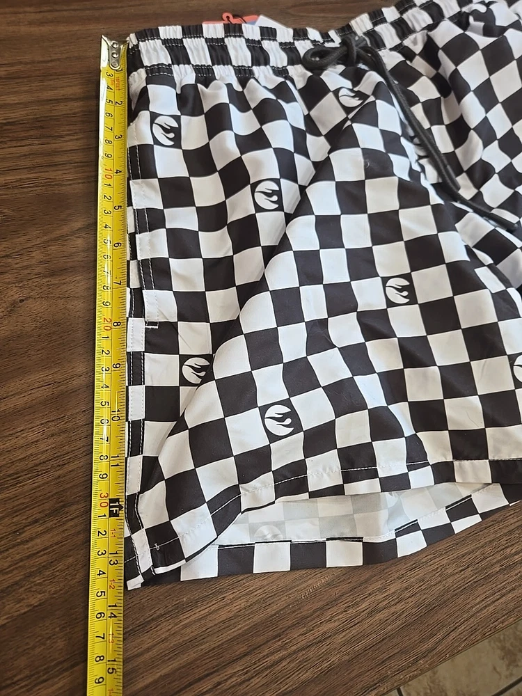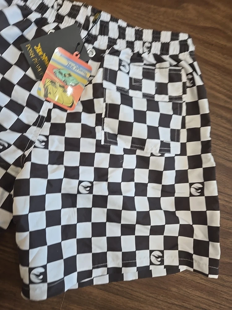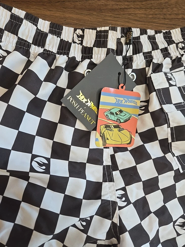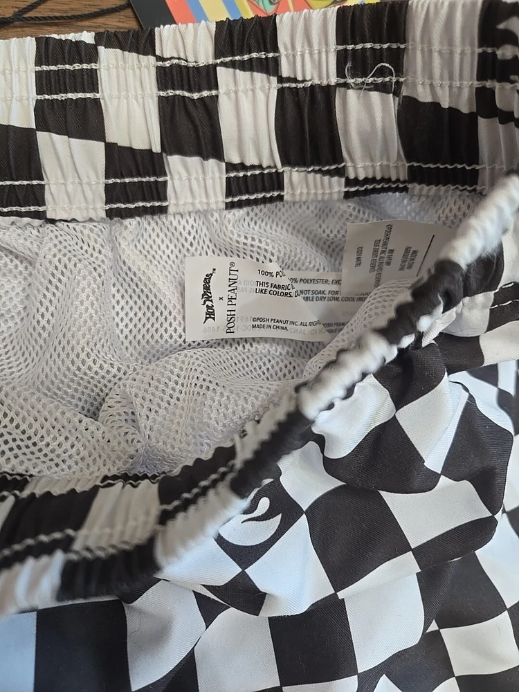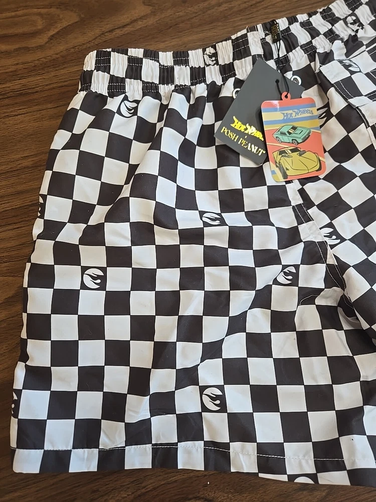 This is a pair of Posh Peanut swim trunks for boys, featuring a black and white checkered flag pattern with a Peanuts character theme. The trunks are size small and lined for added comfort. The brand is Posh Peanut, and the swim bottoms are designed in a trunks style.