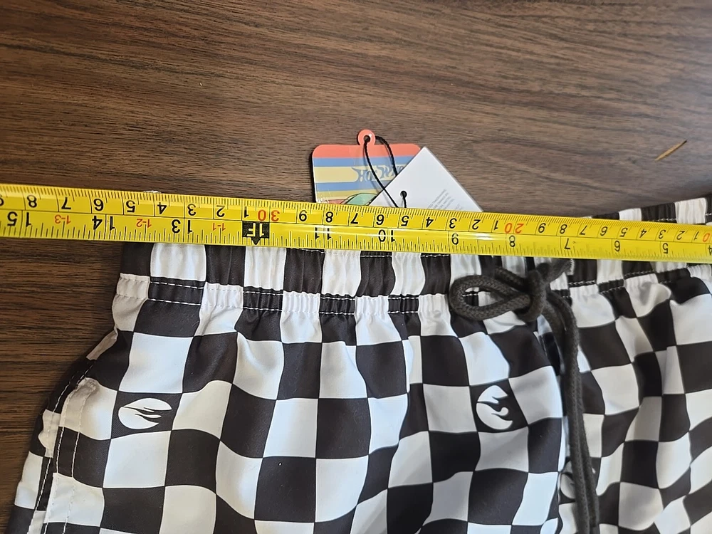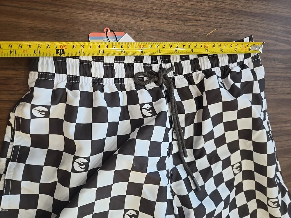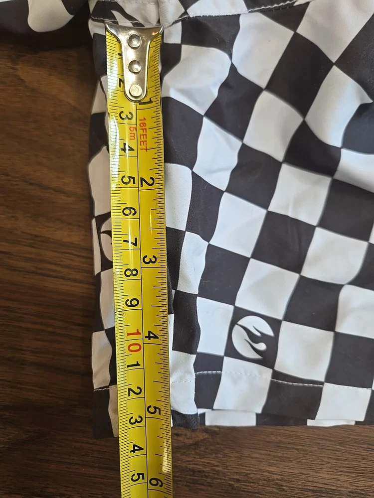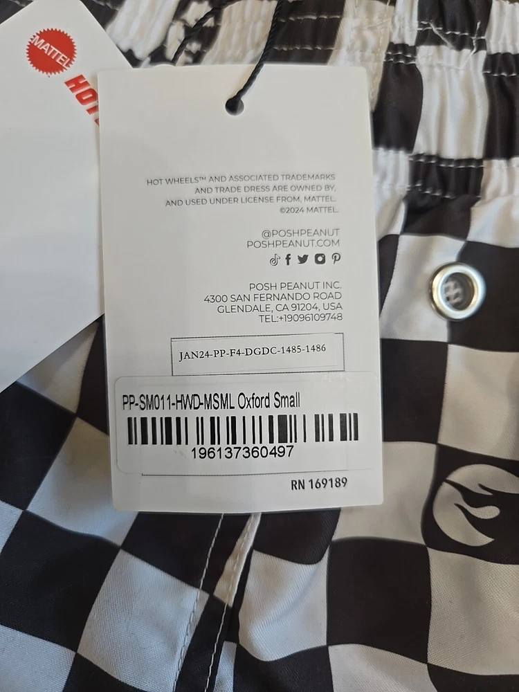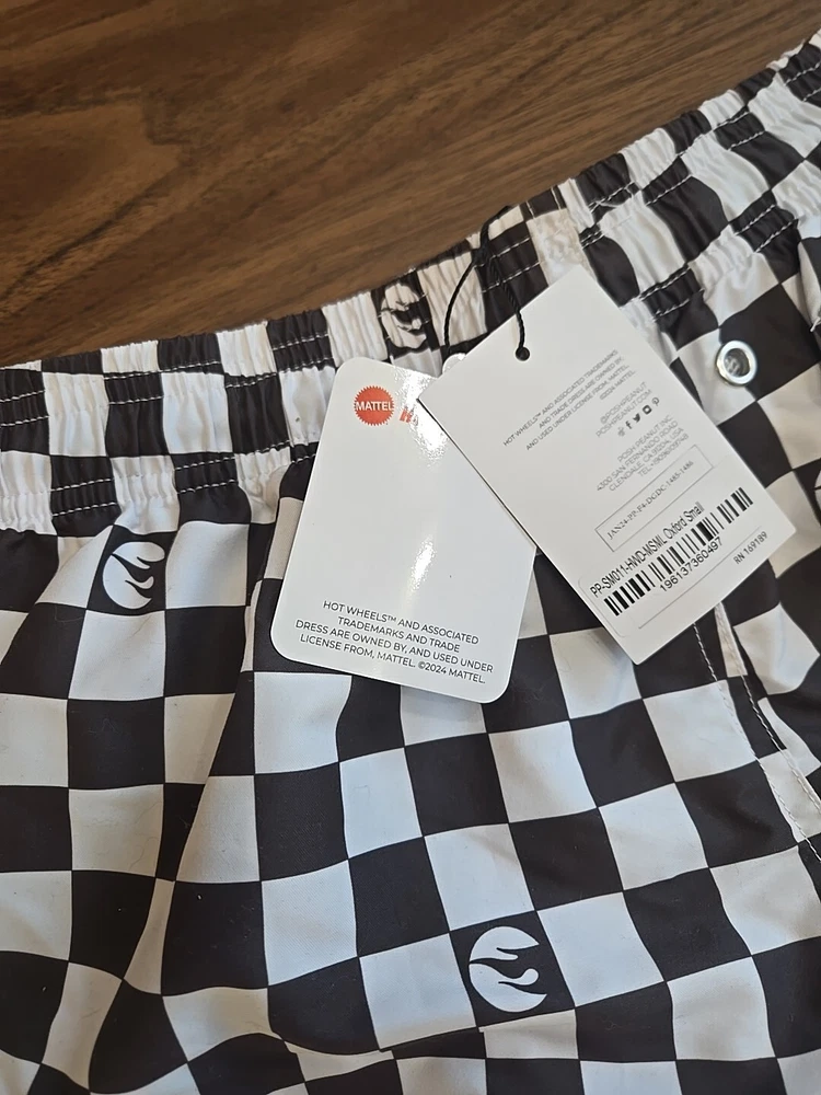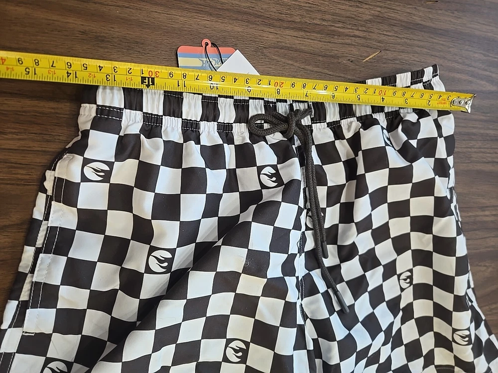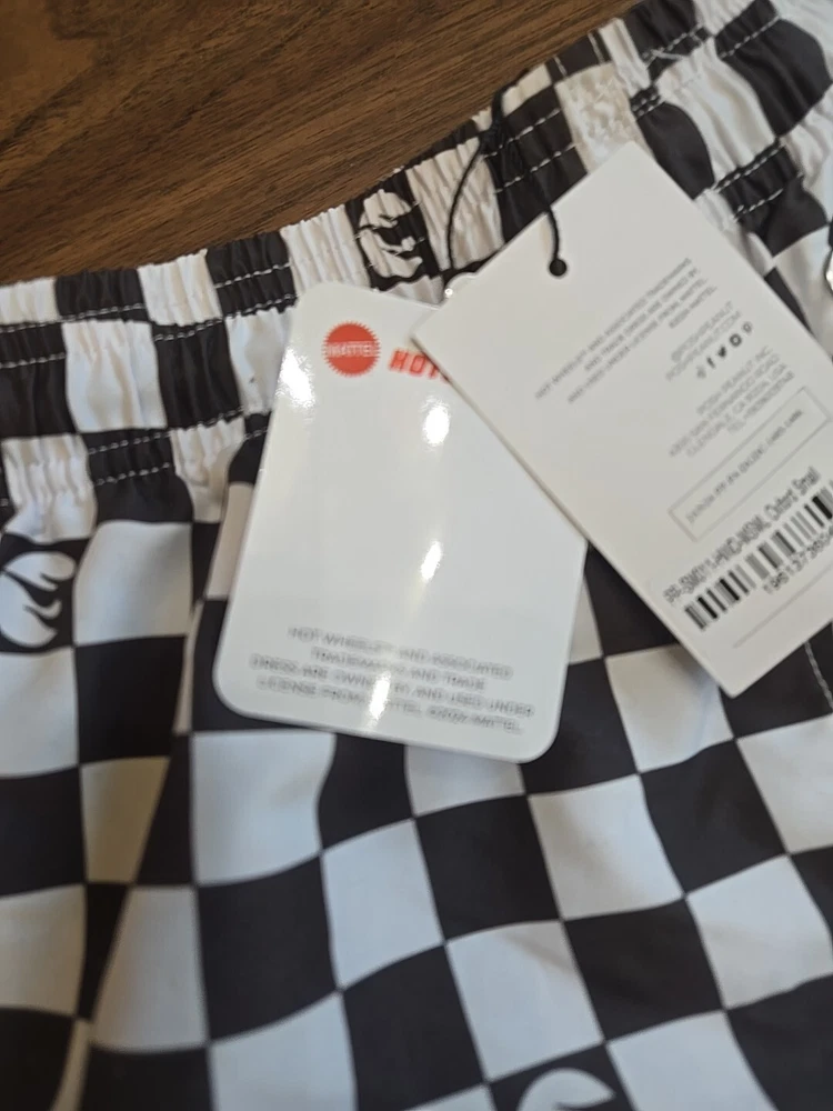 This is a pair of Posh Peanut swim trunks for boys, featuring a black and white checkered flag pattern with a Peanuts character theme. The trunks are size small and lined for added comfort. The brand is Posh Peanut, and the swim bottoms are designed in a trunks style.