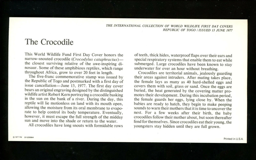 Postal History Togo FDC #960 animals reptile crocodile 1977