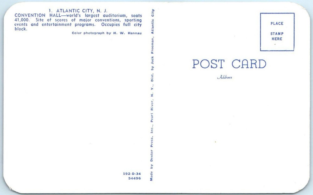 Postcard - Convention Hall - Atlantic City, New Jersey P-58728 Postcards from various collections. Many used and most show signs of use. see pictures for details on condition. To get combined shipping rate items must be paid for at the same time. Please verify your invoice is correct before you pay. If shipping charges or anything else is not correct please email me so I can try to assist before you pay. Once paid for I am not able to add additional items to the combined shipping. We ship using US Mail, Items are packed and shipped by the next business day. Speed of delivery may take longer during peak shipping seasons. --- Important please read below Postcards from various collections, many used with visible wear. See pictures for condition. Scans show the actual card; minor scanner lines may appear but are not on the card. Verify your invoice before paying. If shipping charges are incorrect, email me for assistance. We ship daily via USPS from a rural area, which may cause slight delivery delays. U.S. orders use eBay Standard Envelope with limited tracking. International orders use stamped mail without tracking. Items ship the next business day. Delivery times may vary during peak seasons.