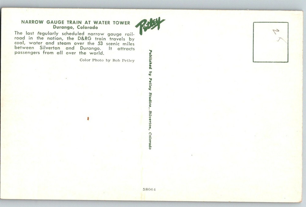 You are buying a Vintage " Postcard D&RG Narrow Gauge Train Water Tower Silverton Durango CO . " Card Size is approx. 3.5" X 5.5". In stock, Usually Ships Within 24 hours! 100% Satisfaction Guaranteed! If you have any problems with this purchase, please contact me before leaving feedback, and I will do my absolute best to make you satisfied. Check all my other listings in my store. RETIREDWITHBOOKS. Thank you!
