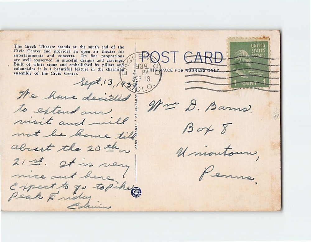 Postcard with image Greek Theatre Civic Center Denver Colorado USA H-19104 Postcards from various collections, many used with visible wear. See pictures for condition. Scans show the actual card; minor scanner lines may appear but are not on the card. Verify your invoice before paying. If shipping charges are incorrect, email me for assistance. We ship daily via USPS from a rural area, which may cause slight delivery delays. U.S. orders use eBay Standard Envelope with limited tracking. International orders use stamped mail without tracking. Items ship the next business day. Delivery times may vary during peak seasons.