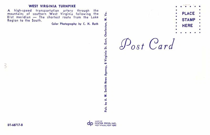 Region: West Virginia Material: Paper Country/Region of Manufacture: United States Country: USA Postage Condition: n/a Original/Licensed Reprint: Original Era: see features for era Unit of Sale: Single Unit Continent: North America Size: Standard (5.5 x 3.5 in) Type: Printed (Lithograph) Subject: Highway
