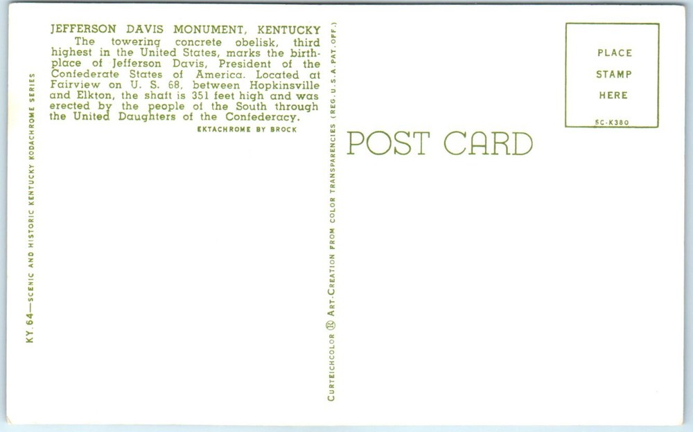 Postcard - Jefferson Davis Monument - Fairview, Kentucky P-61025 Postcards from various collections. Many used and most show signs of use. see pictures for details on condition. To get combined shipping rate items must be paid for at the same time. Please verify your invoice is correct before you pay. If shipping charges or anything else is not correct please email me so I can try to assist before you pay. Once paid for I am not able to add additional items to the combined shipping. We ship using US Mail, Items are packed and shipped by the next business day. Speed of delivery may take longer during peak shipping seasons. --- Important please read below Postcards from various collections, many used with visible wear. See pictures for condition. Scans show the actual card; minor scanner lines may appear but are not on the card. Verify your invoice before paying. If shipping charges are incorrect, email me for assistance. We ship daily via USPS from a rural area, which may cause slight delivery delays. U.S. orders use eBay Standard Envelope with limited tracking. International orders use stamped mail without tracking. Items ship the next business day. Delivery times may vary during peak seasons.