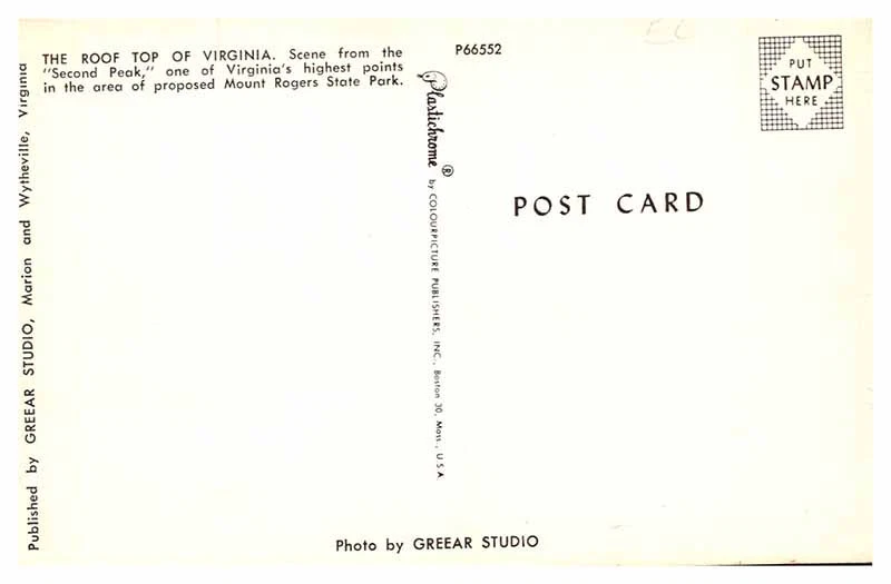Postage Condition: n/a Continent: North America Region: Virginia Country/Region of Manufacture: United States Size: Standard (5.5 x 3.5 in) Era: see features for era Material: Paper Unit of Sale: Single Unit Country: USA Type: Printed (Lithograph) Original/Licensed Reprint: Original City: Mount Rogers State Subject: Panoramic
