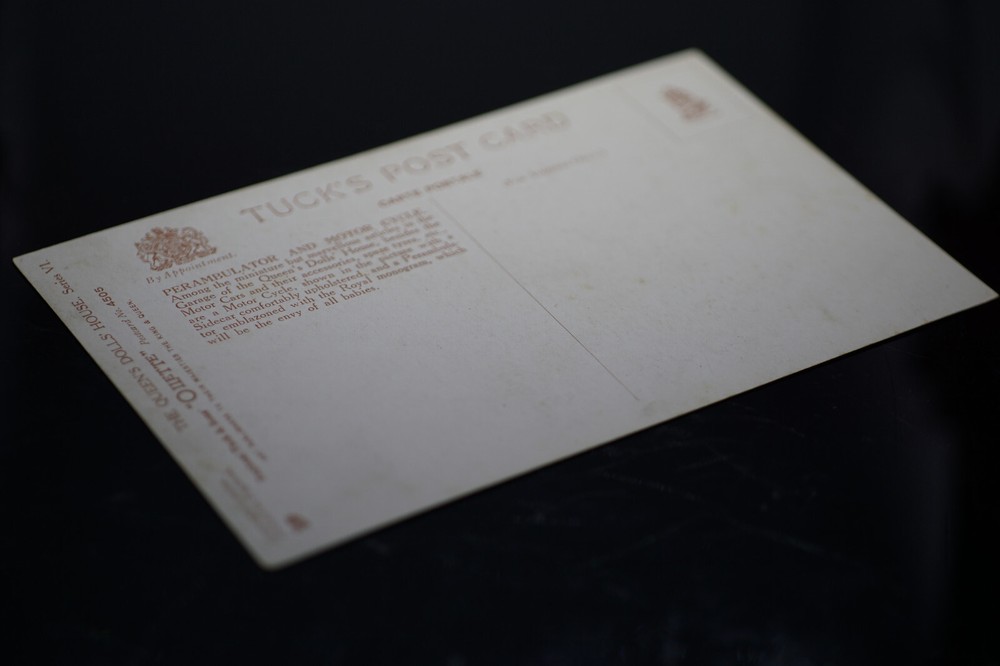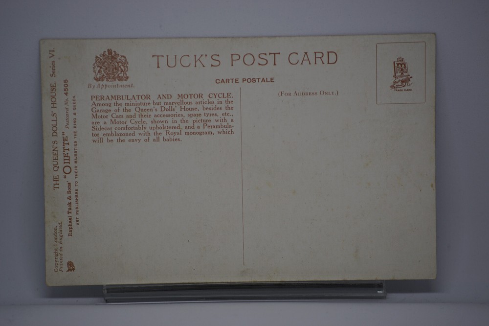 Postcard The Queen's Dolls' House Perambulator (Pram) and Motor Cycle Tuck 4505 Oilette colour lithograph Raphael Tuck & Sons Series VI No. 4505 The Queen's Dolls' House Perambulator and Motor Cycle. One of a series of postcards illustrating aspects on The Queen's Dolls' House, published by Raphael Tuck, 1920s. Queen Mary's Dolls' House is a doll's house built in the early 1920s, completed in 1924, for Queen Mary, the wife of King George V. Boudoir wall designs by Edmund Dulac. It is kept at Windsor Castle. Unposted. Good vintage condition. No visible damage to any of the edges. All corners slightly bent. Dirt spots, discoloration, creasing, scratches, missing paint and stains marks may be visible on single or both sides of the postcard. Good condition for its age. Please look at the photos for condition details.