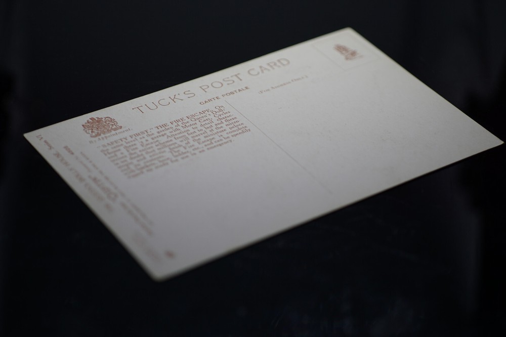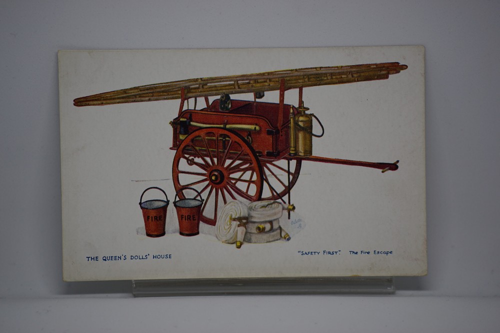 Postcard The Queen's Dolls' House Safety First The Fire Escape Tuck No. 4505 Oilette colour lithograph Raphael Tuck & Sons Series VI No. 4505 The Queen's Dolls' House "Safety First," The Fire Escape. One of a series of postcards illustrating aspects on The Queen's Dolls' House, published by Raphael Tuck, 1920s. Queen Mary's Dolls' House is a doll's house built in the early 1920s, completed in 1924, for Queen Mary, the wife of King George V. Boudoir wall designs by Edmund Dulac. It is kept at Windsor Castle. Unposted. Good vintage condition. No visible damage to any of the edges. All corners slightly bent. Dirt spots, discoloration, creasing, scratches, missing paint and stains marks may be visible on single or both sides of the postcard. Good condition for its age. Please look at the photos for condition details.