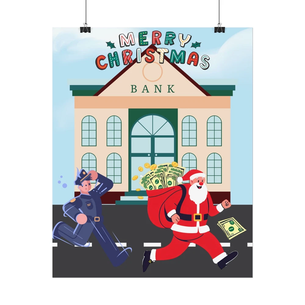 A funny poster featuring a design of Santa Claus running away from a bank with his sack full of money while being chased by a police officer. This poster adds a humorous and festive vibe to any room during the holiday season. Perfect for those who enjoy unique and quirky decor. Product features - Two paper options - semi-gloss and matte - Multiple sizes to choose from - Giclée print for bright and intense colors - Archival quality paper for long-lasting design - Satin finish for full sharp color fidelity Care instructions - If the print does gather any dust, you may wipe it off gently with a clean, dry cloth.