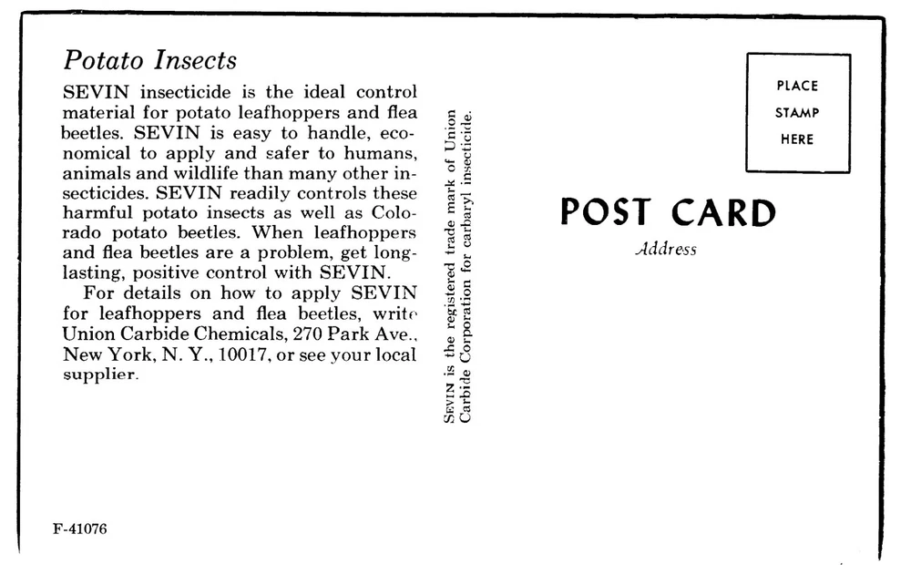 Potato Insects Ad Card for SEVIN Insecticide Postcard Vintage postcard. See scans/photos for condition and details, using the zoom feature to see the full detail and condition of the card. Some postcards may have creases, edge and corner wear, pencil/pen markings, fading, yellowing, or staining consistent with their age and storage. Please reach out with questions or if you require additional photos. Items are mailed quickly, sleeved and in a rigid envelope. Visit often as postcards are added daily. Thank you for supporting my small business!