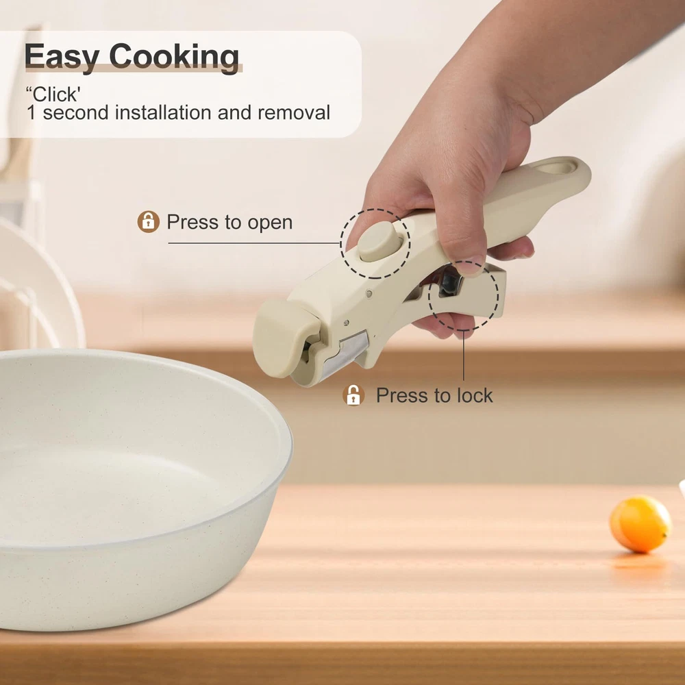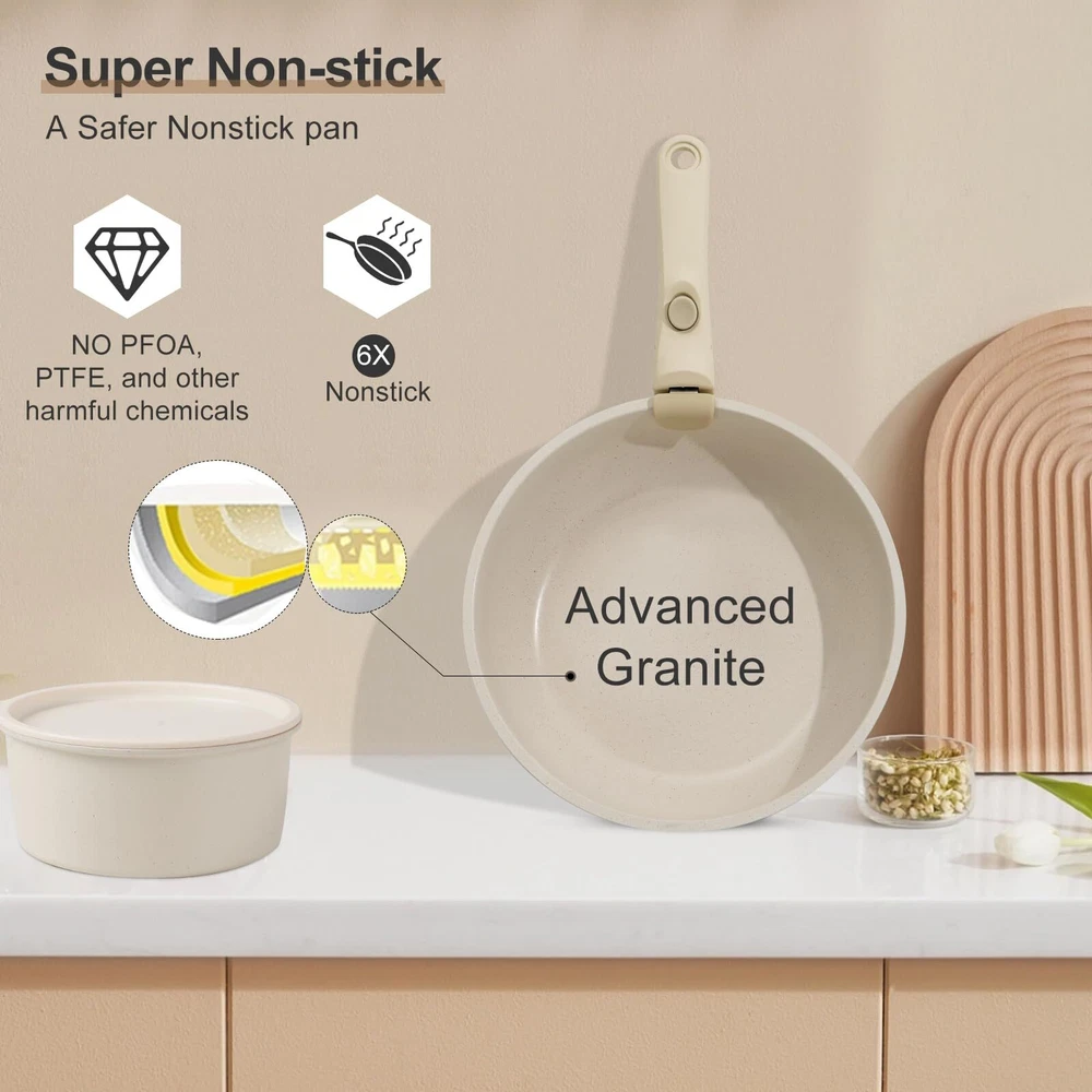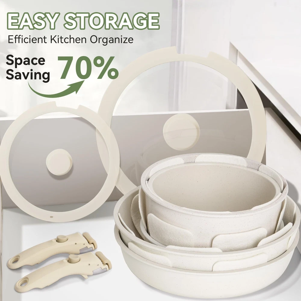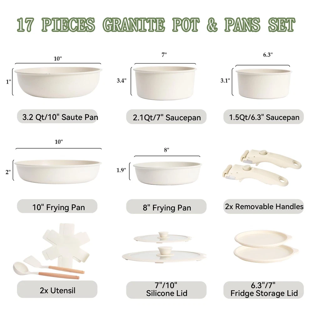 DETACHABLE HANDLE :Experience ultimate kitchen convenience with this 17-piece granite cookware set featuring detachable handles. Effortlessly switch between stovetop and oven cooking.Detachable handles reduce the risk of burns, ensuring a safer cooking experience GRANITE COATING:Cook healthier meals with less oil! The advanced granite coating offers exceptional non-stick performance, ensuring food slides right off while making cleanup a breeze. Plus, The pots and pans set non stick 100% PFOA-free and safe for your family VERSATILITY:From sautéing and frying to boiling and simmering, this pots and pans set does it all. Compatible with all stovetops—including gas, electric, and induction stovetops—and oven-safe up to 500°F, it's the ultimate solution for versatile cooking SPACE-SAVING:These pots and pans maximize your cabinet space! Detachable handles make it easy to stack and store your cookware neatly, whether you’re in a small kitchen, RV, or camping setup. Say goodbye to cluttered cabinets DURABILITY:Built to last, this pot and pan set features a scratch-resistant granite coating and reinforced aluminum construction for even heat distribution. Enjoy consistent cooking results and reliable performance for years to come DISHWASHER SAFE:Cleaning up is effortless! The non-stick granite surface makes it easy to wipe off food residue, and the non stick pots and pan set is dishwasher-safe for even more convenience AESTHETIC APPEAL:Bring a touch of elegance to your kitchen! With its sleek granite finish and contemporary design, this pan sets for cooking nonstick is as stylish as it is functional, making every meal a culinary delight 17 PCS COOKING SET INCLUDES: 1.5QT(6.3") & 2.1QT(7") saucepans, 8-inch & 10-inch frying pans, 3.2QT(10")sauté pan, 2 removable handles, 7-inch & 10-inch glass lids, 6.3-inch & 7-inch fridge lids, 4 pot protectors, silicone slotted turner & ladle