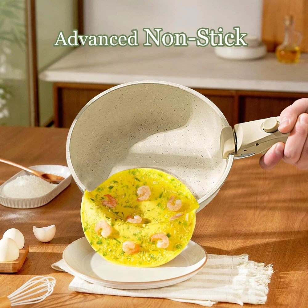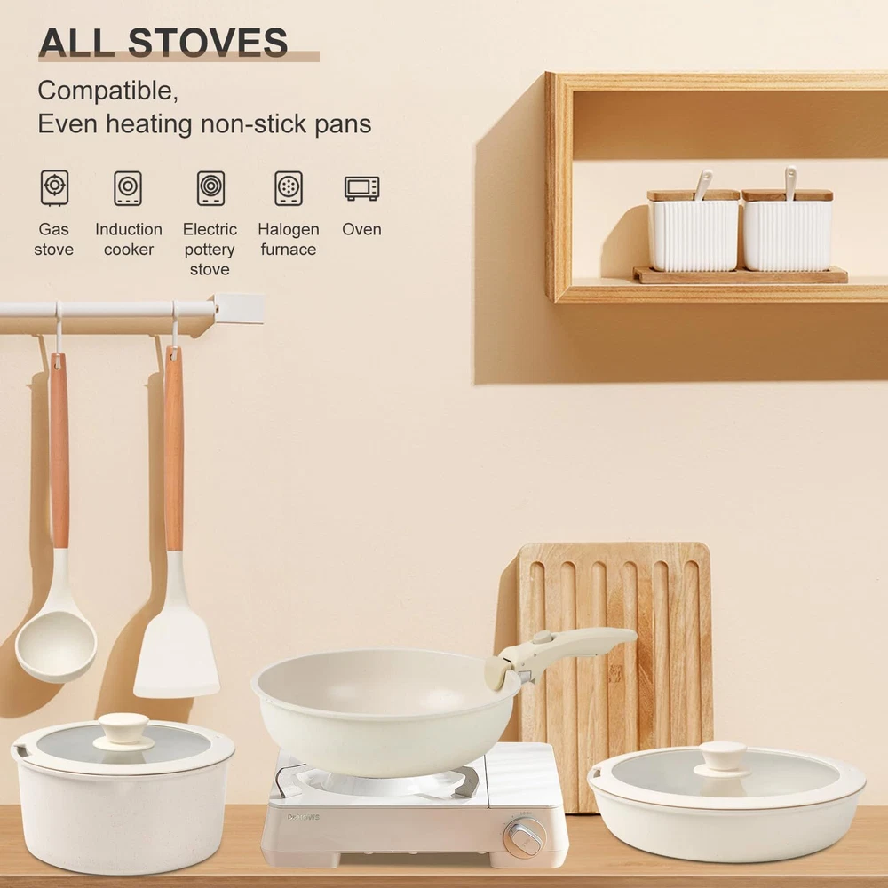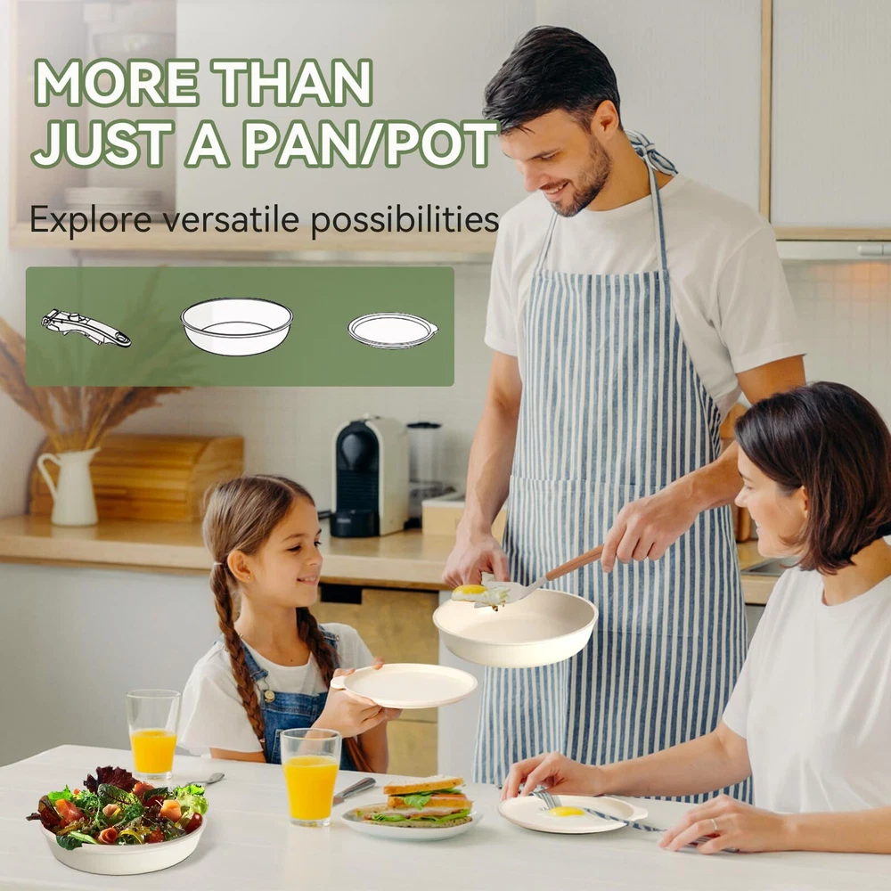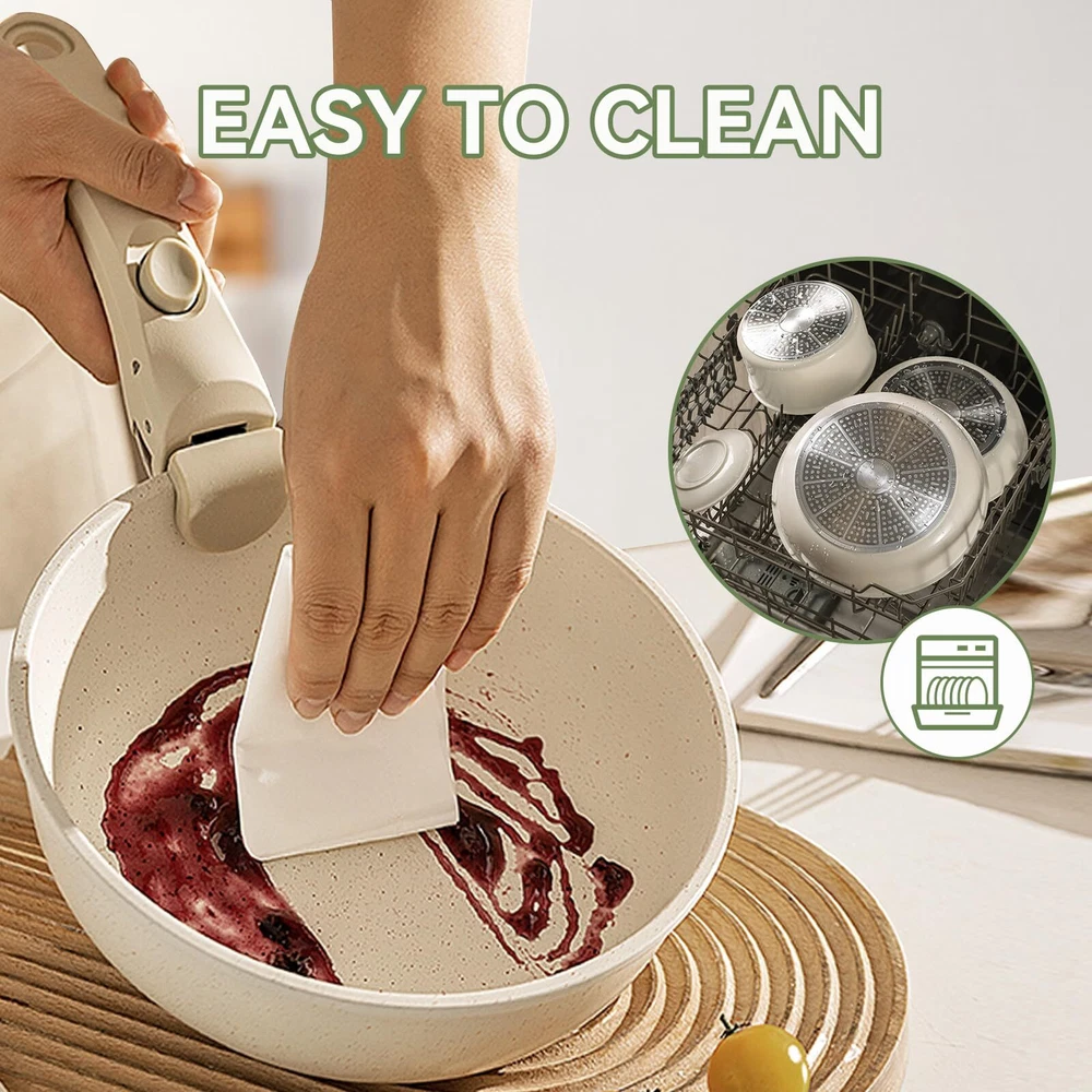 DETACHABLE HANDLE :Experience ultimate kitchen convenience with this 17-piece granite cookware set featuring detachable handles. Effortlessly switch between stovetop and oven cooking.Detachable handles reduce the risk of burns, ensuring a safer cooking experience GRANITE COATING:Cook healthier meals with less oil! The advanced granite coating offers exceptional non-stick performance, ensuring food slides right off while making cleanup a breeze. Plus, The pots and pans set non stick 100% PFOA-free and safe for your family VERSATILITY:From sautéing and frying to boiling and simmering, this pots and pans set does it all. Compatible with all stovetops—including gas, electric, and induction stovetops—and oven-safe up to 500°F, it's the ultimate solution for versatile cooking SPACE-SAVING:These pots and pans maximize your cabinet space! Detachable handles make it easy to stack and store your cookware neatly, whether you’re in a small kitchen, RV, or camping setup. Say goodbye to cluttered cabinets DURABILITY:Built to last, this pot and pan set features a scratch-resistant granite coating and reinforced aluminum construction for even heat distribution. Enjoy consistent cooking results and reliable performance for years to come DISHWASHER SAFE:Cleaning up is effortless! The non-stick granite surface makes it easy to wipe off food residue, and the non stick pots and pan set is dishwasher-safe for even more convenience AESTHETIC APPEAL:Bring a touch of elegance to your kitchen! With its sleek granite finish and contemporary design, this pan sets for cooking nonstick is as stylish as it is functional, making every meal a culinary delight 17 PCS COOKING SET INCLUDES: 1.5QT(6.3") & 2.1QT(7") saucepans, 8-inch & 10-inch frying pans, 3.2QT(10")sauté pan, 2 removable handles, 7-inch & 10-inch glass lids, 6.3-inch & 7-inch fridge lids, 4 pot protectors, silicone slotted turner & ladle