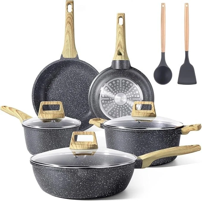【Enjoy Healthy & Easy Cooking】Feature top quality harder granite coating with 10x Ultra non-stick performance, Non-toxic and PFOS & PFOA-free, SGS Approved, nonstick cookware set ensures that your daily cooking is safer and healthier. Say goodbye to kitchen struggles and hello to a stylish, efficient cooking experience! 【Super Non-stick & Effortless Cleaning】Our non stick pots and pan set has a ultra smooth and highly non-stick surface that allows eggs to slide off the frying pan effortlessly with nothing sticks. Making your cleaning a breeze, just wipe with paper towels or rinse with water, less CO2 emissions and less water waste. 【Versatile Cookware Set】10pcs cookware set non stick meets all of your everyday cooking needs and cooking ideas. You will get: 8inch nonstick skillet, 9.5inch nonstick frying pan, 4.5Qt saute pan with lid, 1.5Qt sauce pan with lid, 4.5Qt casserole with lid, and 2 silicone cooking utensils. 【Perfect for All Stoves】Cast aluminum construction pots and pans set heat up quickly and evenly. Highly magnetically conductive stainless steel bases make our non-stick induction cookware sets perfect for use on any stovetop. including gas, ceramic, electric, and induction stovetops. 【Reliable Service & Guarantee】The aesthetic looking and durable construction make granite cookware set stand out, cookware 100% passes strict multi inspection process. In case you receive defect items caused by delivery or if any problems while using our product, please feel free to contact us.