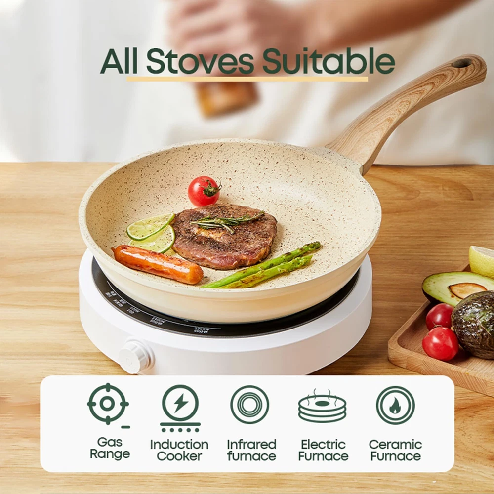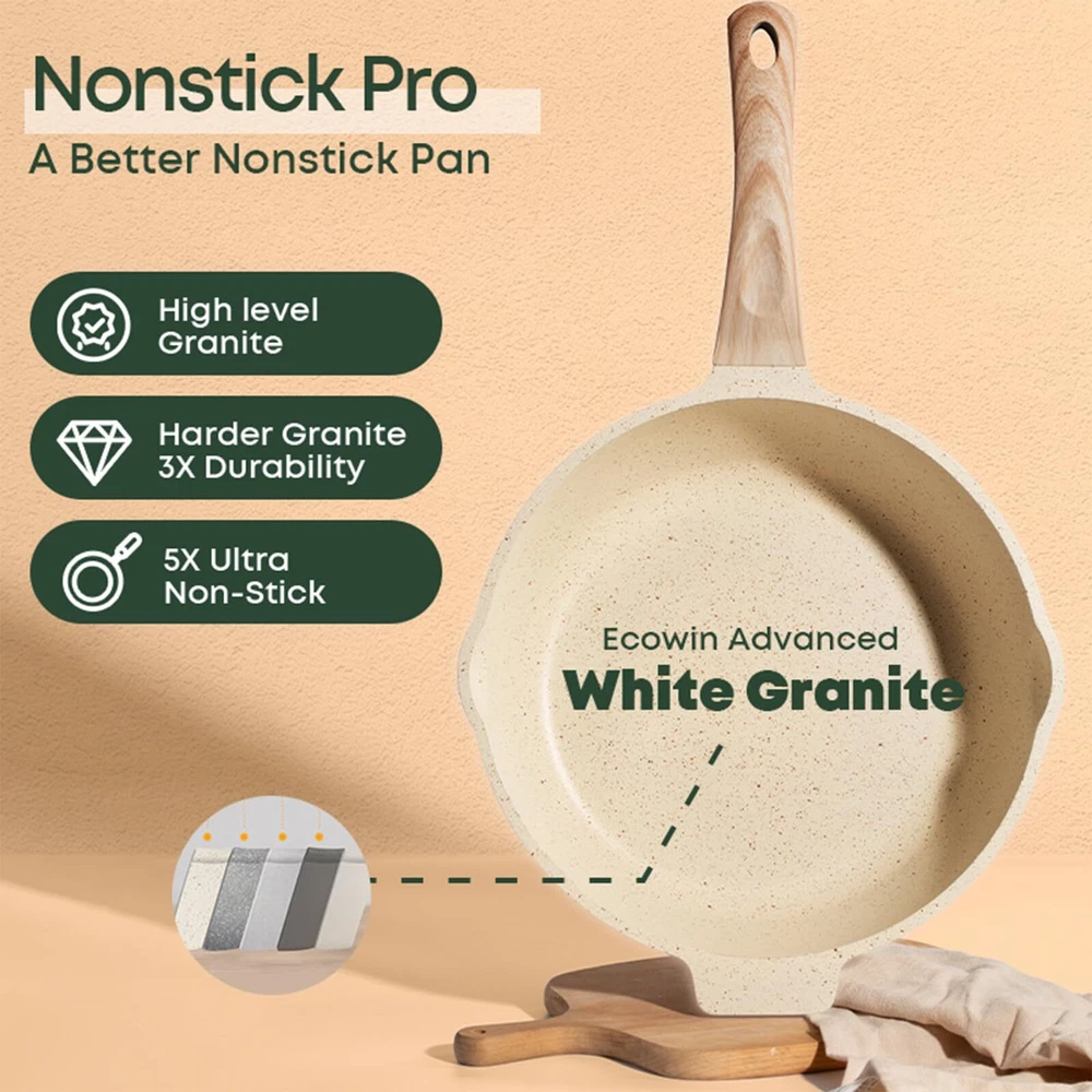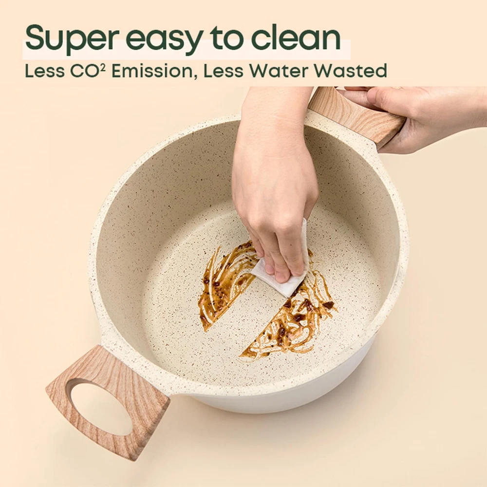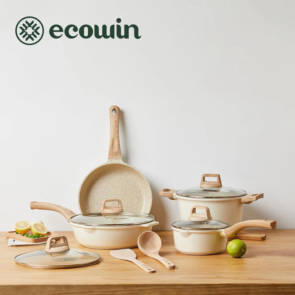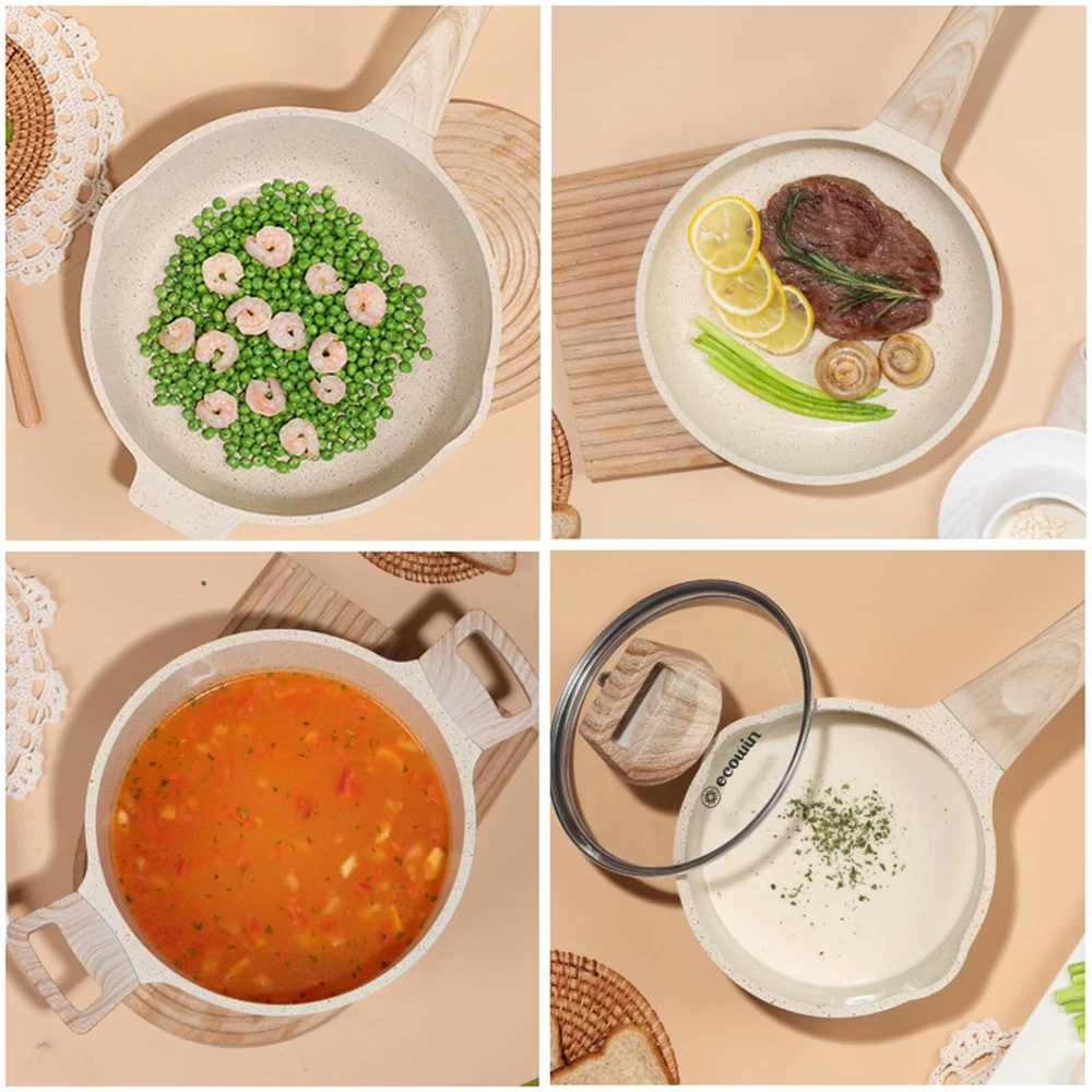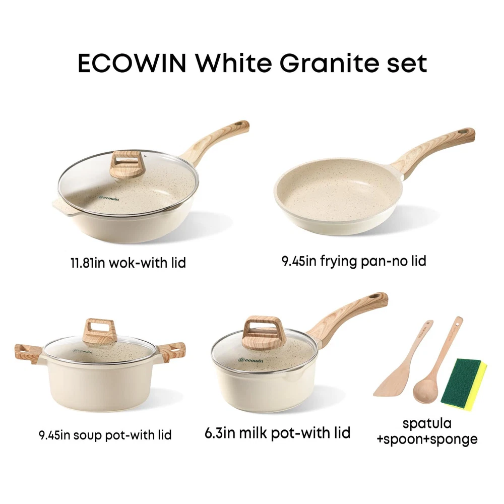 SUPER NONSTICK - These pots and pans set are smooth and highly nonstick, allowing eggs to effortlessly slide off the pan. This nonstick cookware set not only simplifies cooking but also adds more flavor to your food with less oil. INDUCTION - Stainless steel bottom makes this kitchen cookware sets suitable for all stovetops and ensures durability. The cast aluminum construction enables the pan to heat up quickly and evenly, maintaining consistent heat. EASY TO CLEAN - The Cooking Set simply wipe with a paper towel or rinse with water, hand washing is recommended as it cleans effortlessly. Dishwasher and Oven Safe, PFOA Free Pots and Pans Cookware Set 10Pcs Including 9.5Inch Frying Pan, 11.8Inch Deep Frying Pan with Lid, 6.3Inch milk Pot with Lid, 9.5Inch Soup Pot with Lid, Sponge And Woodle Spatula and Spoon Service & -Your purchase is guaranteed. Each piece of our products passes strict multi inspection process. 30-day and 12-month .
